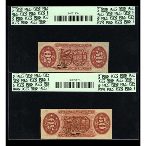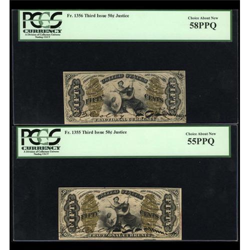 <B>A Pair of Hand Signed Red Back Justices.</B></I> <B>Fr. 1355 50c</B></I> Justice No Back Surcharges <B>PCGS</B></I> <B>55PPQ</B></I>, and <B>Fr. 1356 50c </B></I>Justice with the A-2-6-5 Back Surcharges <B>PCGS</B></I> <B>58PPQ</B></I>.<BR><I>From The Thomas M. Flynn Collection</B></I><BR><BR><b>Shipping:</b> Coins & Currency (<a target="_blank" href="http://www.heritageauctions.com/common/shipping.php">view shipping information</a>)