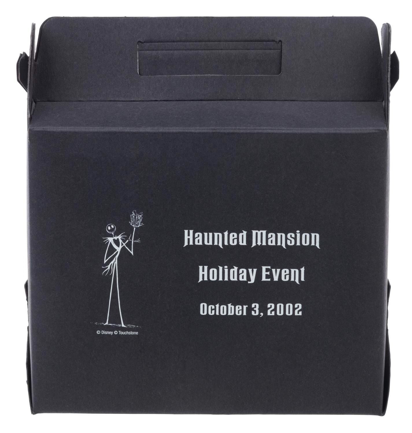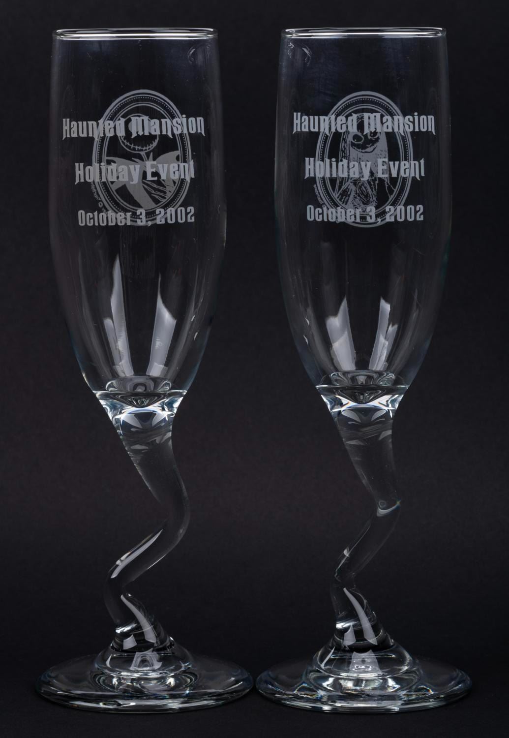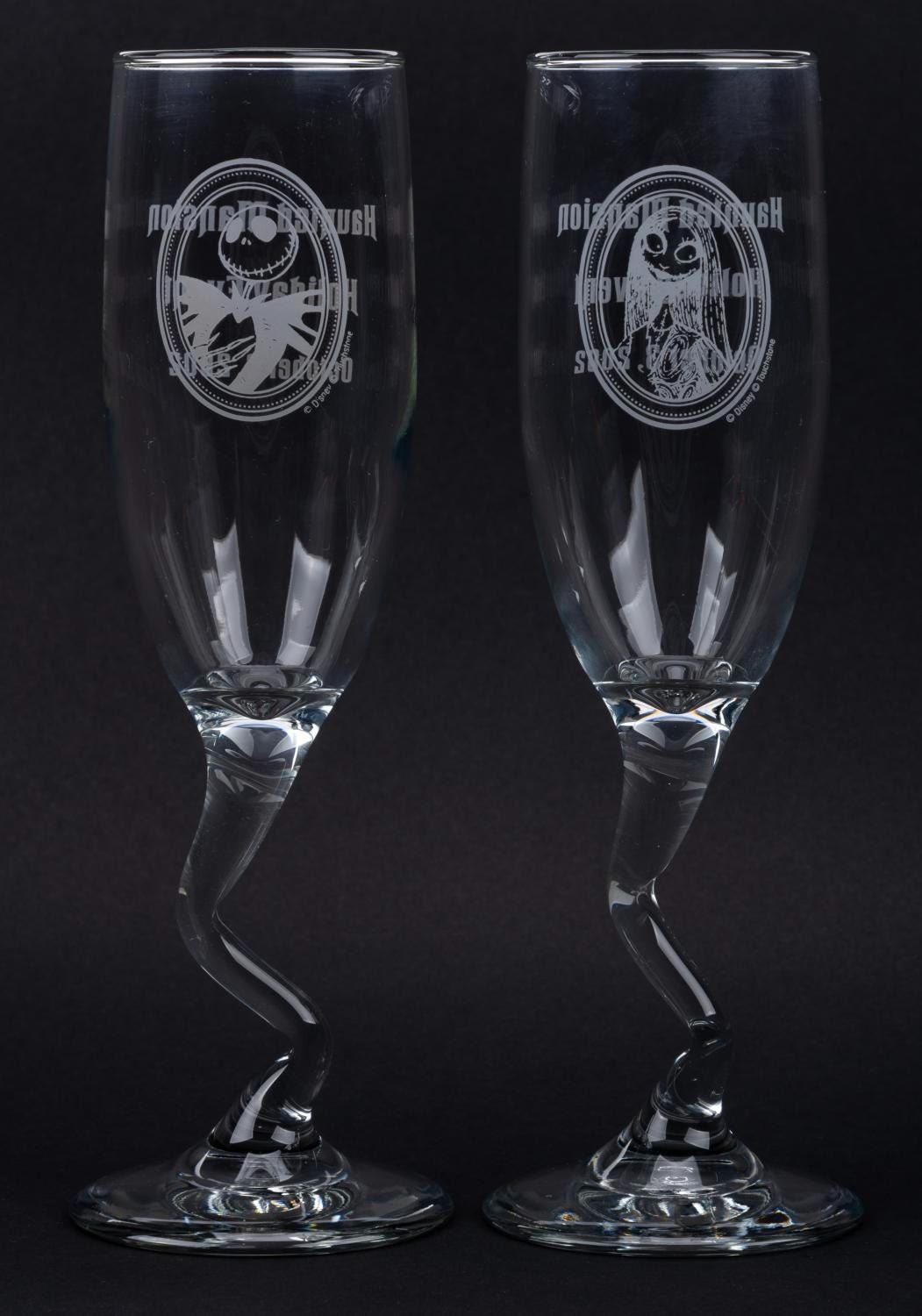 (Disneyland, 2002) A pair of glasses etched with portraits of Jack Skellington and Sally, gifted to Guests at the Ghoulish Dining Experience during the second Haunted Mansion Holiday event in 2002. The glasses have twisted stems, and come in an event-themed cardboard carrying case. Each standing 8" tall, the glasses are in fine condition.