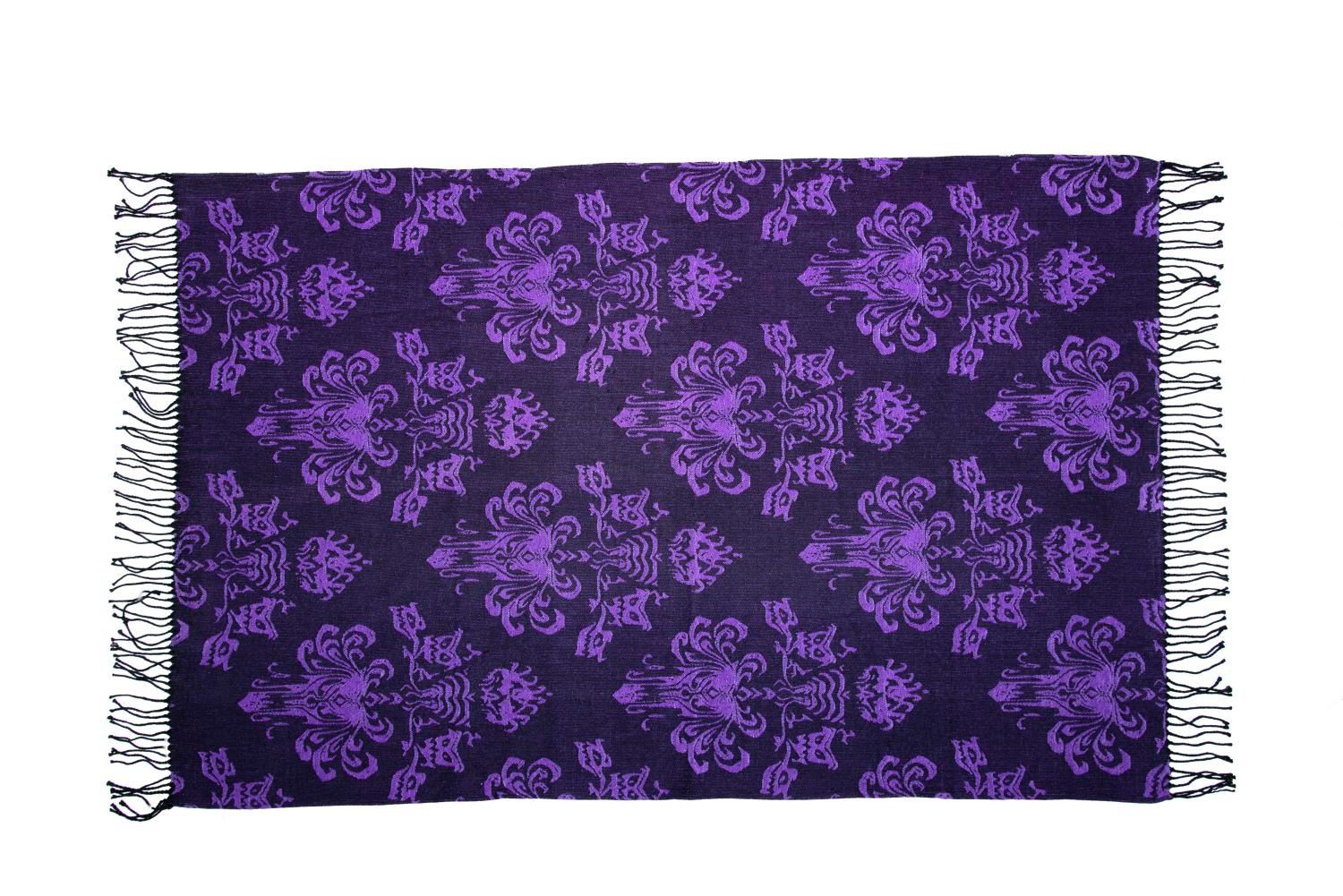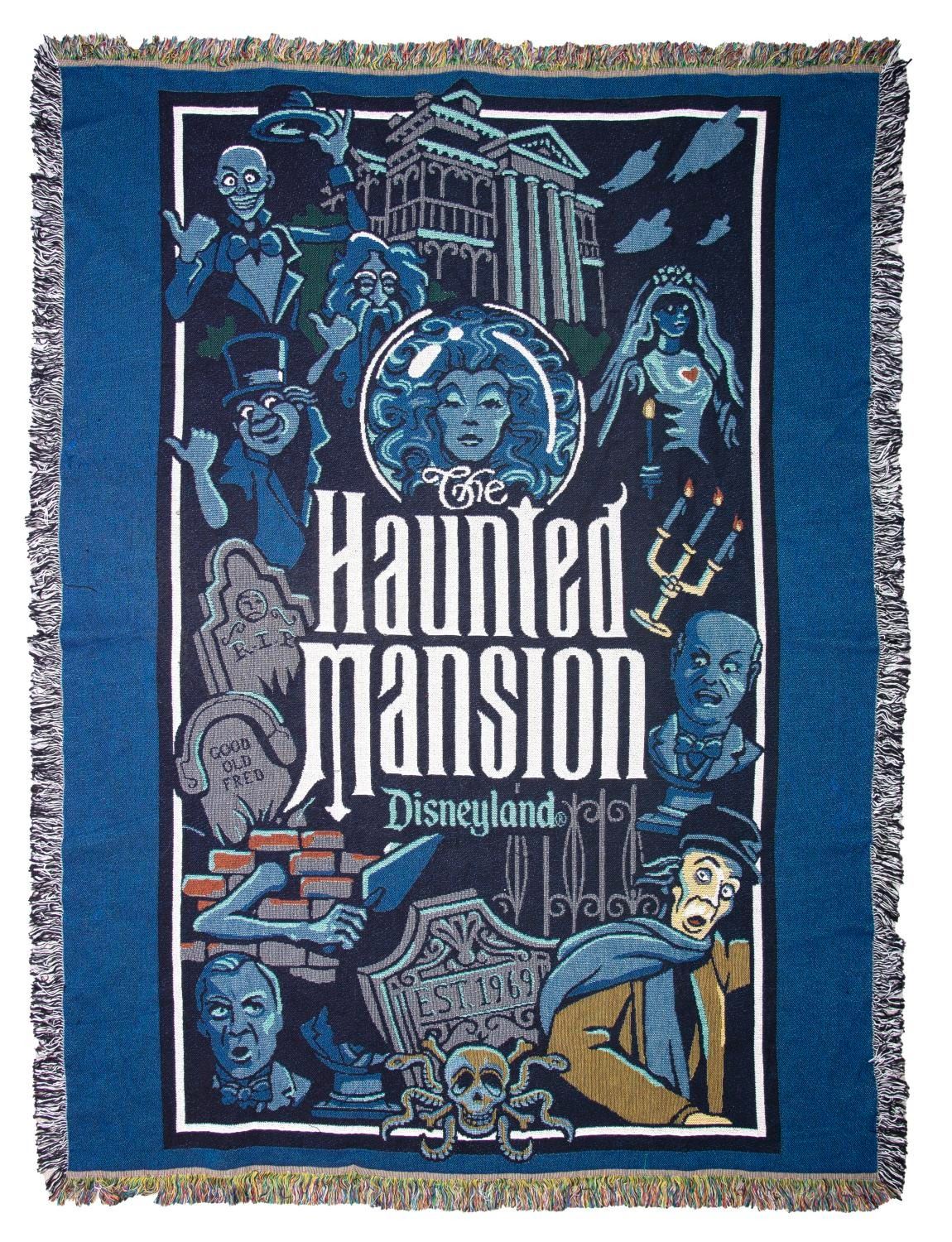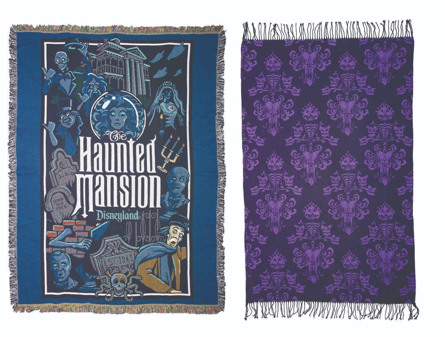 (Disney Parks, 2000s) A Pair of Haunted Mansion Throw Blankets featuring the purple wallpaper motif and characters from the attraction. Measuring 60" x 37.5" and 75" x 54", the blankets are in very good and fine condition, one with its original tags attached, the other with few signs of wear from handling and use.