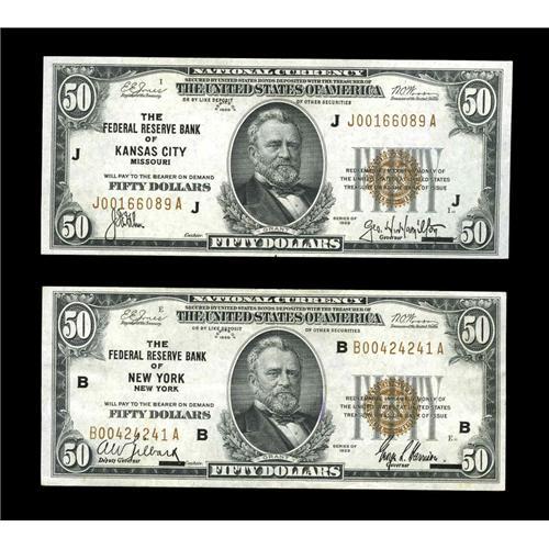 <B>A Pair of High Grade $50 Federal Reserve Bank Notes</B></I><BR>Fr. 1880-B $50 1929 FRBN <B>Extremely Fine</B></I><BR>Fr. 1880-J $50 1929 FRBN <B>About Uncirculated</B></I>.<BR>Two exceptionally nice looking high end circulated notes.<BR>