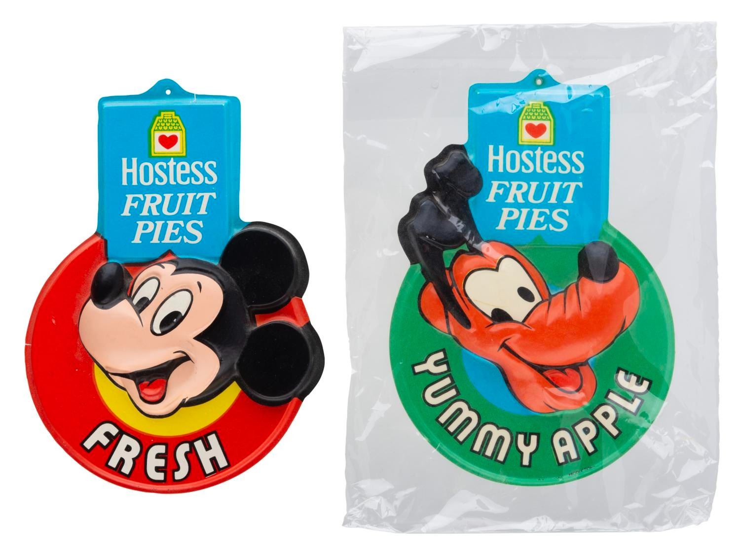 (Hostess, 1970s) A pair of story display signs featuring Mickey and Pluto for Hostess Pies. Measuring 5” x 7” the displays are in good condition with light soiling and minor edge cracking.
