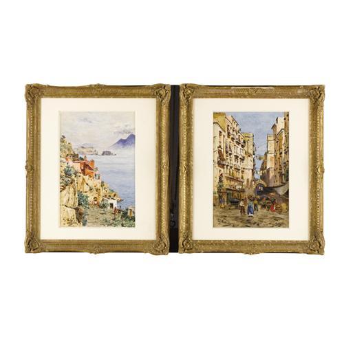 <B>A Pair of Italian Genre Paintings</B></I><BR><BR>Felix Hollenberg, German<BR>1882<BR>Watercolor on paper<BR>Signed and dated: <I>Fritz Holbenberg/ 82/ Napoli</B></I><BR>13.5 inches x 9 inches (unframed)<BR><BR>A beautiful pair of watercolors depicting both coastal inhabitants and street merchants in Naples, Italy. Each matted in a giltwood frame. <B>Condition Report:</B> Good condition. Matted and framed in UV Plexiglass.<BR><BR><b>Shipping:</b> Requires 3rd Party Shipping (<a target="_blank" href="http://www.heritageauctions.com/common/shipping.php">view shipping information</a>)