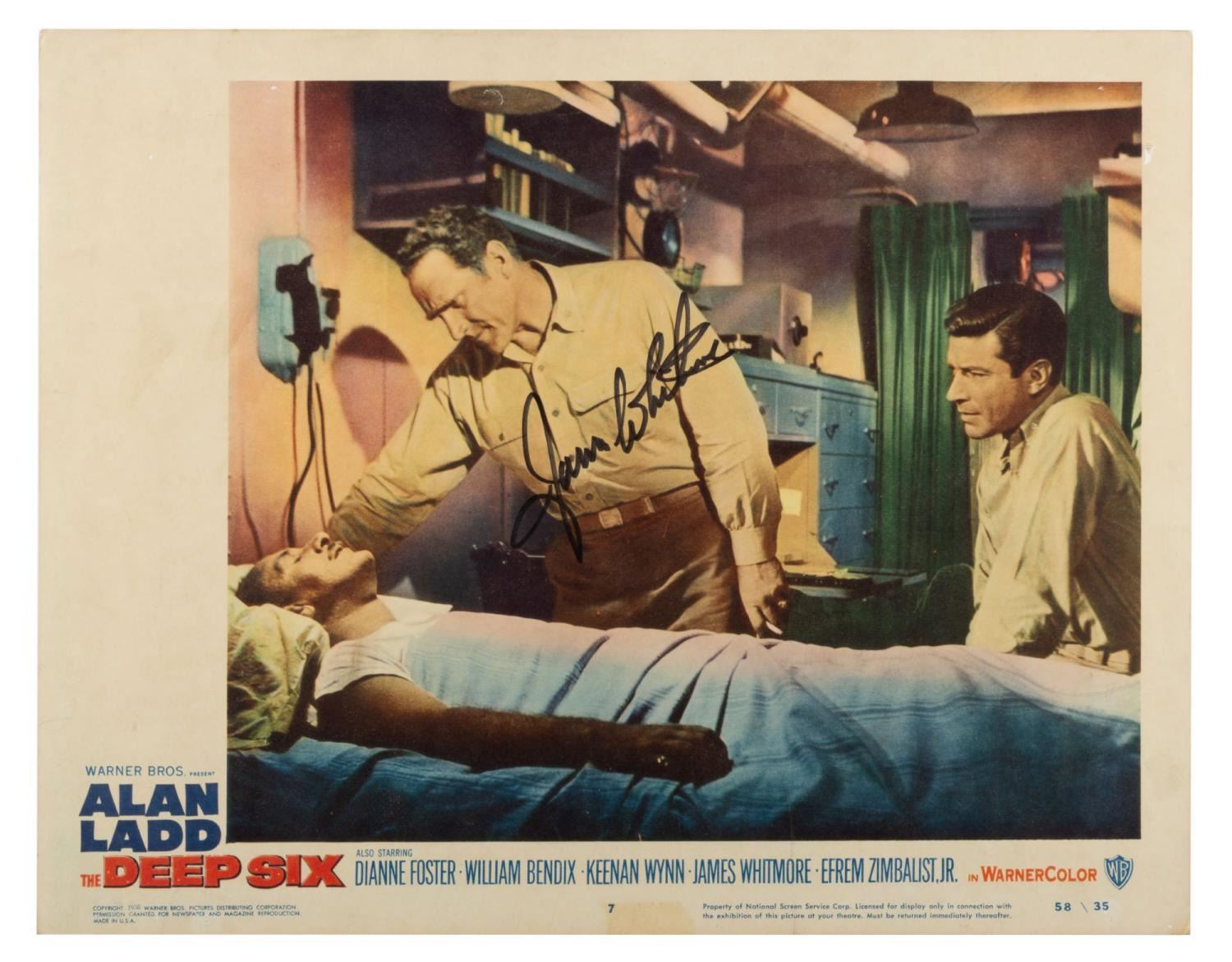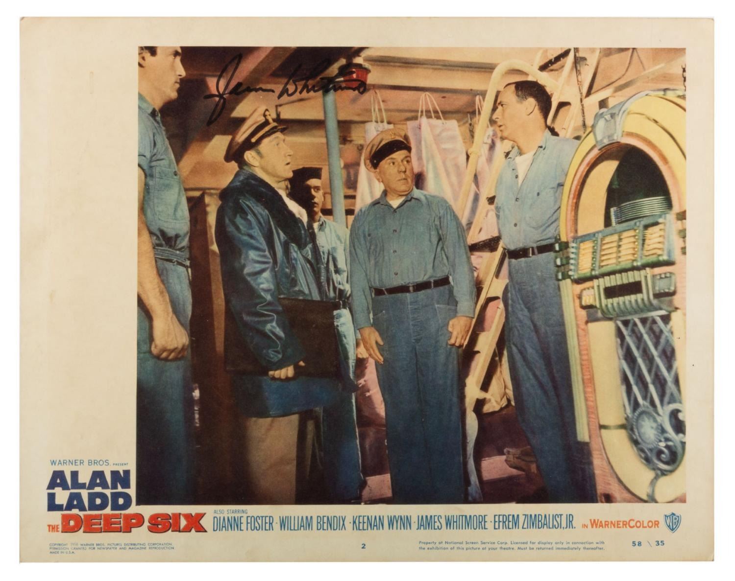 (Warner Bros., 1958) A pair of lobby cards for "Deep Six," signed by star James Whitmore. Measuring 11" x 14", the cards are in good condition with edge wear, discoloration, pin holes and light soiling.