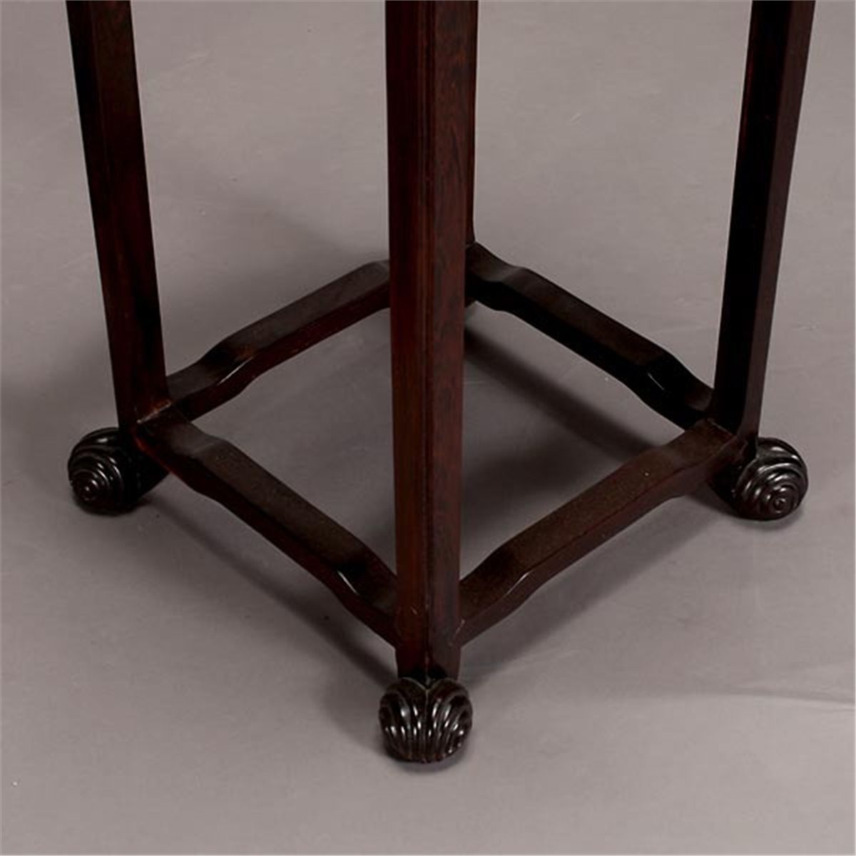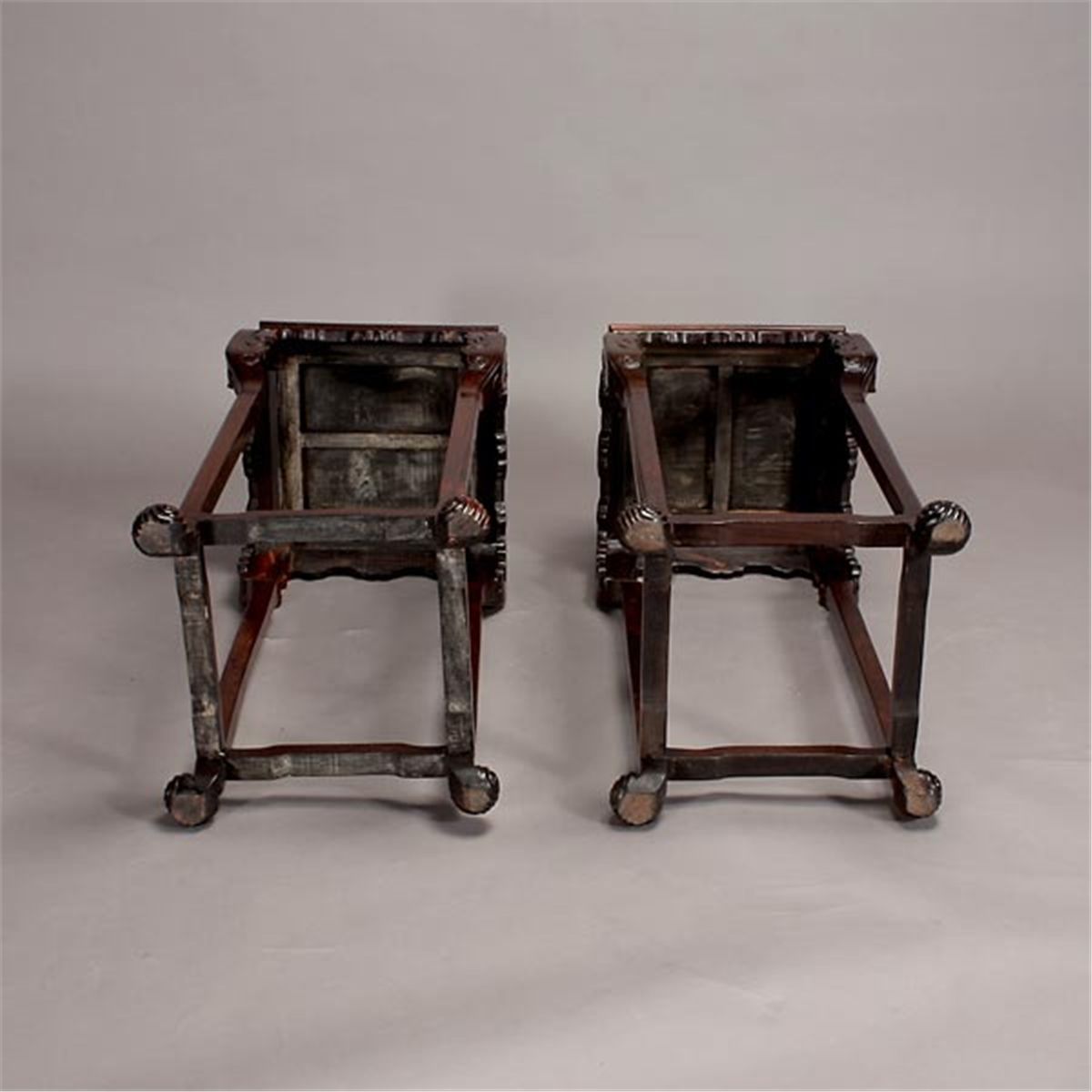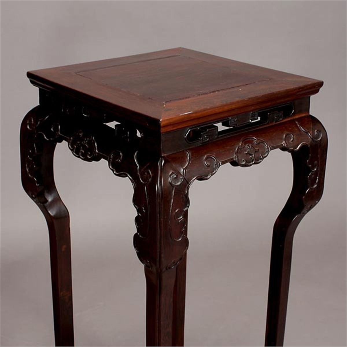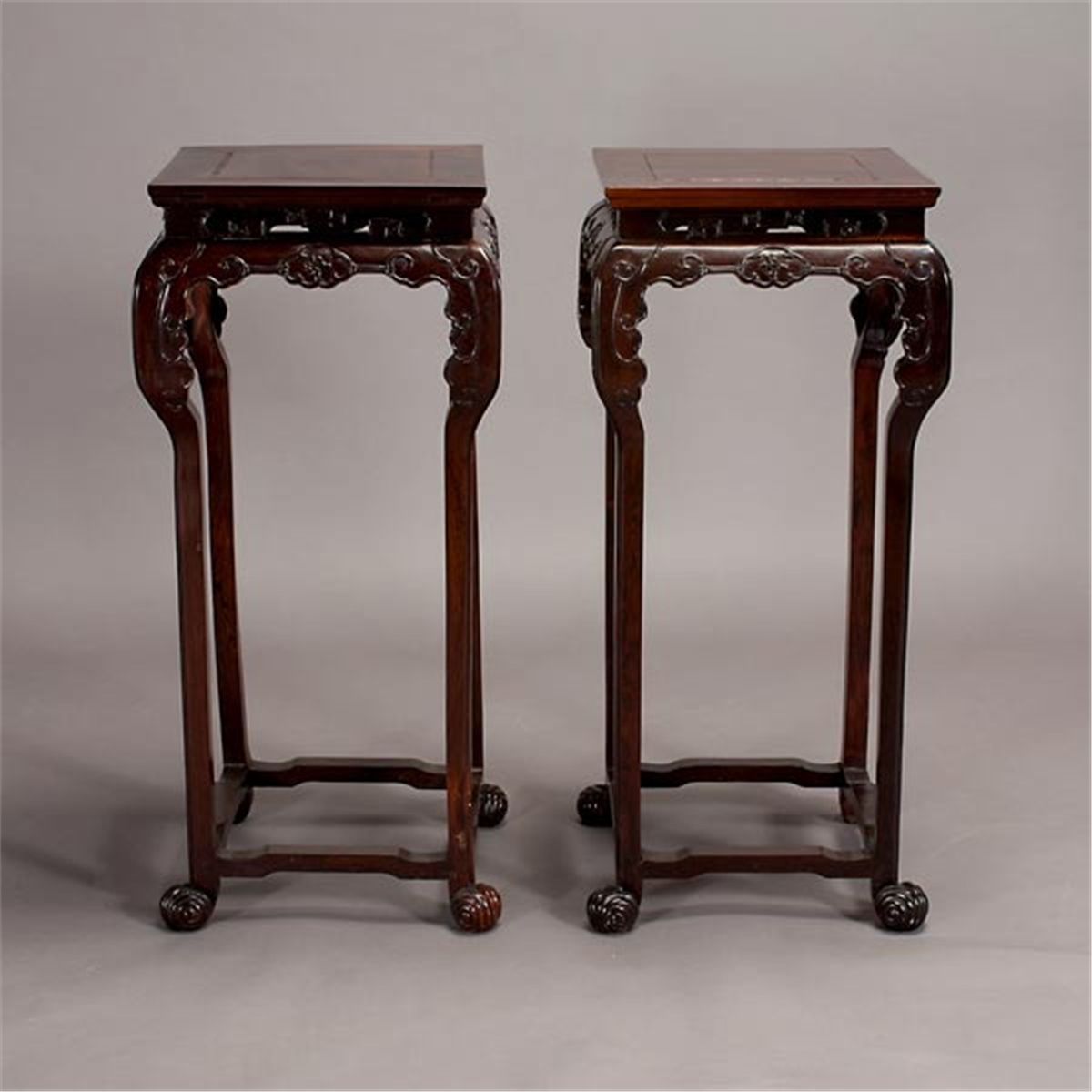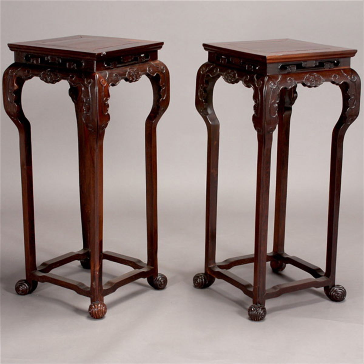 A Pair of Jichimu Stands, Each of tall and slender rectangular form, the single-panel tops flushed in a square frame above craved waists and aprons, the inward curing square section legs coined by stepped horizontal stretchers and scroll-form feet. 38 1/2 x 16 x 16 (98 x 40.5 x 40.5 cm)