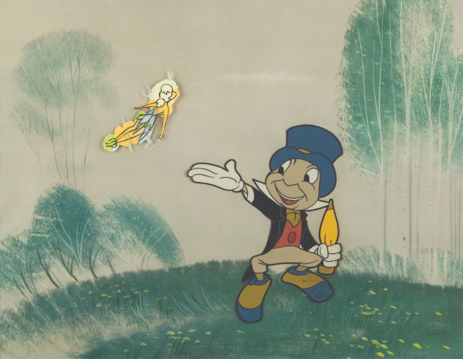 (Disney, 1960s-70s) A pair of original Jiminy Cricket and Tinker Bell production cels from unknown Disney Television productions. The cels were sold at the Art Corner in Disneyland, trimmed and attached to the original backing board with the Art Corner’s gold label on the reverse. Tinker Bell has an image size of 1.75” x 1.75” and Jiminy has an image size of 4” x 5” on a 9” x 11.5” visible cel. The entire framed and matted piece measures 18.75” x 21”. The cel is in fair condition with paint cracks, light warping, and heavy paint bleed and water damage to Tink. The frame is in good condition with light wear and a sticker on the glass.