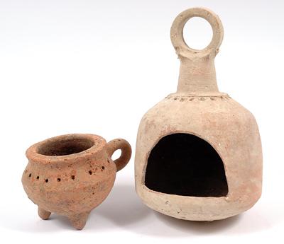 A Pair of Judean Terracotta Incense Burners. Consists of: Iron Age II, 1000-800 B.C. Incense Pot. Height 3½". Together with: Byzantine Period Lantern style burner. Height 9¾". Both in choice conditon. The second a museum quality piece. Lot of 2 items.