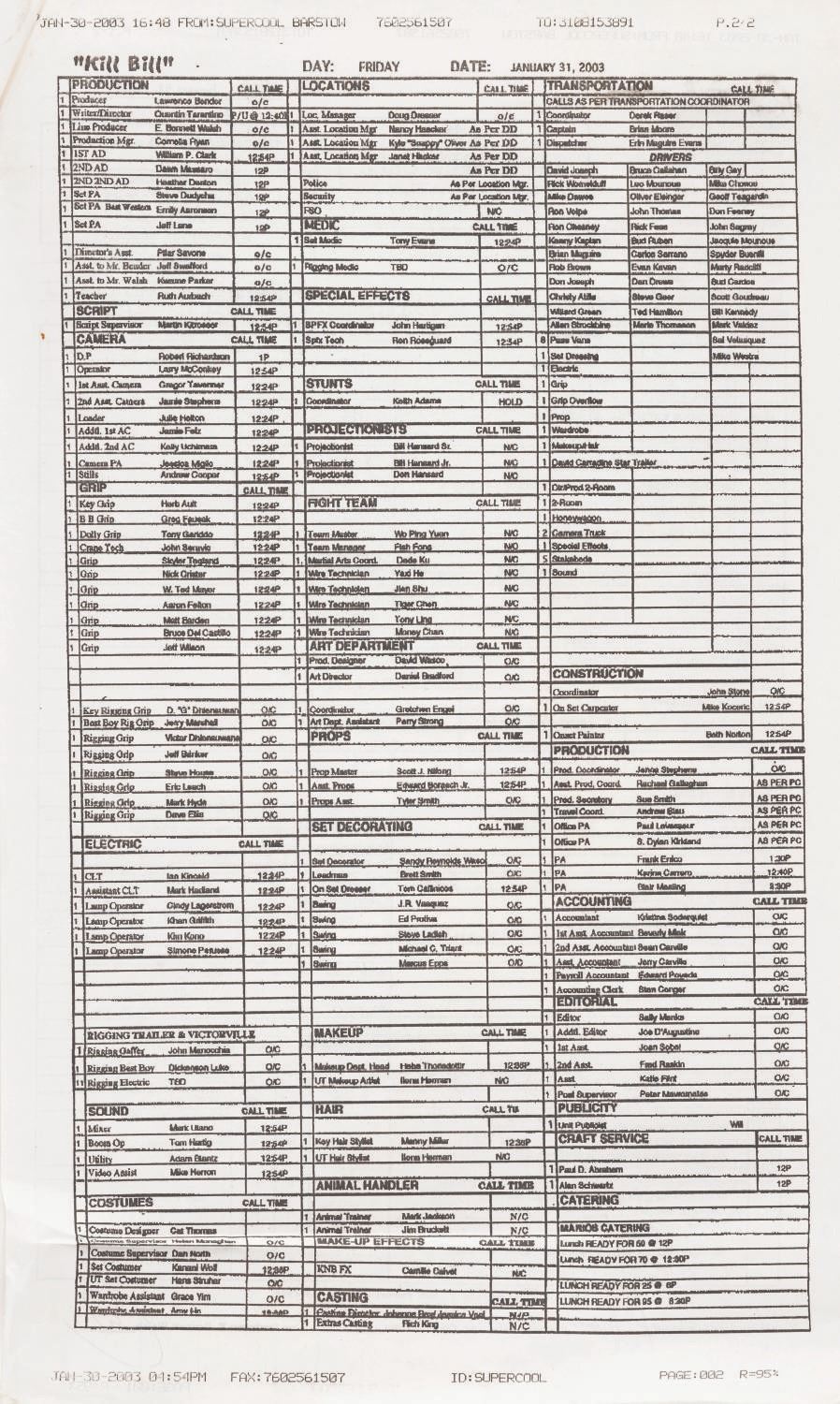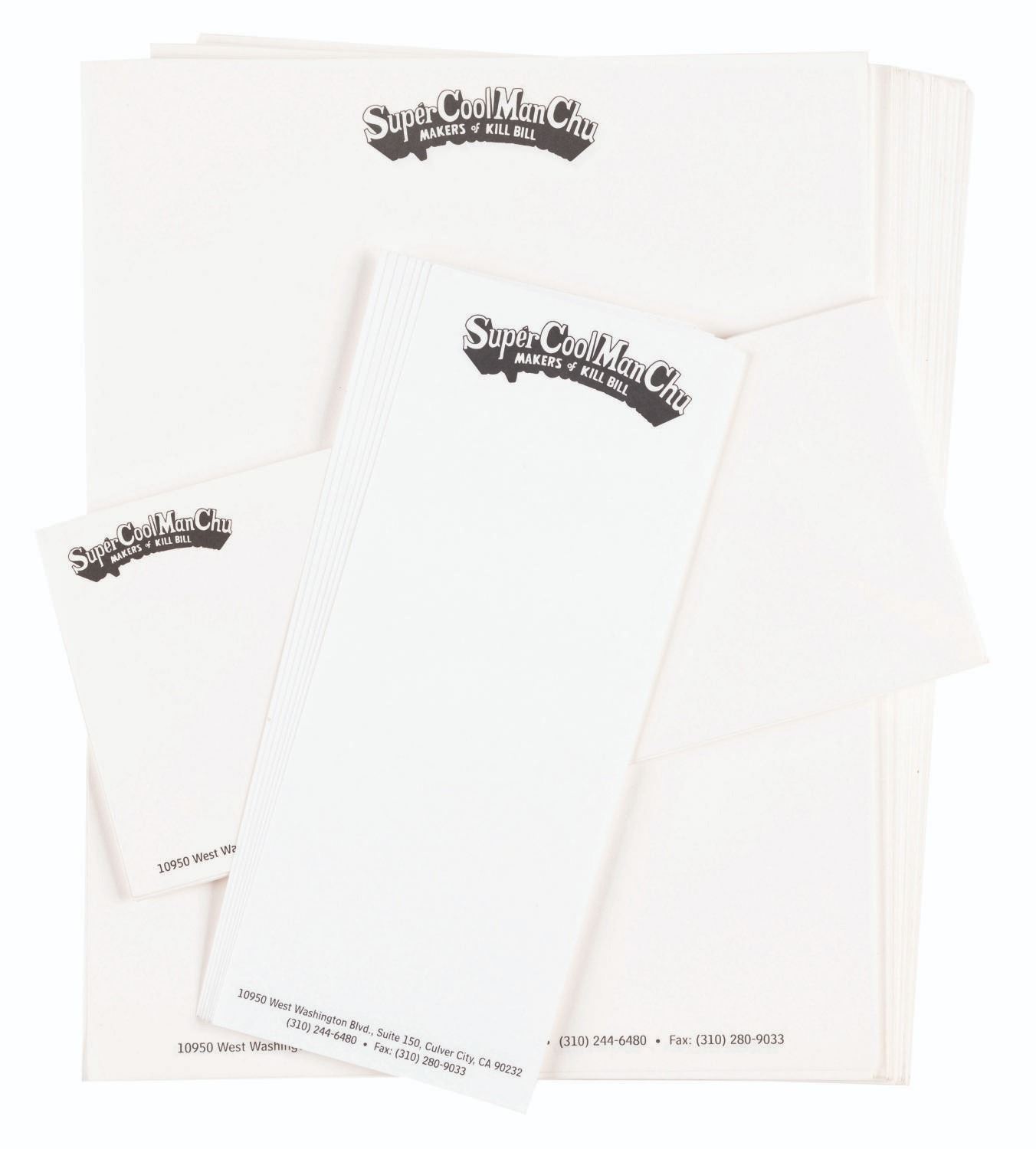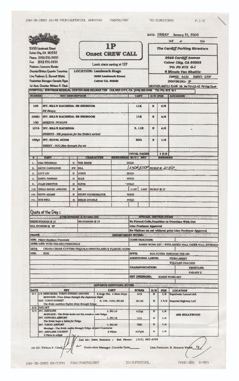 (Miramax, 2003) A pair of "Kill Bill” call sheets and stationery for Quentin Tarantino’s production company Super Cool Man Chu: Makers of Kill Bill. The call sheets are dated January 23 and 31, 2003 for scenes in the Pussywagon and Bill’s Hacienda, with principal actors, Uma Thurman and David Carradine. Included are 97 sheets of standard letter stationery, and seven note cards with envelopes. Ranging in size from the 8.5” x 3.5” note cards and envelopes to the 14” x 8.5” call sheets, the items are in good to fine condition with heavy edge wear and creasing to the call sheets from production use.
