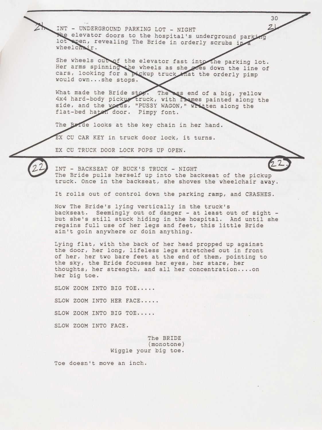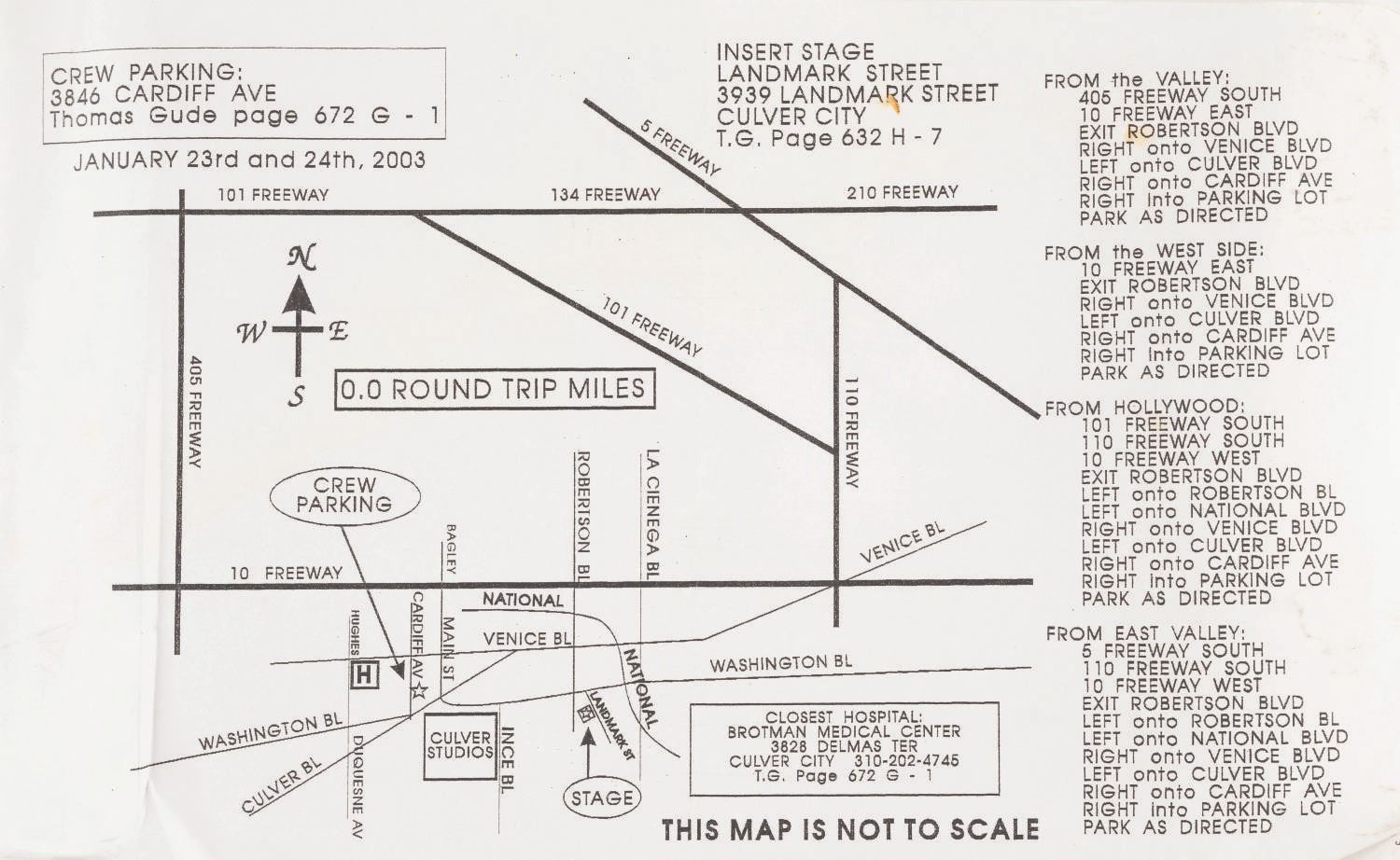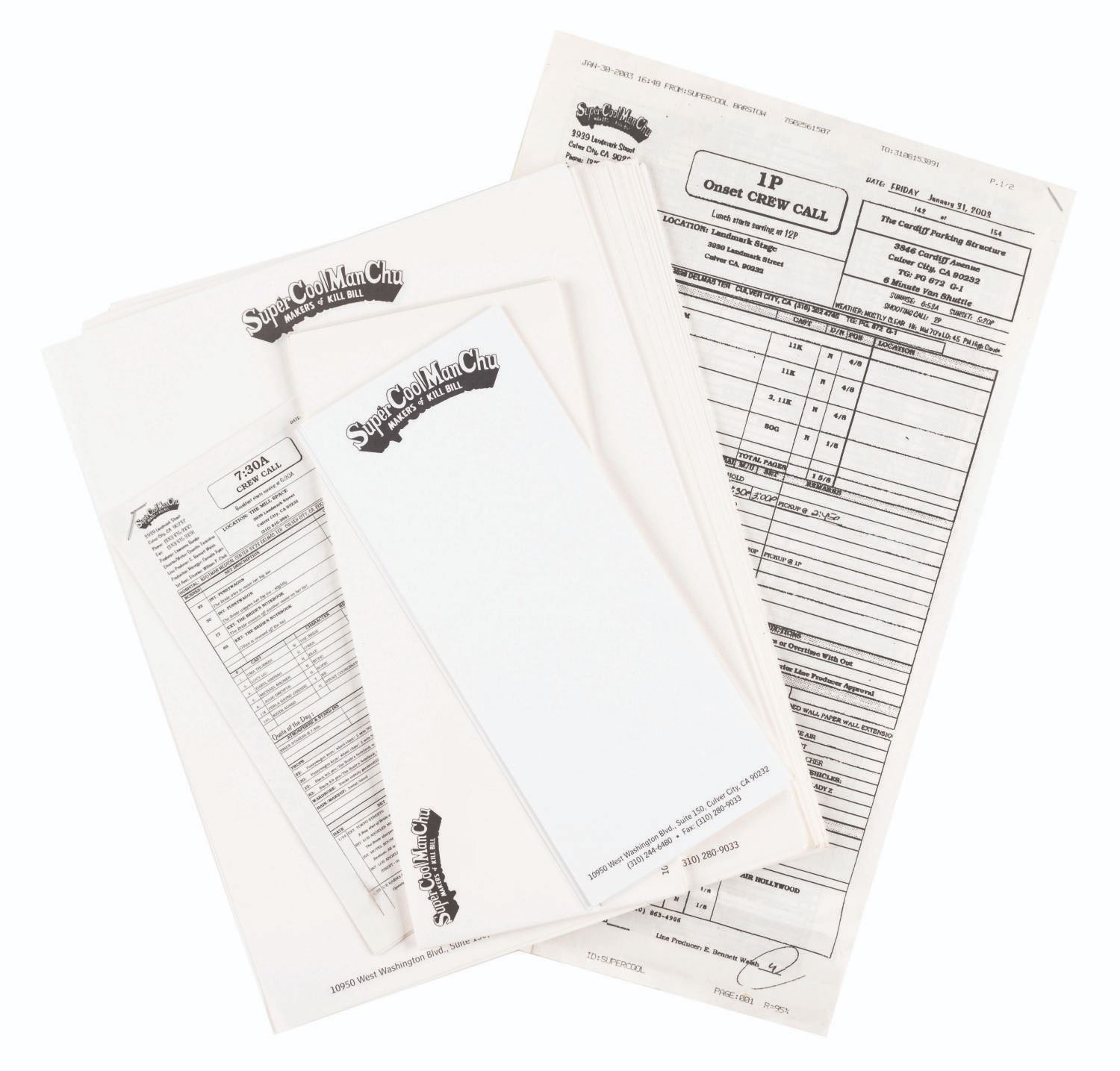 (Miramax, 2003) A pair of "Kill Bill” call sheets and stationery for Quentin Tarantino’s production company Super Cool Man Chu: Makers of Kill Bill. The call sheets are dated January 23 and 31, 2003 for scenes in the Pussywagon and Bill’s Hacienda, with principal actors, Uma Thurman and David Carradine. Included are 97 sheets of standard letter stationery, and seven note cards with envelopes. Ranging in size from the 8.5” x 3.5” note cards and envelopes to the 14” x 8.5” call sheets, the items are in good to fine condition with heavy edge wear and creasing to the call sheets from production use.
