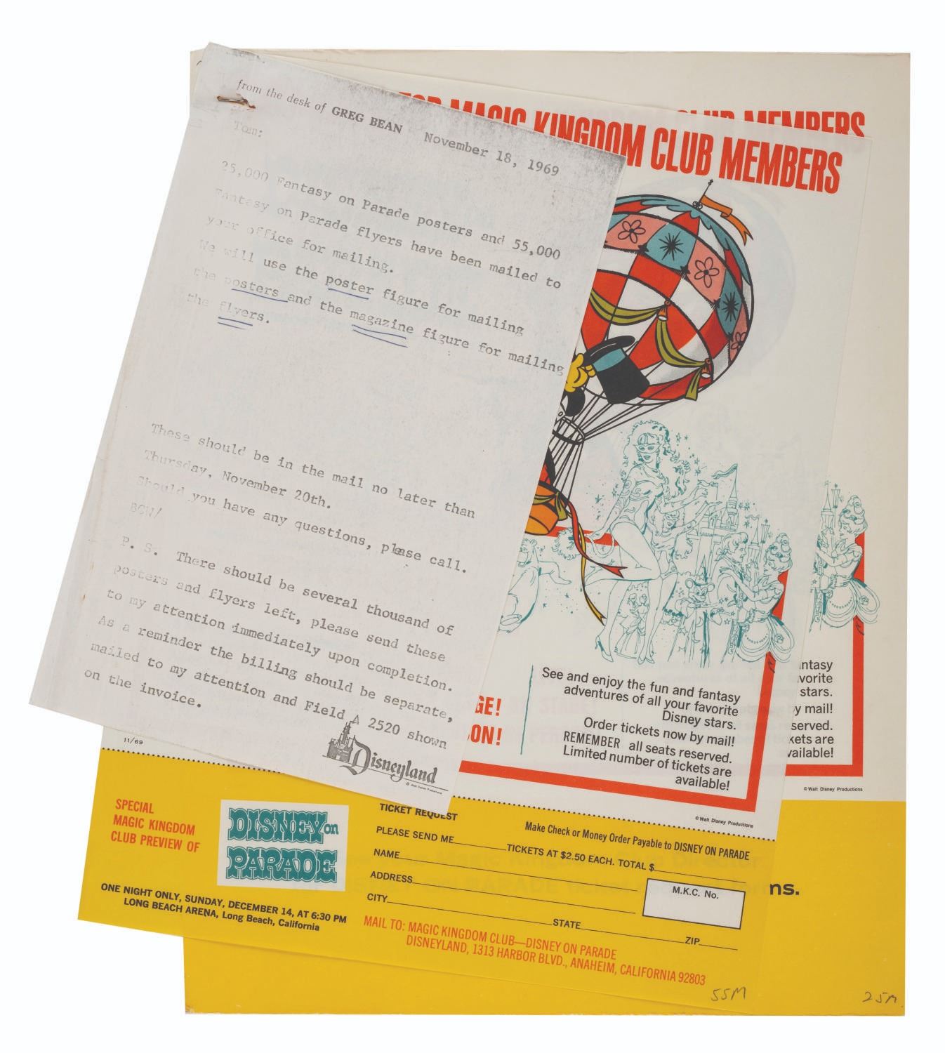 (Disneyland, 1969) A pair of Magic Kingdom Club Disney on Parade Posters. These mini-posters promoted the Special Magic Kingdom Club Preview of Disney on Parade and were mailed to Magic Kingdom Club Members. The posters retain a memo regarding the distribution of this flier from Greg Bean in the Disneyland Advertising Department. Measuring 9” x 12”, the posters are in very good condition with light wear to edges and corners.