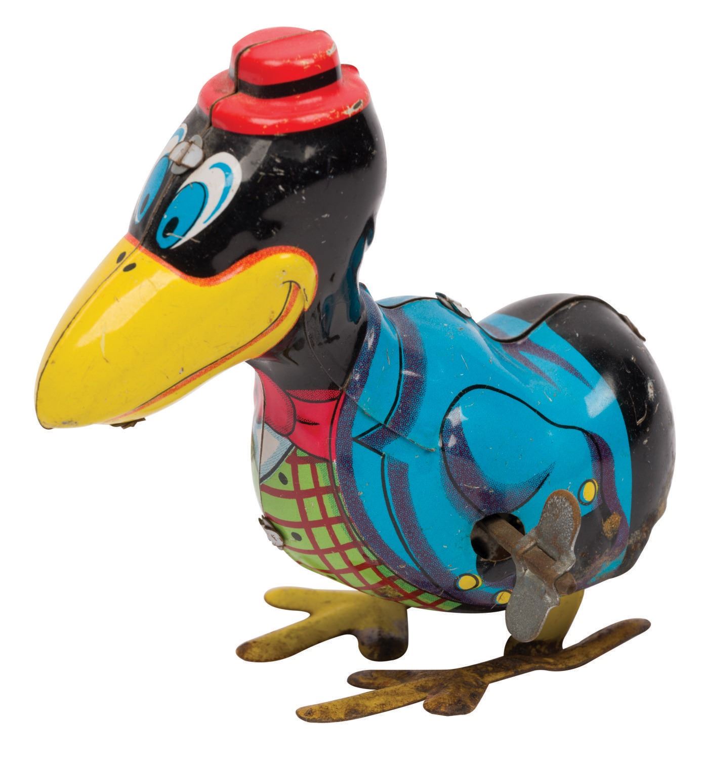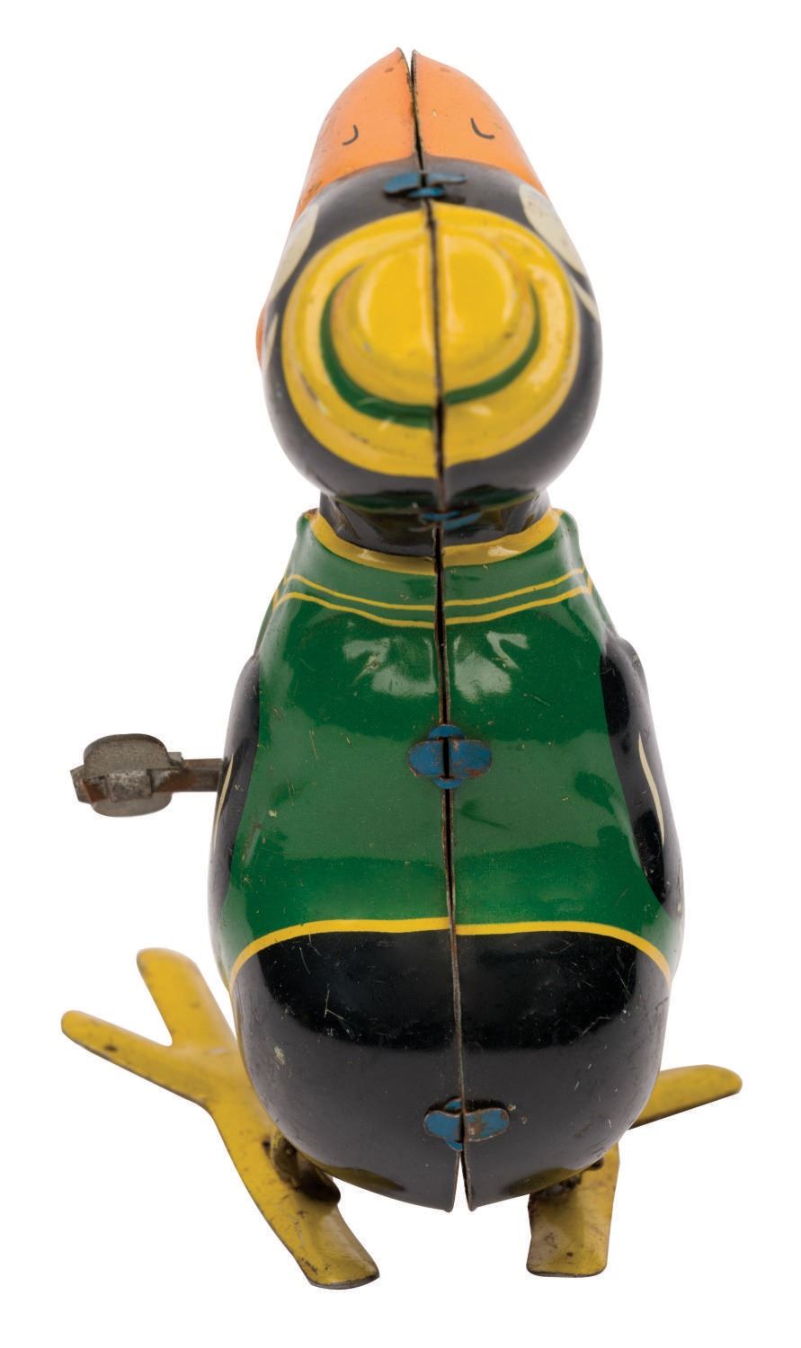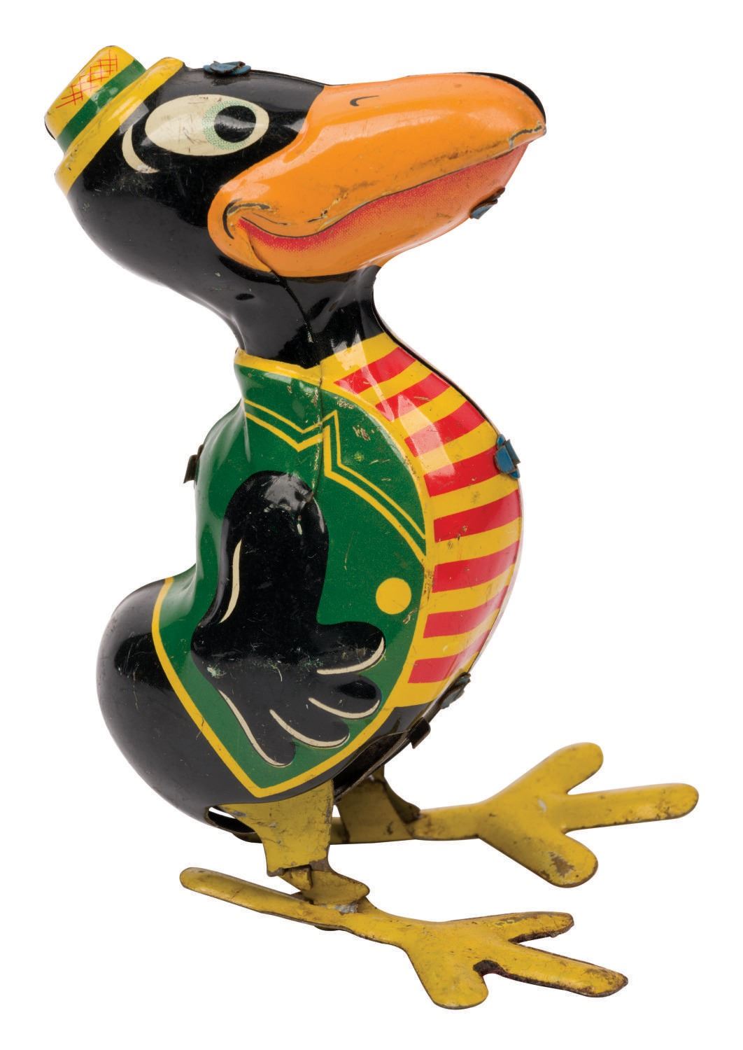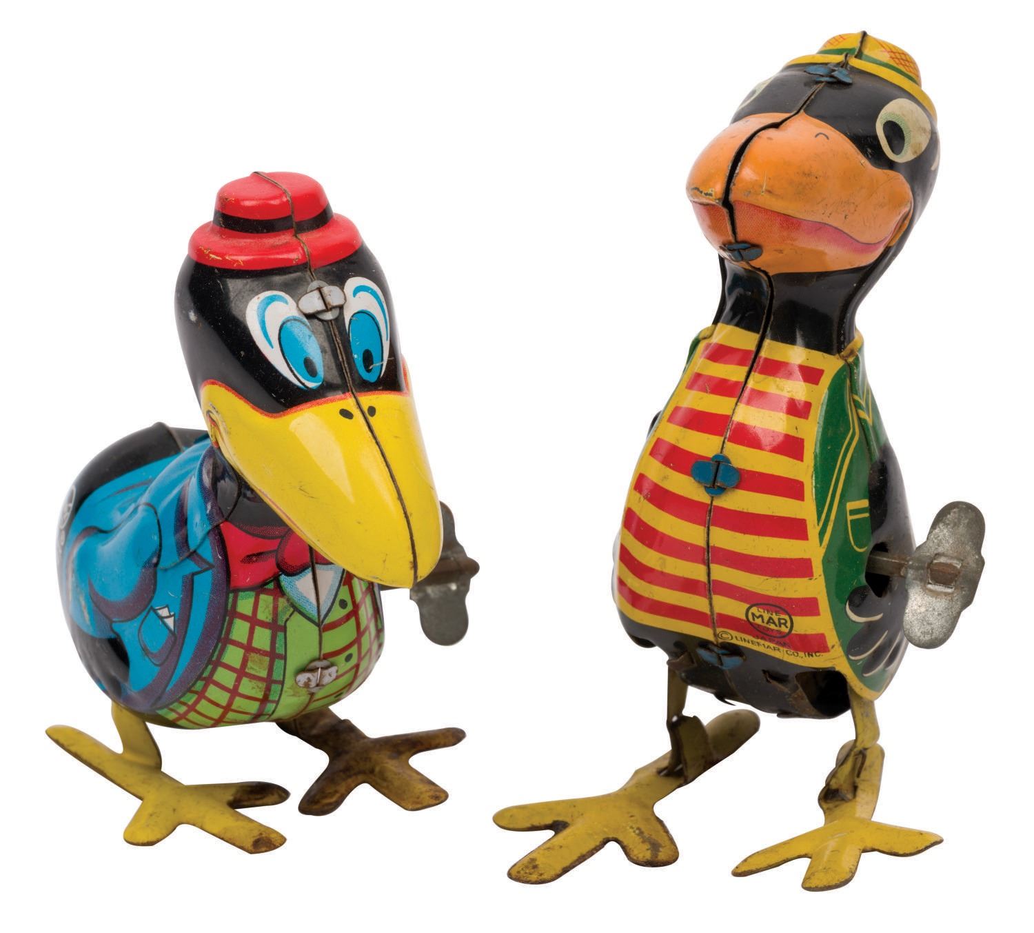 (Marx, 1960s) A pair of Cary the Crow wind-up toys produced by Marx Toys in the 1960s. The tin litho toys stand 3.5" and 4" tall and feature an internal wind-up mechanism with built-in key. When wound the crows hop around in random directions. Both are in good condition with rust and wear evident around the feet. When wound, both work intermittently and need service.