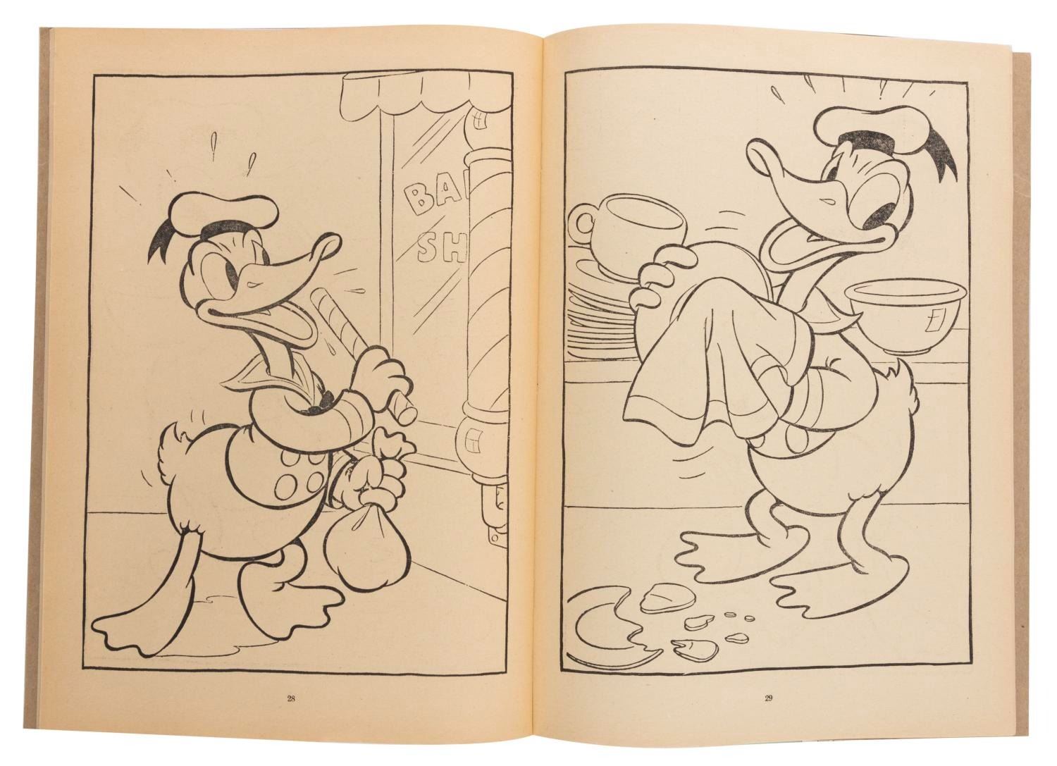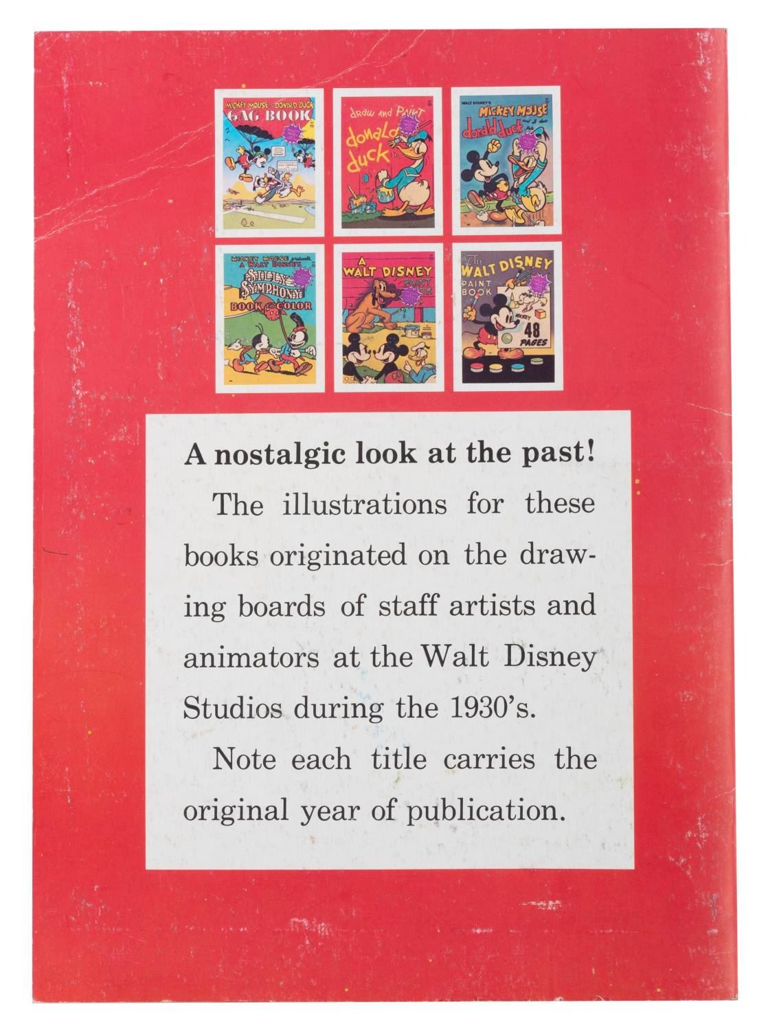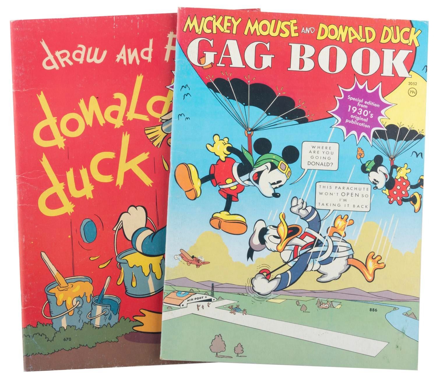 (Whitman, 1970s) A pair of reproduction Disney coloring and gag books originally published by Whitman in the 1930s, including Mickey Mouse and Donald Duck Gag Book and Draw and Paint Donald Duck. Measuring 10.75" x 15" each, the books are in good condition with creasing, soiling, scuffing, edge wear, and one book with a torn page.