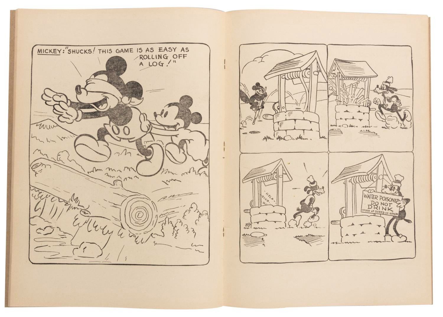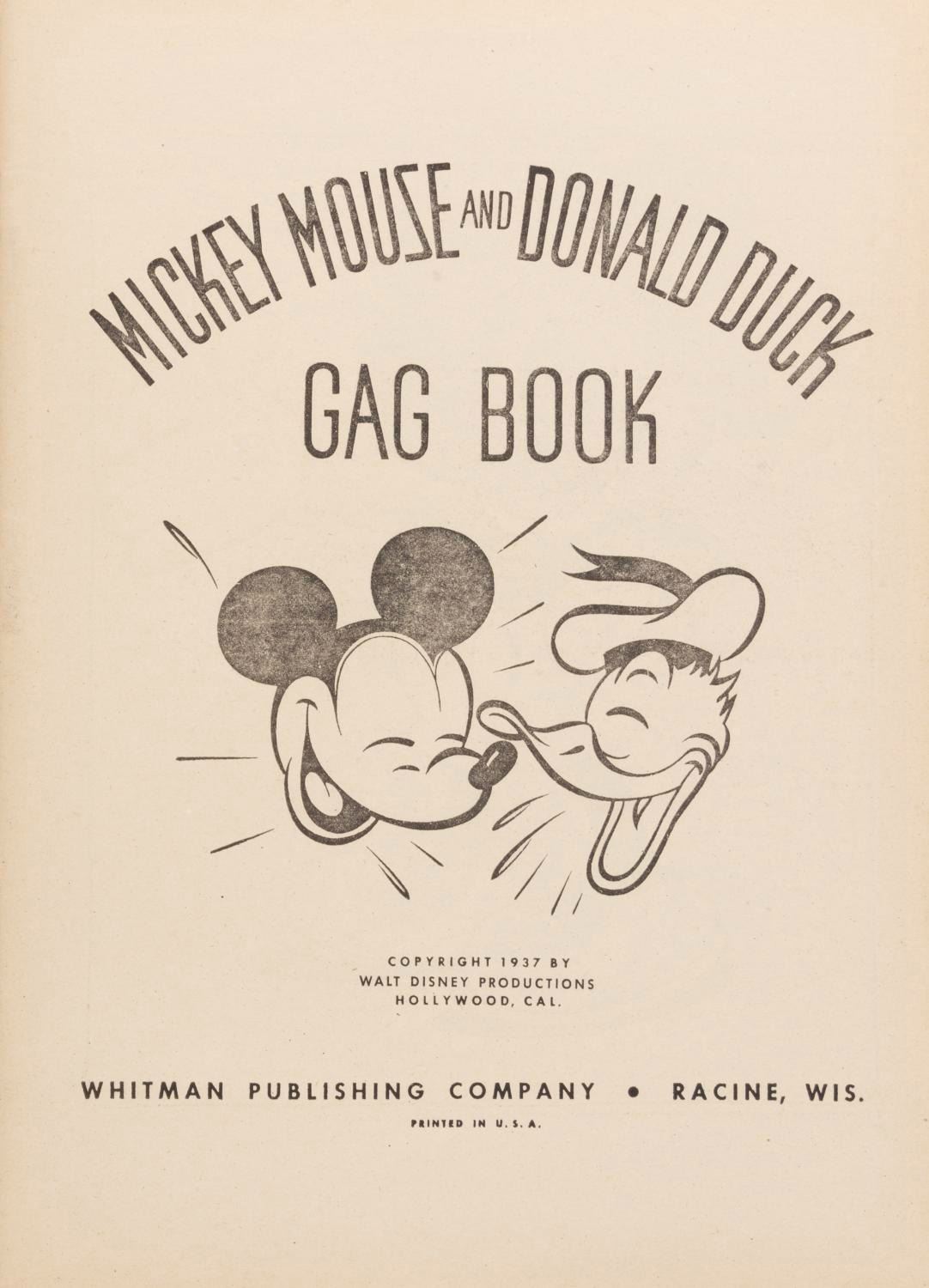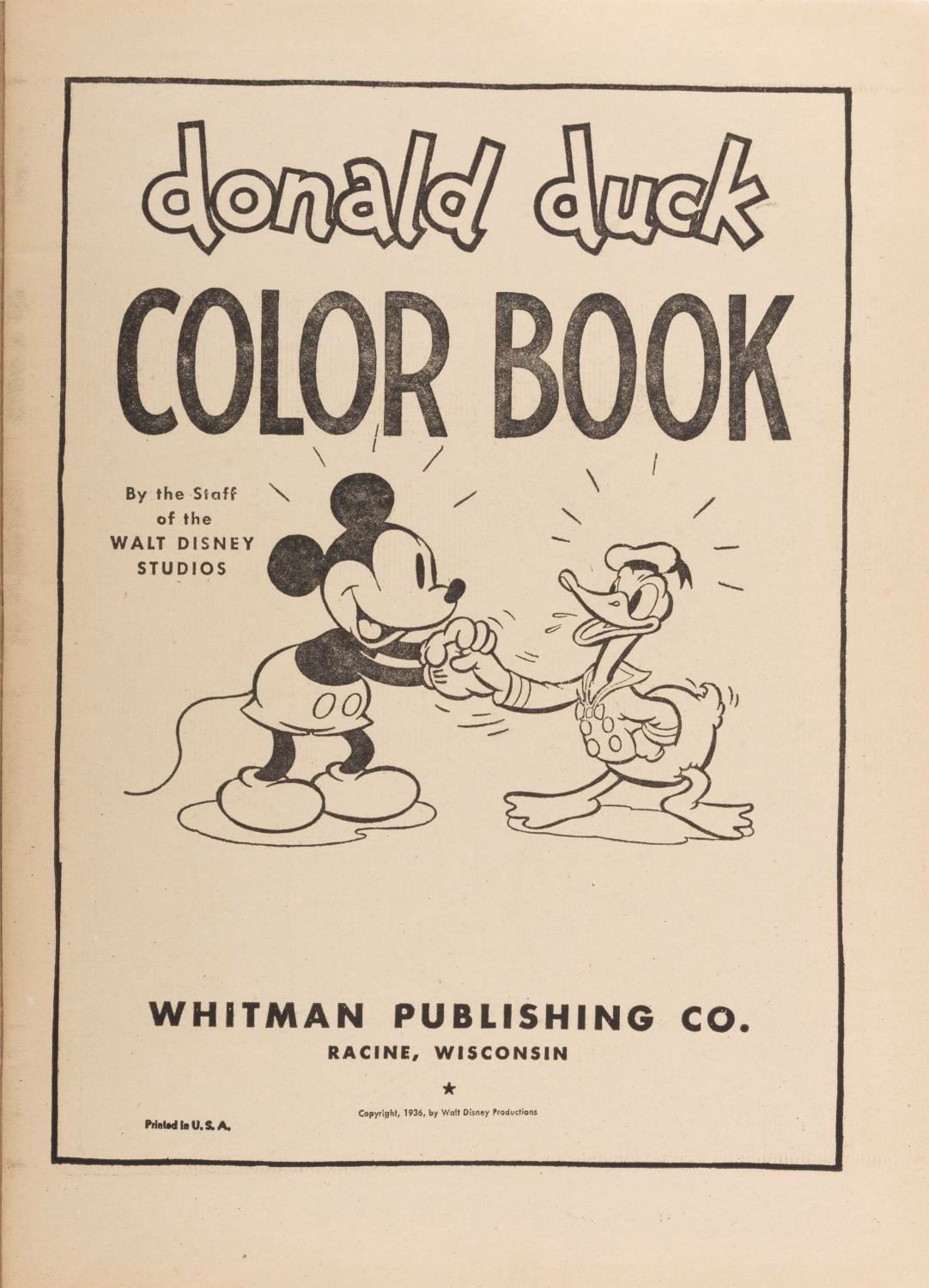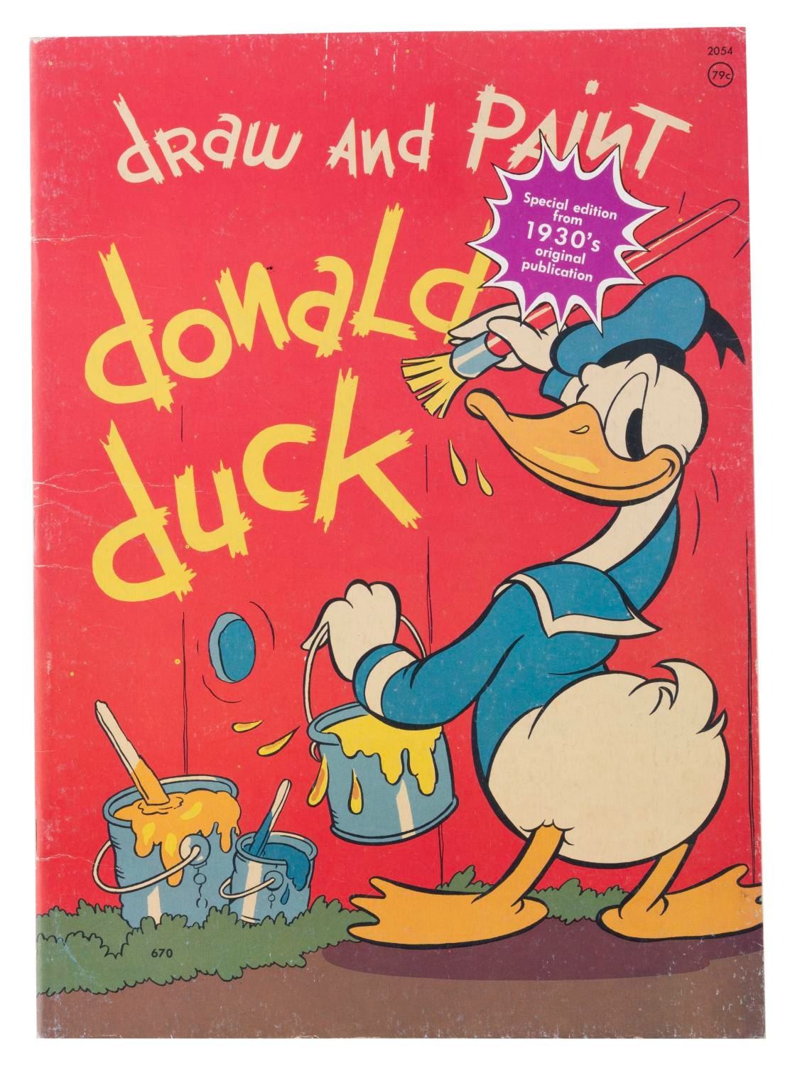 (Whitman, 1970s) A pair of reproduction Disney coloring and gag books originally published by Whitman in the 1930s, including Mickey Mouse and Donald Duck Gag Book and Draw and Paint Donald Duck. Measuring 10.75" x 15" each, the books are in good condition with creasing, soiling, scuffing, edge wear, and one book with a torn page.