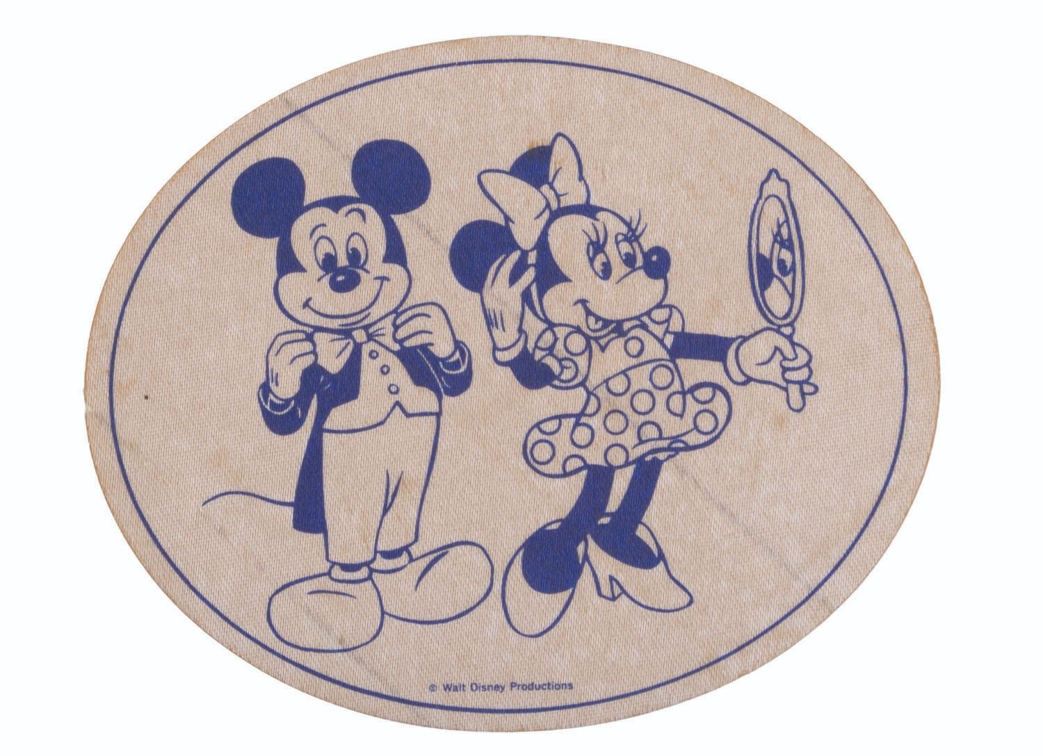 (Disneyland, 1980s-90s) A pair of fabric stickers featuring Mickey and Minnie Mouse. Measuring 3.5" x 4.25", the stickers are in good to very good condition with diagonal lines of discoloration caused by the adhesive backing.