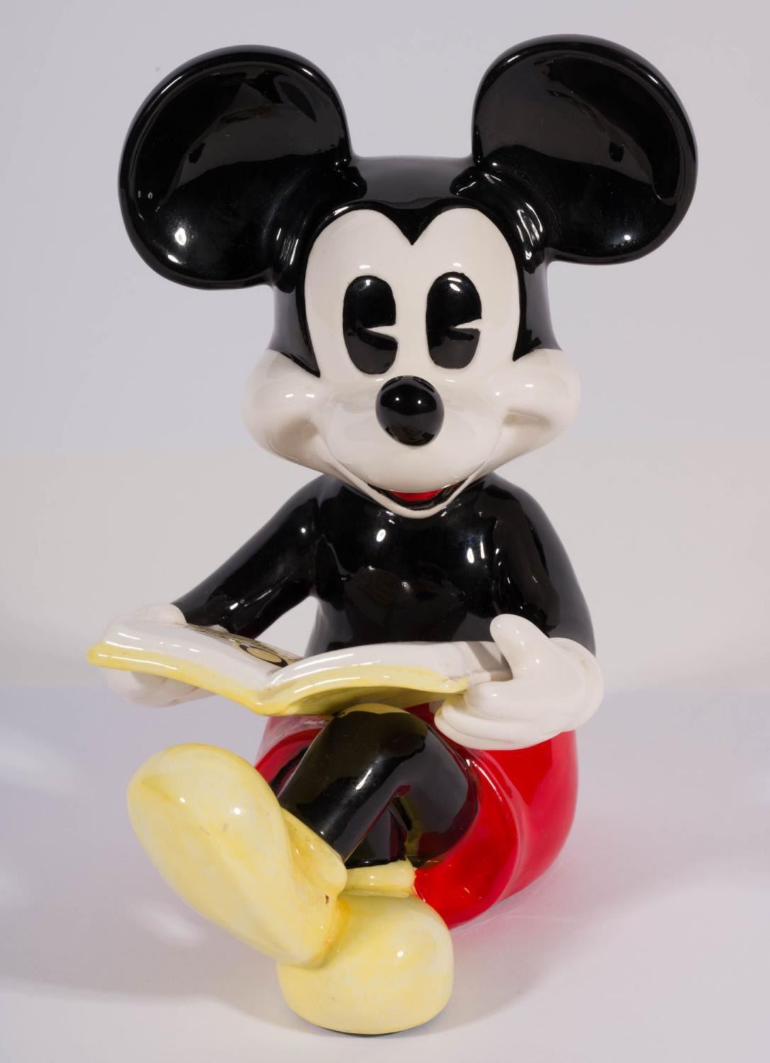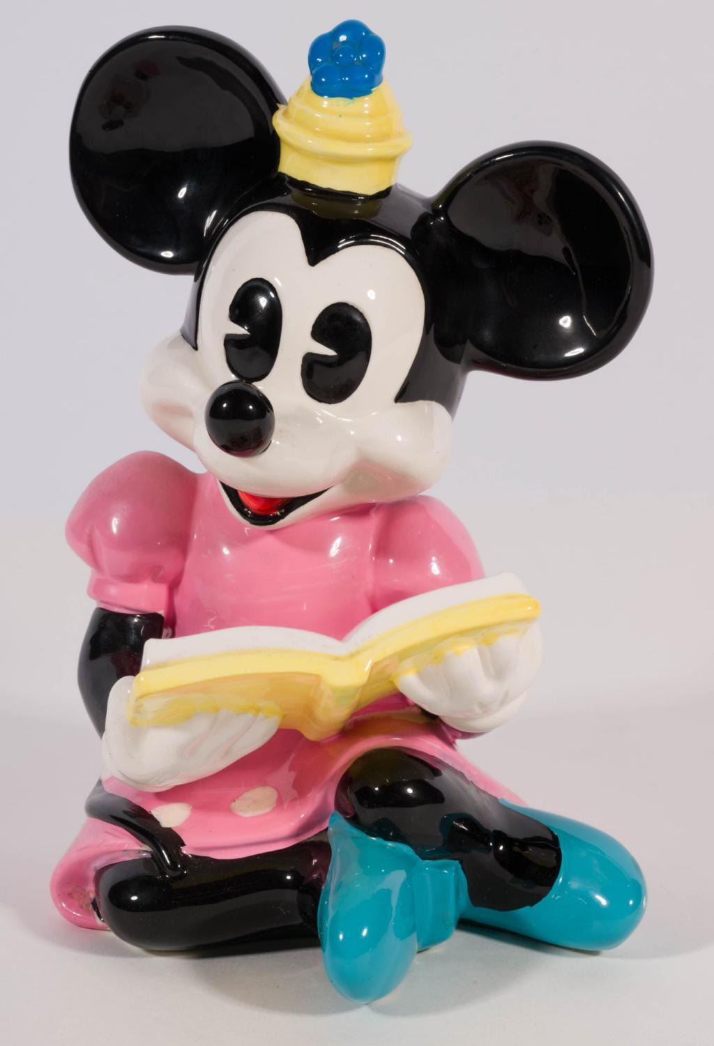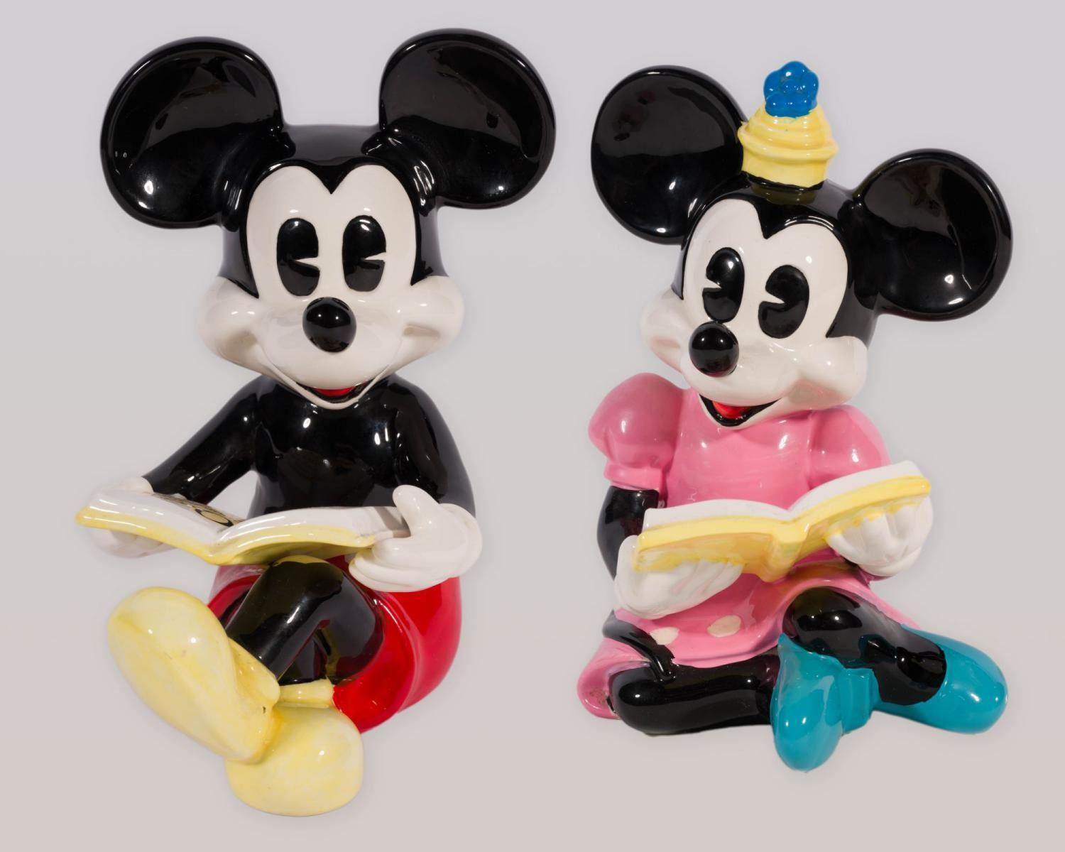 (Schmid, 1980s) A pair of pie-eyed Mickey and Minnie Mouse ceramic figurines, manufactured by Schmid. Measuring 5.5" x 4" x 7" tall and 4.5" x 5" x 7" tall, the figurines are in very good condition with manufacturing paint imperfections, minor paint wear, and light wear to the base.