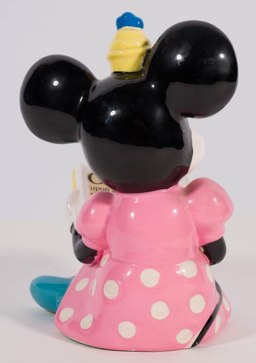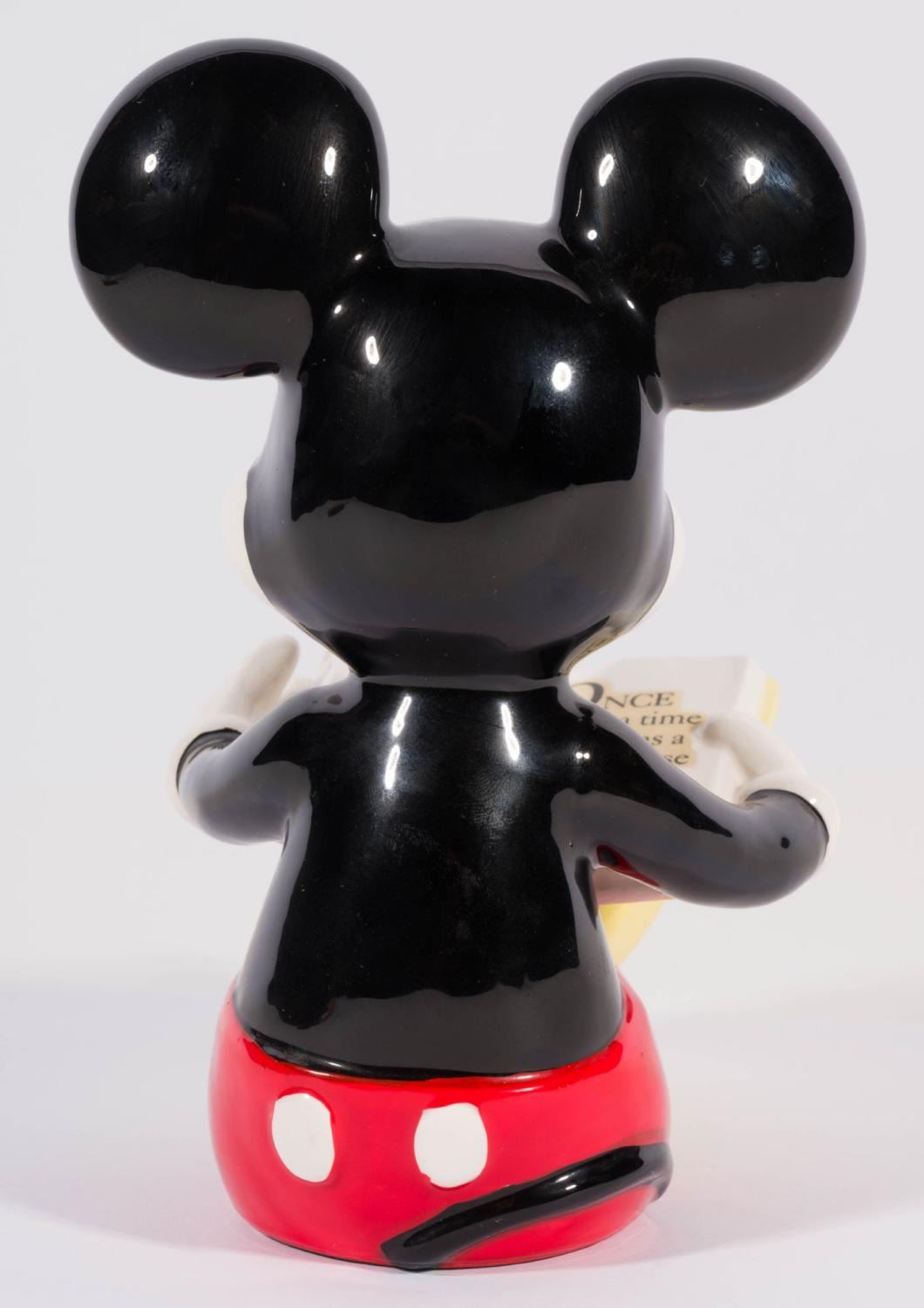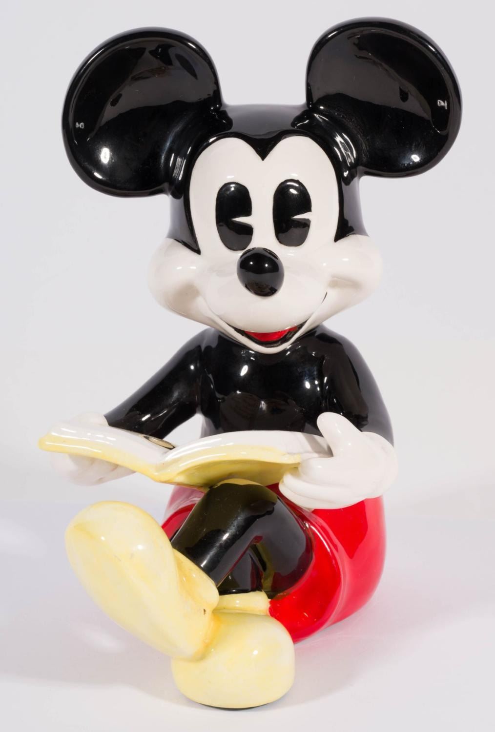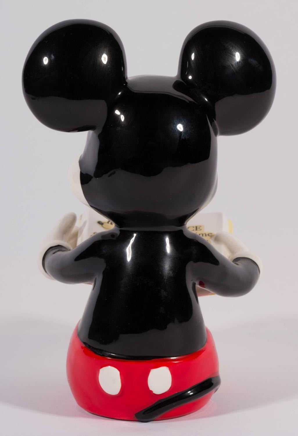 (Schmid, 1980s) A pair of pie-eyed Mickey and Minnie Mouse ceramic figurines, manufactured by Schmid. Measuring 5.5" x 4" x 7" tall and 4.5" x 5" x 7" tall, the figurines are in very good condition with manufacturing paint imperfections, minor paint wear, and light wear to the base.