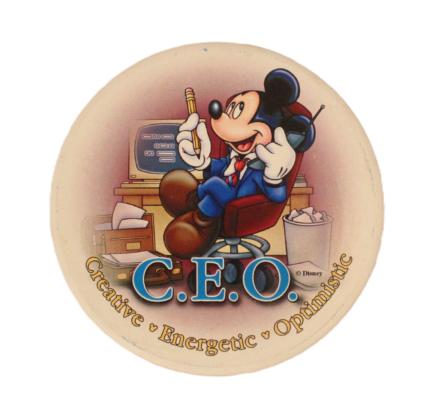 A pair of cute Disney drink coasters featuring Mickey and Minnie Mouse Both are in business suits hard at work in an office. Mickey's has the acronymn C.E.O. Defined as Creative, Energetic, and Optimistic. Minnie's has the acronymn V.I.P. On the lower half defined as Versatile, Intelligent, and Perky. It measures 4” in diameter.