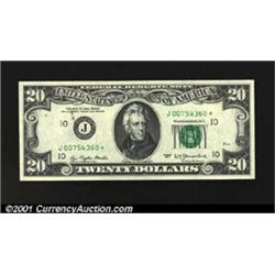 A Pair of Modern $20 Stars.<p>Fr. 2067-G* $20 1969 Federal Reserve Note. Crisp Uncirculated. Gem but for a few counting crinkles.Fr. 2072-J* $20 1977 Federal Reserve Note. Gem Crisp Uncirculated. Boldly embossed and well centered. 2 notes Important notice: We expect to be auctioning lots at the rate of 200-250 per hour. Sometimes eBay Premier live bid software cannot keep up with that pace, so we strongly recommend that you place a realistic proxy bid now as insurance to avoid disappointment. Also please note that all Heritage/CAA lots purchased through eBay Premier carry a 20% Buyer's Premium.