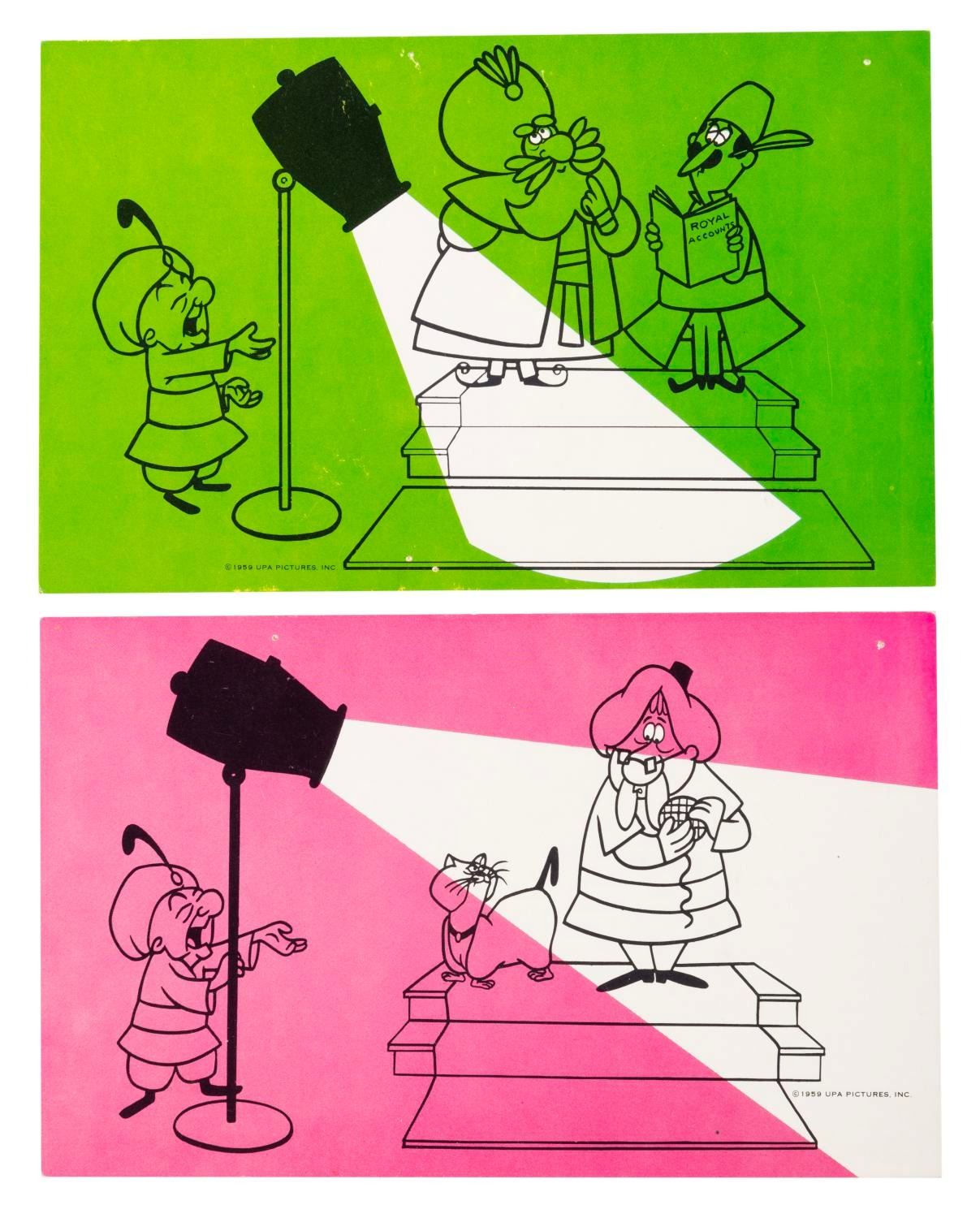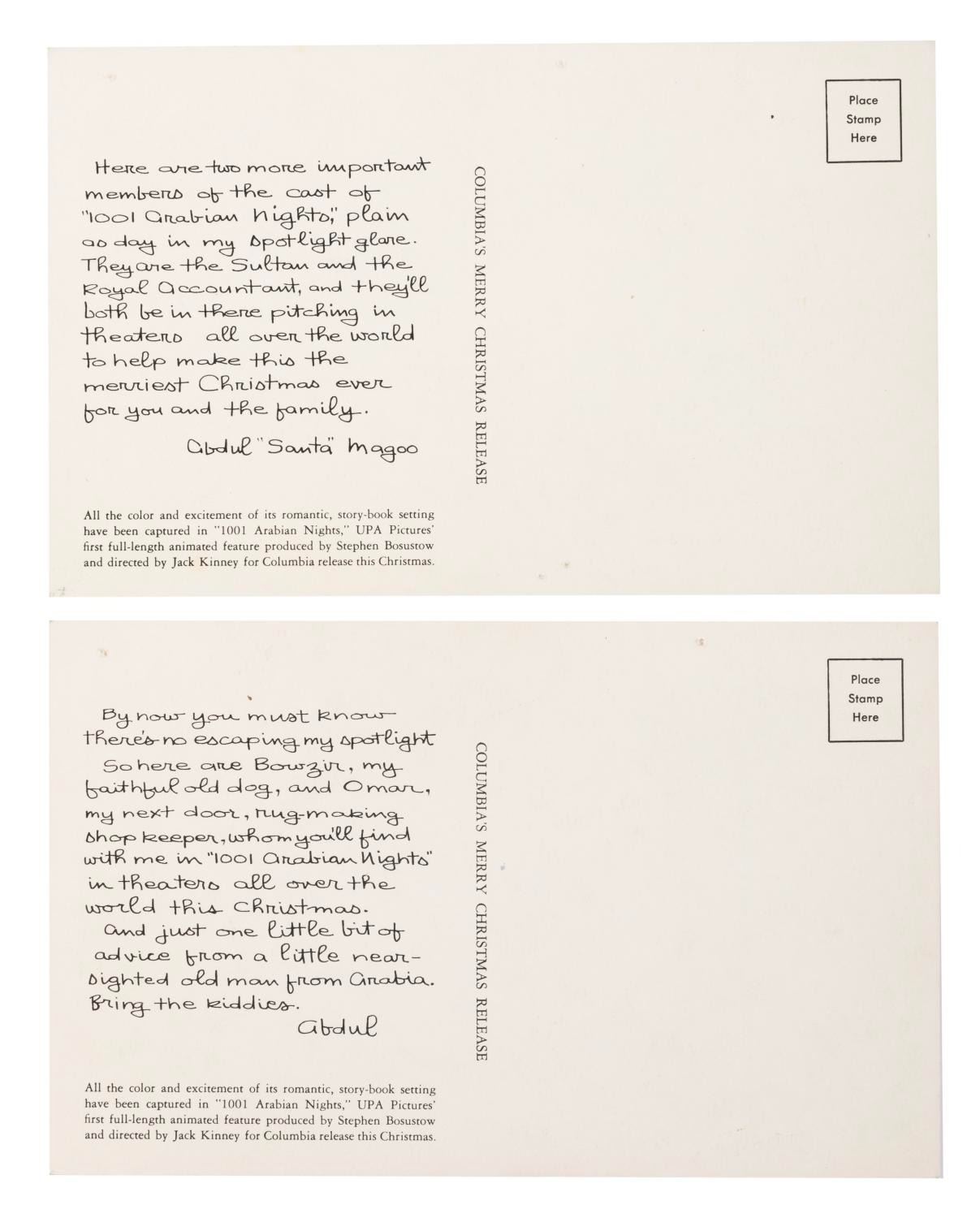 (UPA, 1959) Two promotional postcards featuring characters from "1001 Arabian Nights" with Mister Magoo. Measuring 5" x 8", the postcards are in good condition, with pinholes and wear from handling and age.