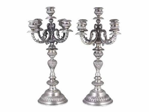 Silver, 2255 g. 2 pieces of five light candelabrums. Cast, pressed and metal pressed neo-rococo decoration. Marked: Austrian, circa 1880, Eduard Friedmann Neuwirth: I/194. Size: 52 cm