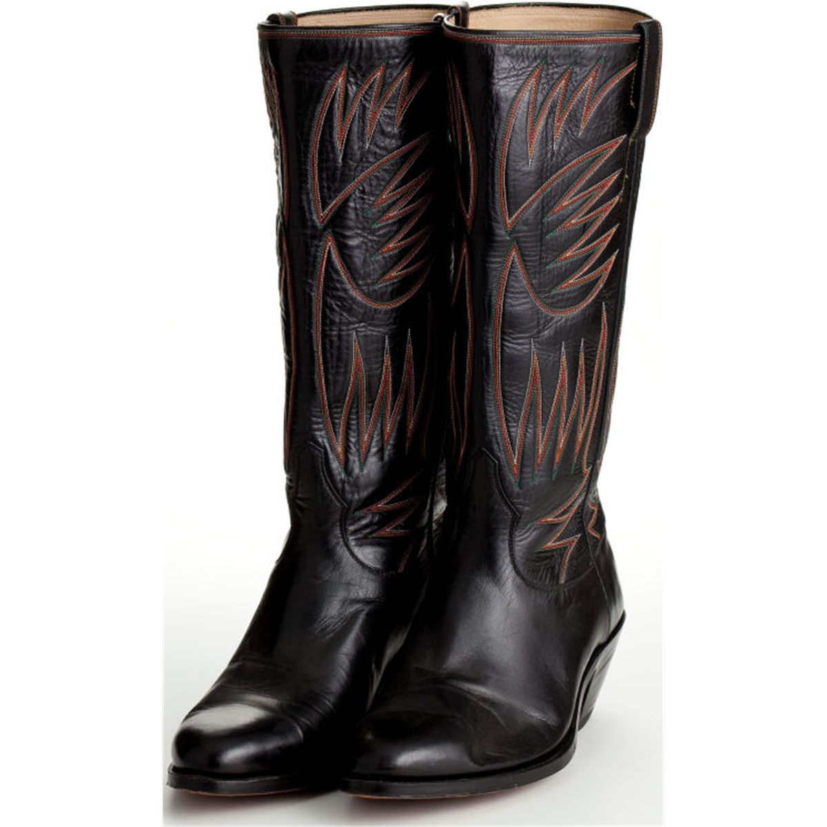A Pair of Nudie's Cowboy Boots, 1970s. Made of black leather with elaborate green, red, orange, and white stitching, inside of each boot has small leather label reading "Nudie's Rodeo Tailors / 5015 Lankershim Boulevard / Hollywood, Calif. 91601;" with slight wear.
