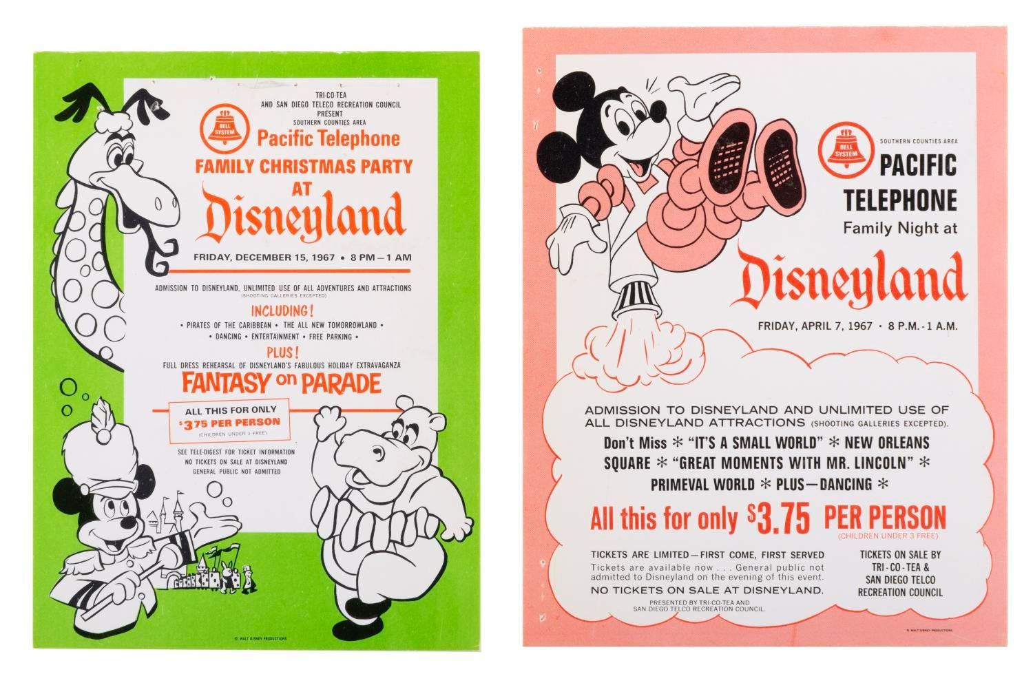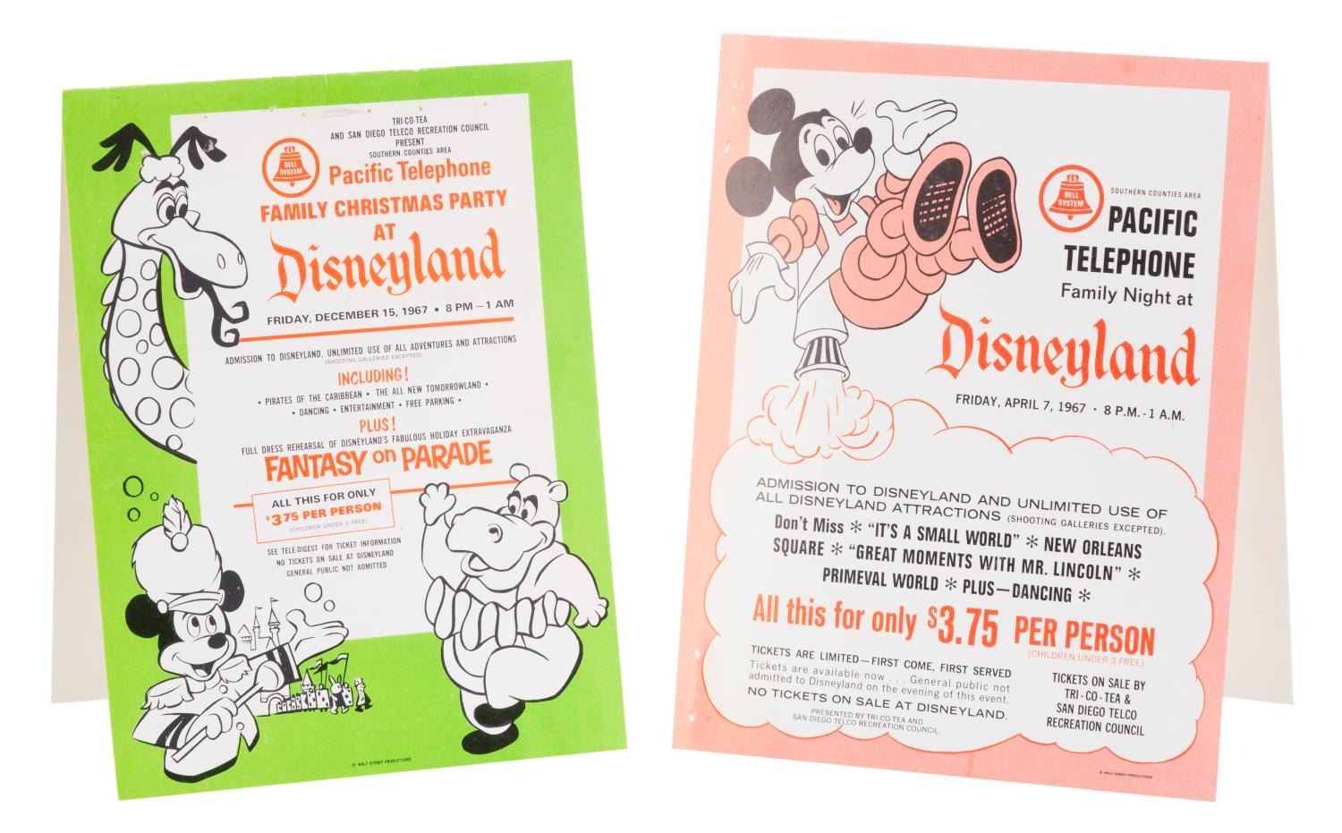 (Disneyland, 1967) A pair of display cards from 1967 for Pacific Telephone Disneyland event days. These cards are for "Family Night" and the "Family Christmas Party" for 1967. The double-sided cards feature imagery of Mickey, Hyacinth Hippo, and the Submarine Voyage sea serpent. The cards measure approximately 5" x 3.75" and are in good condition with a few staple marks along the edges from previous display.