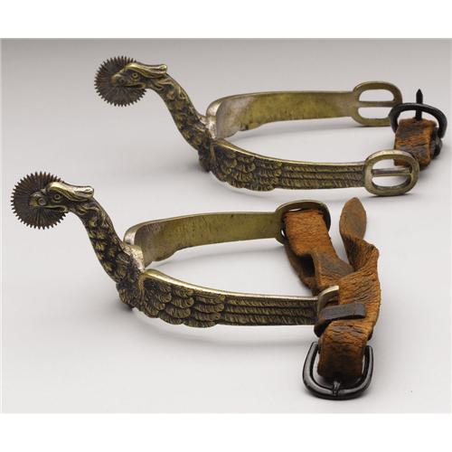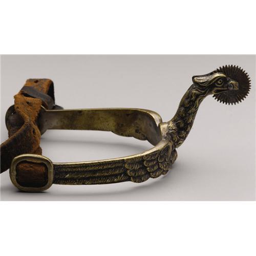 <B>A Pair of Partial-Gilt Eagle-Head Spurs - Civil War</B></I> These Civil War spurs are ornately made with eagle head designs holding the sunburst style rowels. They retain some of the original gilt, approximately 40%, with one of the spurs having its original strap complete. The other spur has a remnant which includes the buckle. Looking at the rowel of the spur, it can be seen that the eagle's head is actually the upturned head of an eagle; the wings of which are the sides of the spurs.<BR><BR>This is a pair of very attractive Civil War spurs with one of the complete straps attached.<BR><BR> <B>Provenance:</B></I> <I>The Tharpe Collection of American Military History</B></I><BR> <BR><B>Exhibited:</B></I> <I>The Liberty Heritage Society Museum</B></I><BR><BR><b>Shipping:</b> Miscellaneous Collectibles, Smal (<a target="_blank" href="http://www.heritageauctions.com/common/shipping.php">view shipping information</a>)