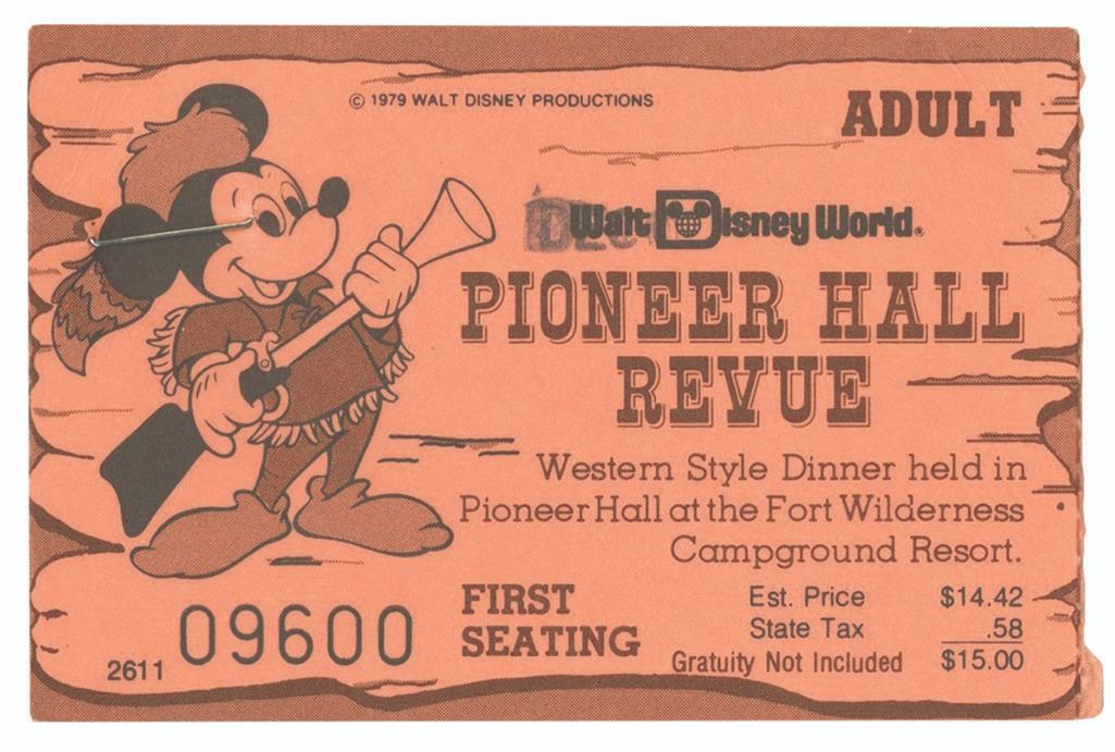 (Fort Wilderness, 1979) A pair of Pioneer Hall Revue adult tickets featuring Mickey in a coonskin cap. These tickets are for the first seating of the western-style dinner show and are stapled together at the top-left. The tickets measure approximately 2.25" x 3.25" each and are in very good condition with minor wear and hand-written notes on the reverse of one.