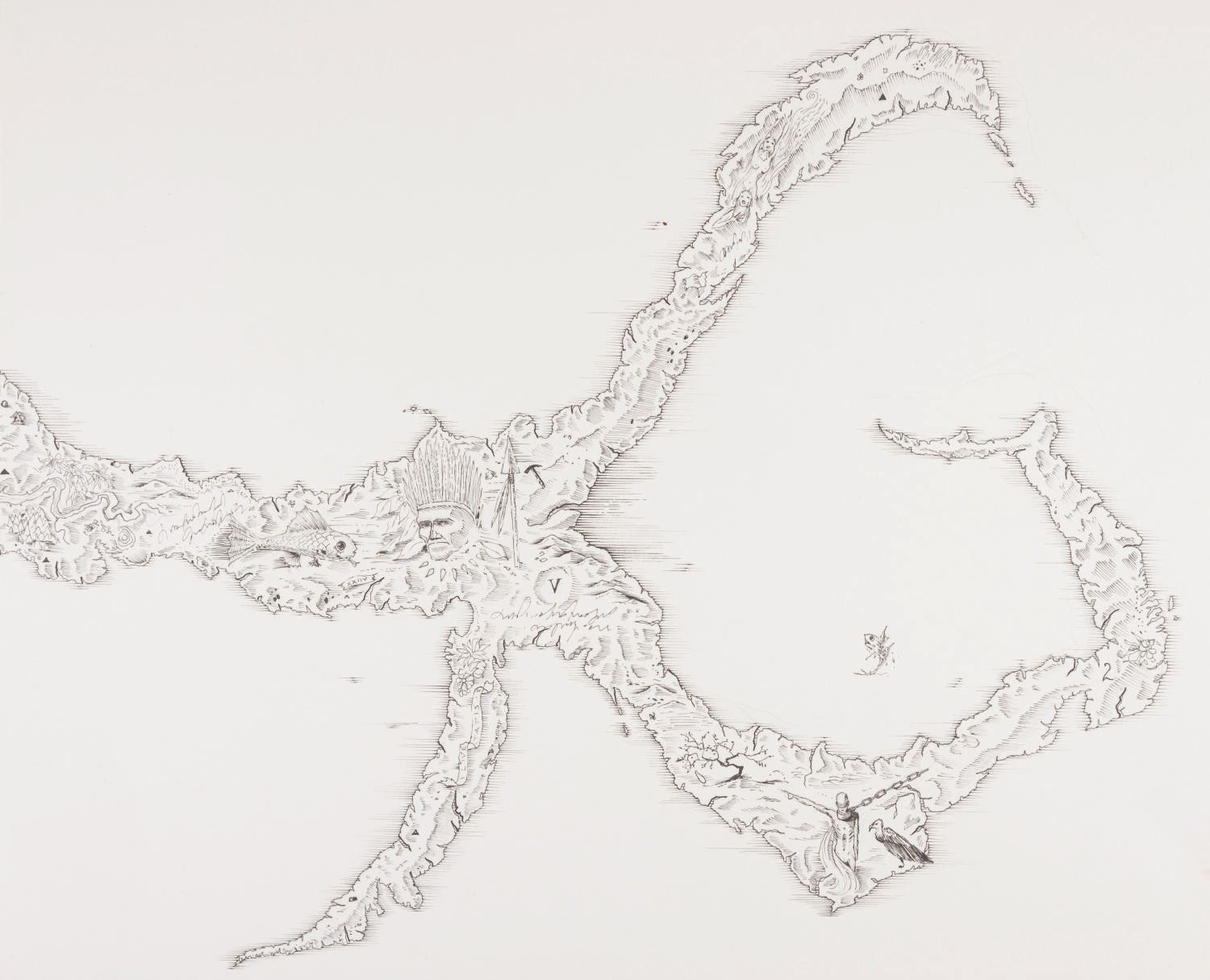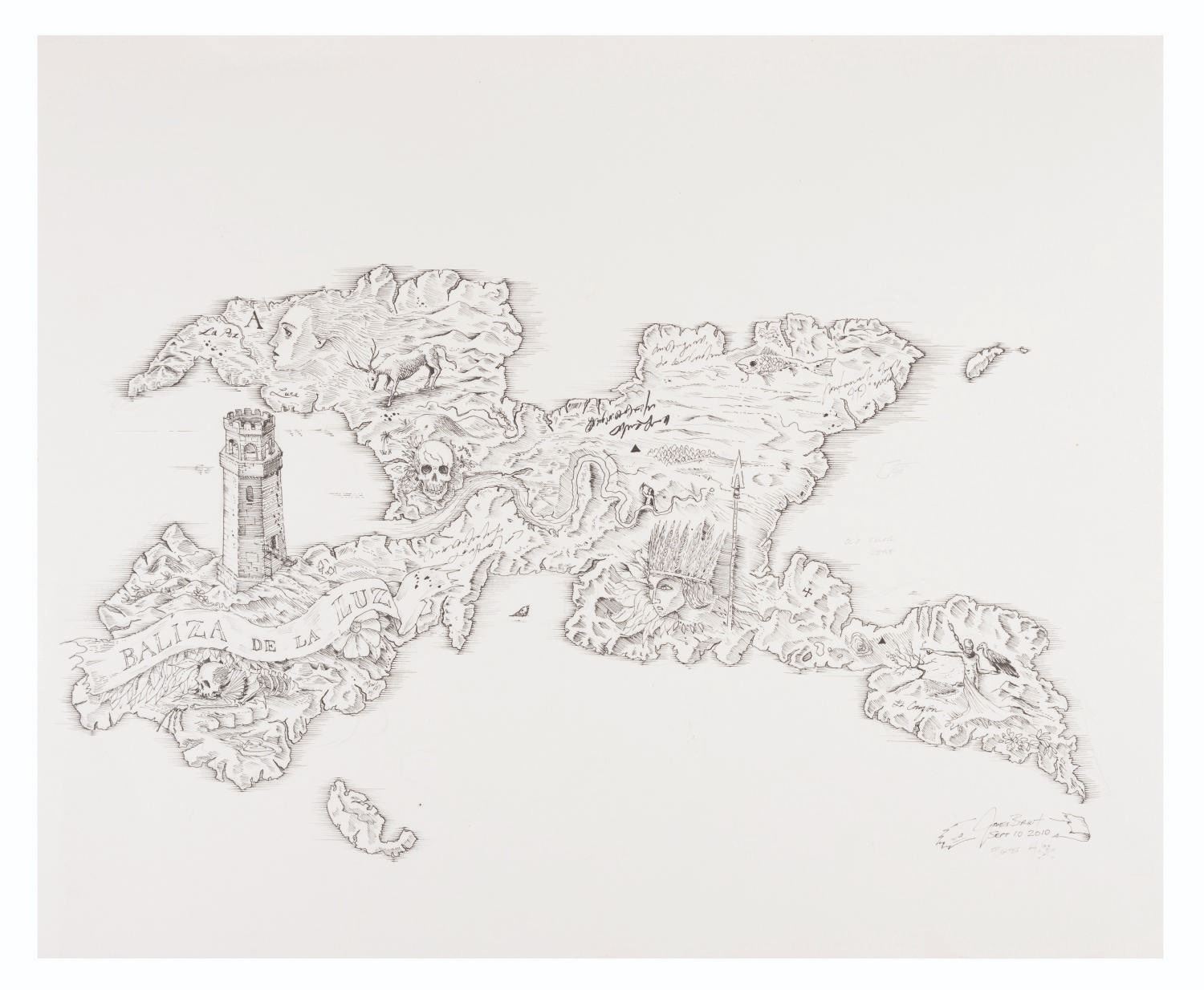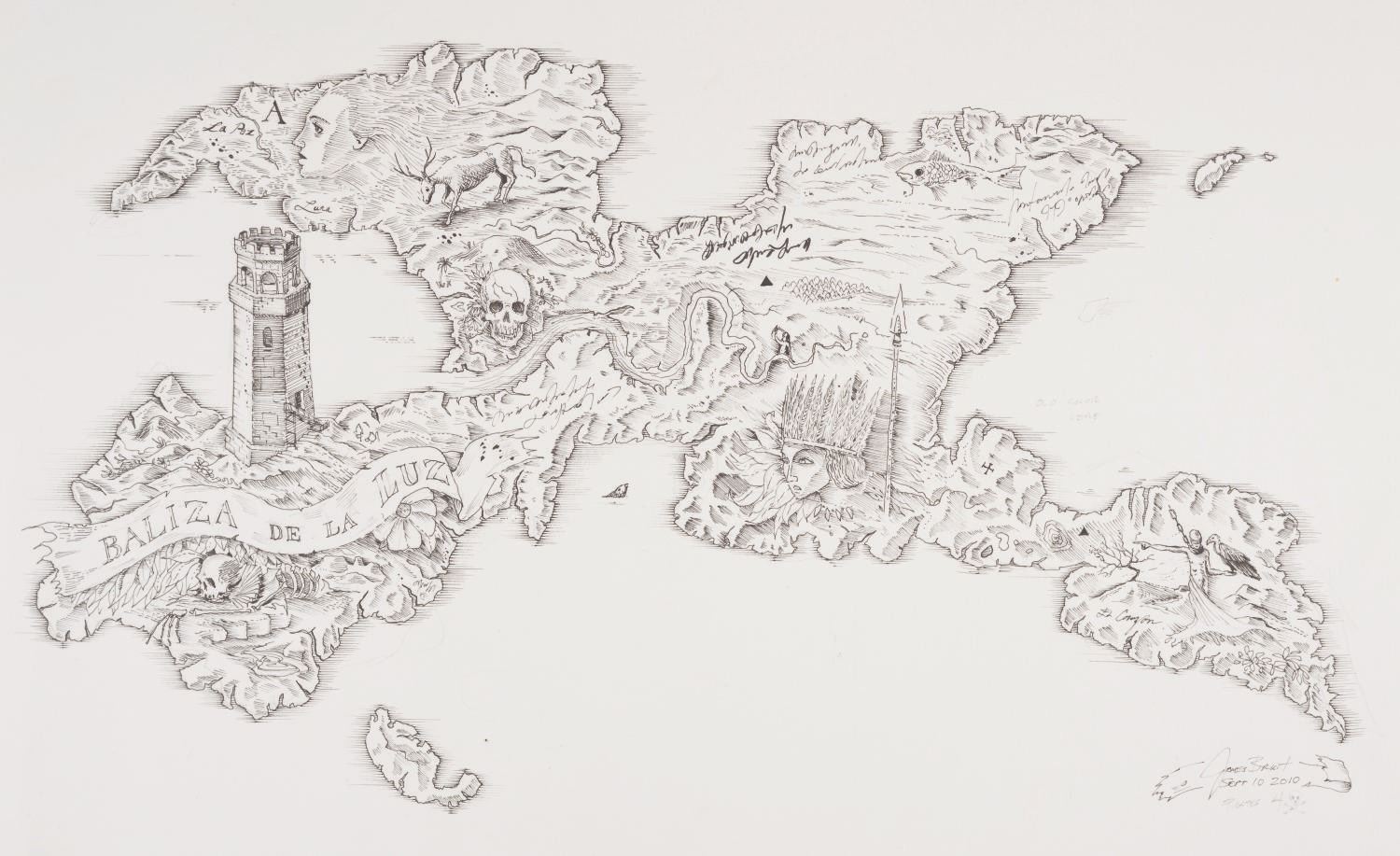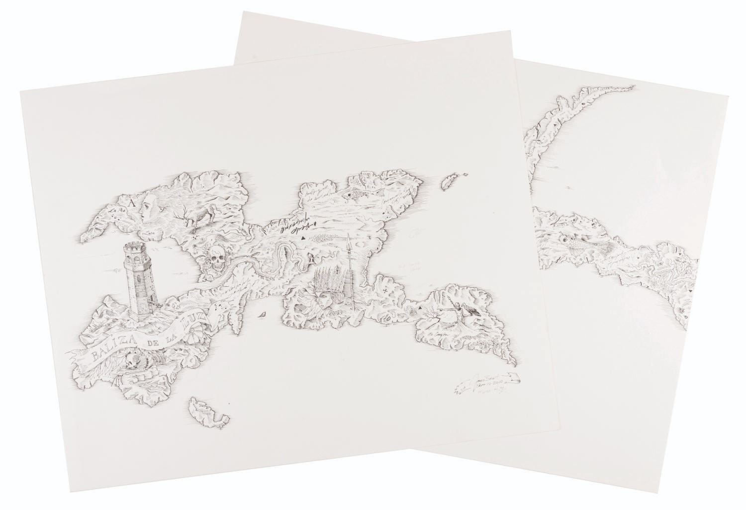 (Disney, 2010) A pair of map concepts from “Pirates of the Caribbean: On Stranger Tides” drawn by conceptual artist James Byrkit. One of the drawings is a concept for an extension on an earlier map. Accomplished in ink on bristol board, the drawings measure 14” x 17” and are in fine condition.