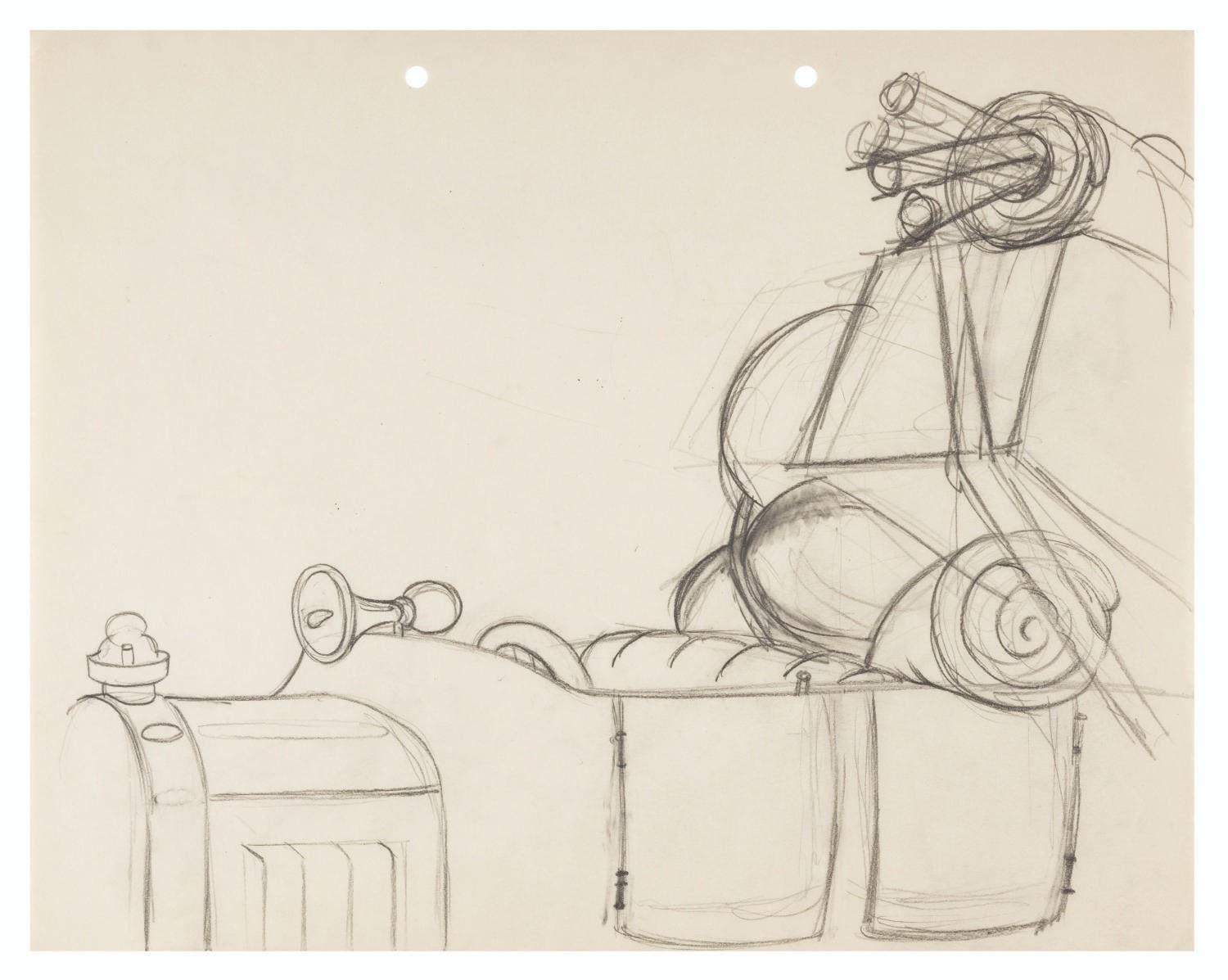 (Schlesinger, 1937) A pair of rough Lobby Card drawings for the Looney Tunes short “Porky and Gabby,” directed by Ub Iwerks. Accomplished in graphite, both drawings measure 9.5” x 12” and range from very good to fine condition with light edge wear and creasing from production use and light discoloration from age.