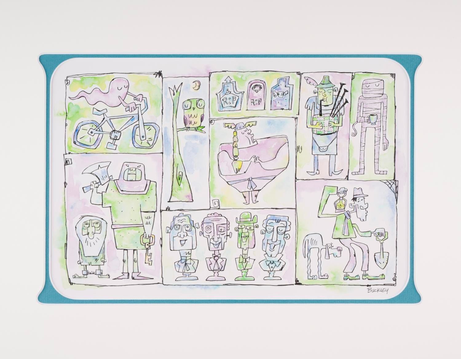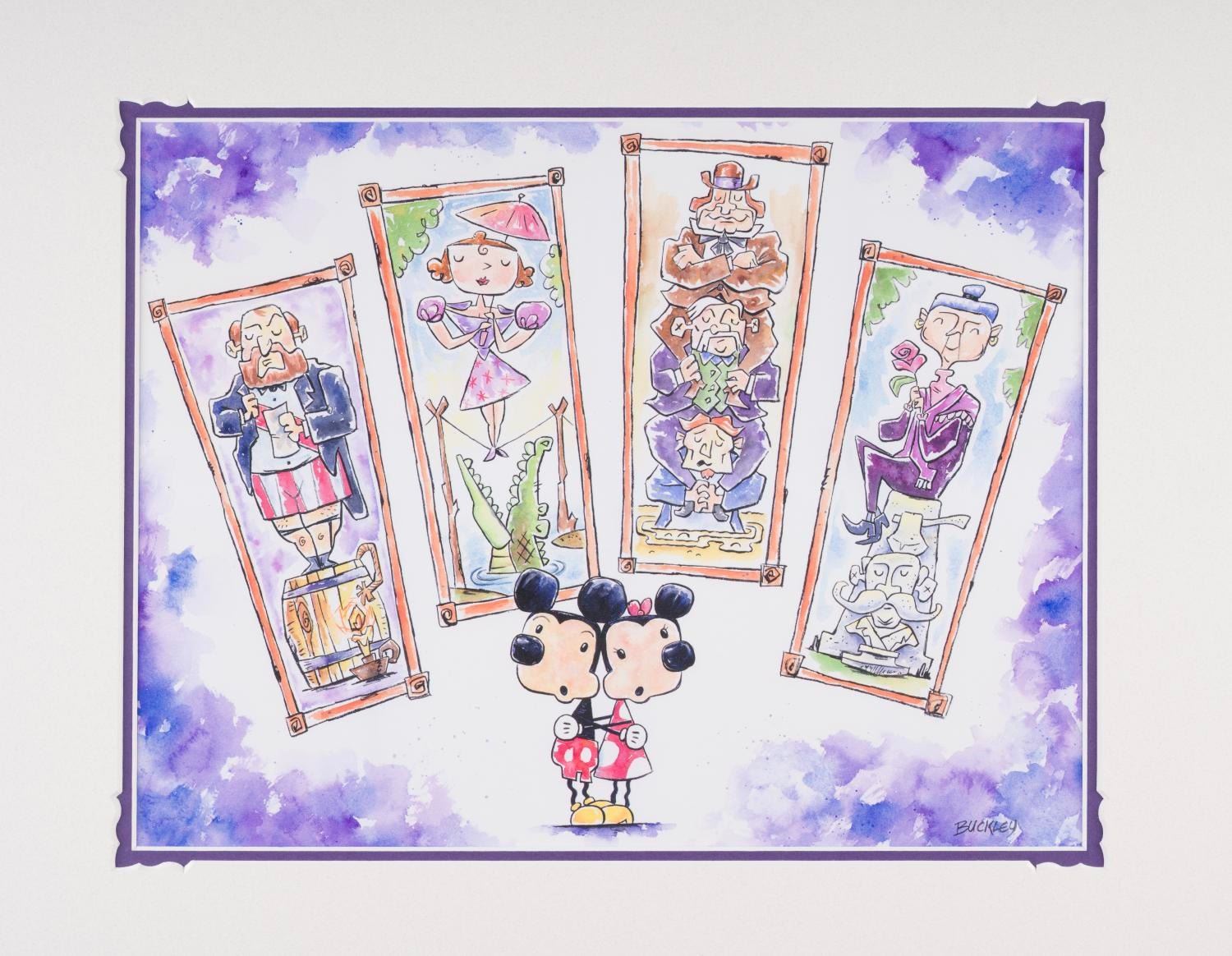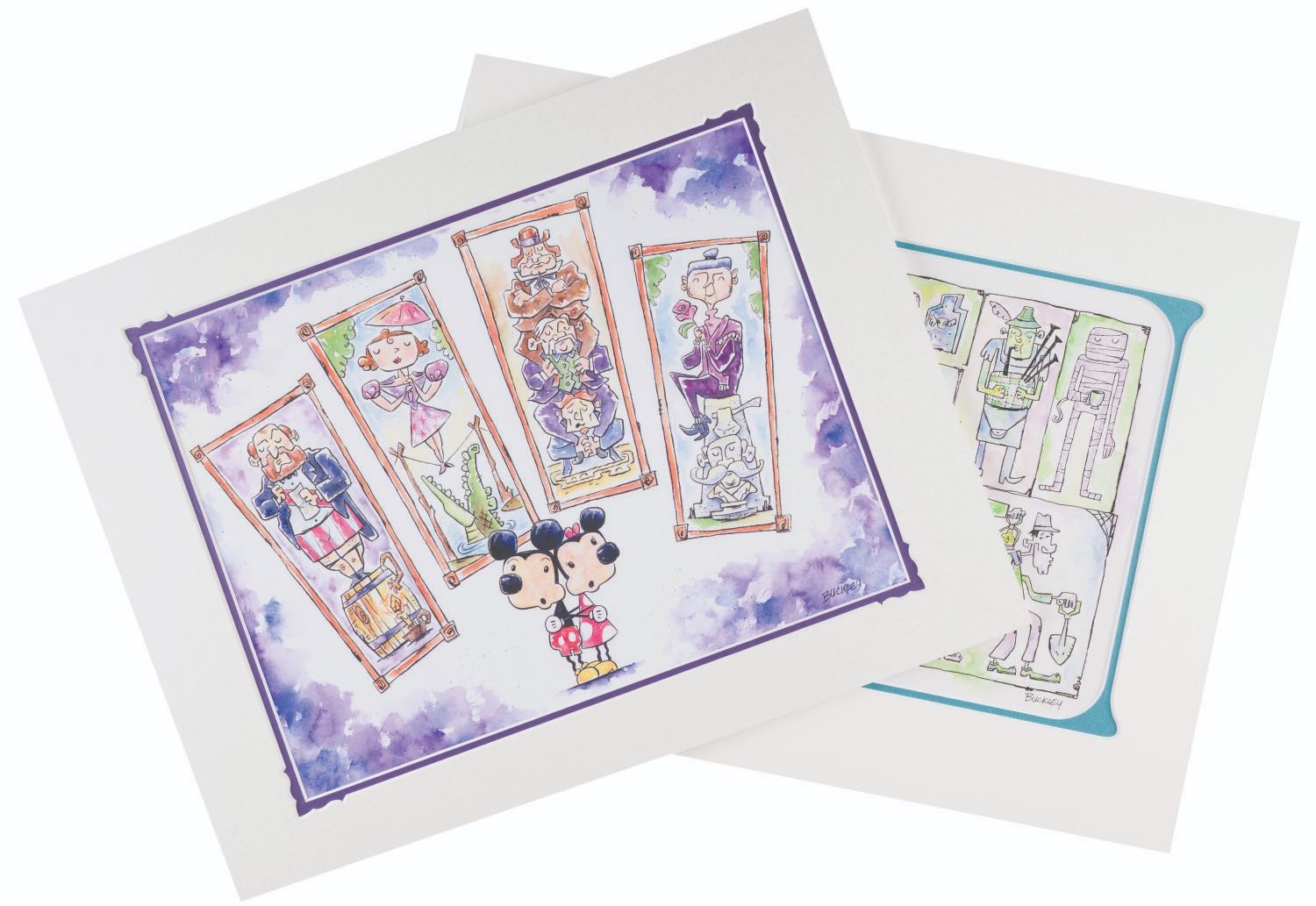 (The Art of Disney Theme Parks, 2018) A pair of rare Haunted Mansion David Buckley Prints titled "Stretch Room Scares" and "Haunted Mansion Graveyard" released at the Epcot International Festival of the Arts in 2018. Measuring 18" x 14", each matted piece is in fine condition.