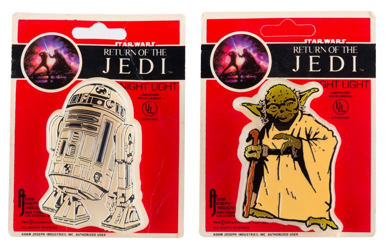 (Adam Joseph Industries, 1983) A pair of “Return of the Jedi” Night Lights of R2-D2 and Yoda. The night lights are unused on the original cards, and worked when tested. The night lights are in fine condition with the cards in good condition with typical small creases and edge wear.