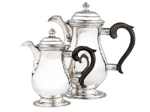 Silver, 658 g. Oval base, pear shape body with everted spout, original wooden handle. Domed hinged cover, plastic final. Marked: Pozsony, circa 1775, Johann Christoph Stieger (master) doubled on the bottom (Yugoslav import mark after 1933). Koszeghy: 1759 and Tardy: page 410. Size: 18 and 14 cm