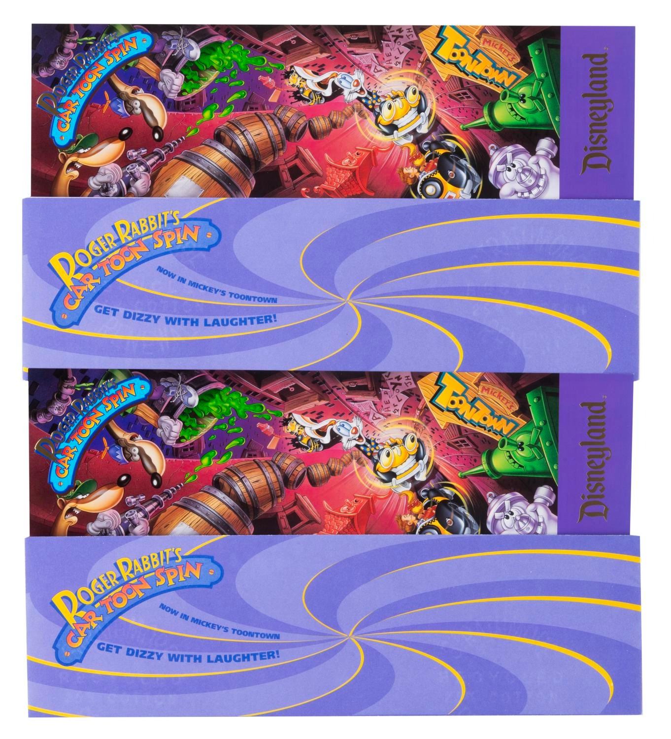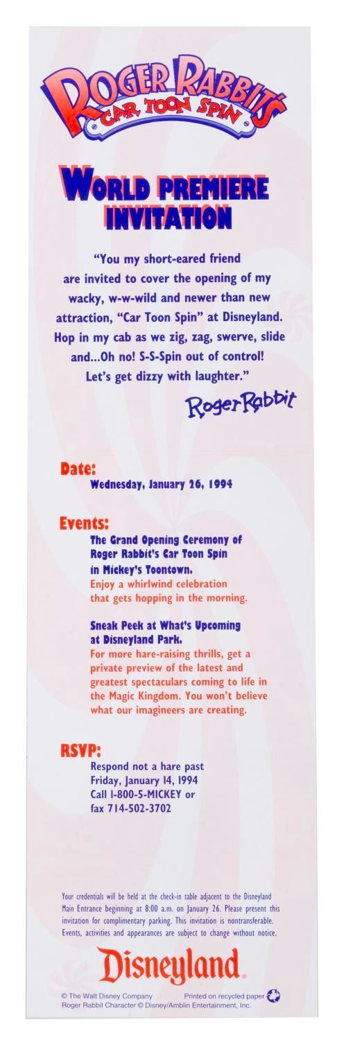 (Disneyland, 1994) A pair of world premiere invitations to Roger Rabbit’s Car Toon Spin. The invitations measuring 4" x 14" and envelopes measuring 4" x 14.25" are in very good condition with price stickers on the flaps and light wear to the envelopes.