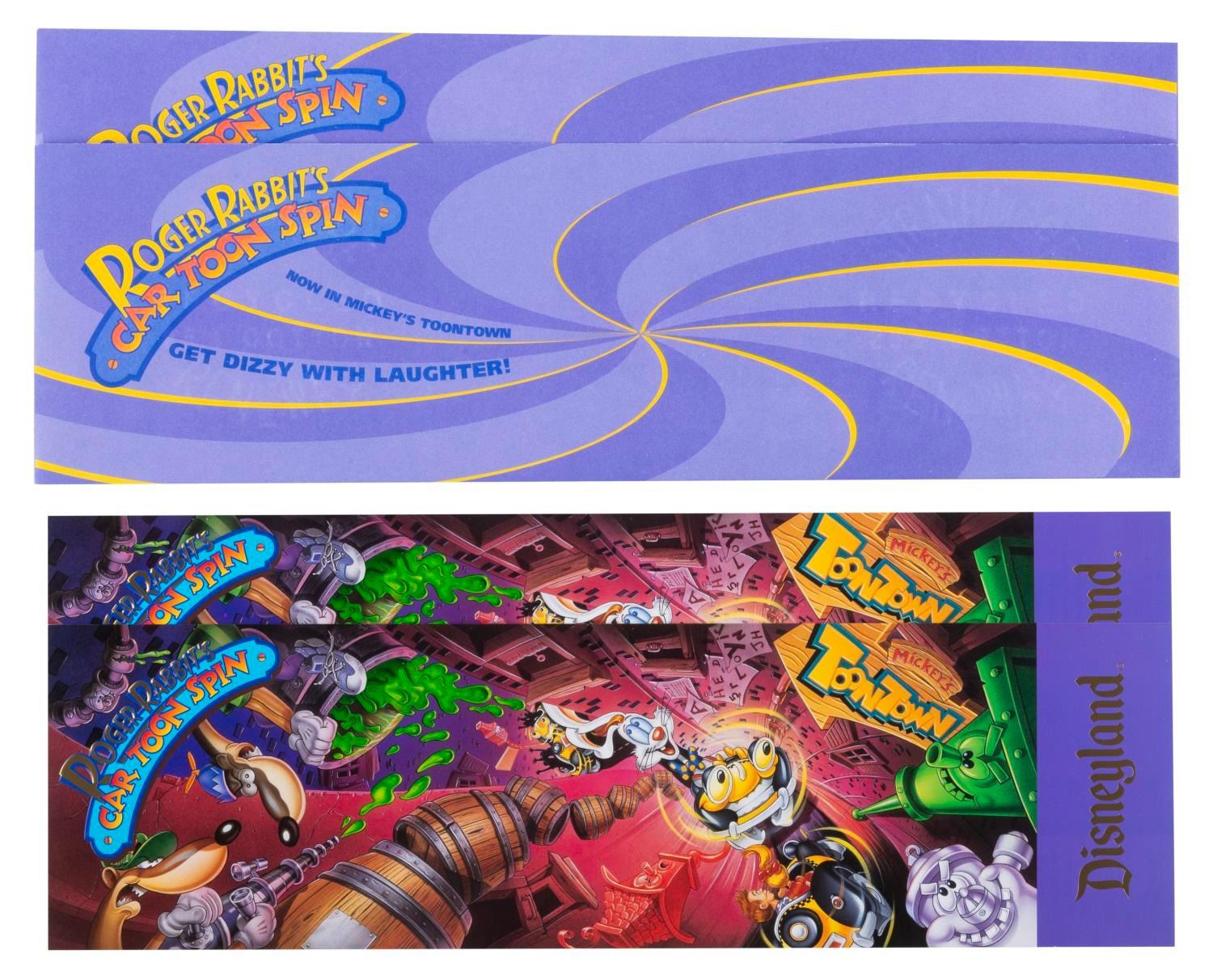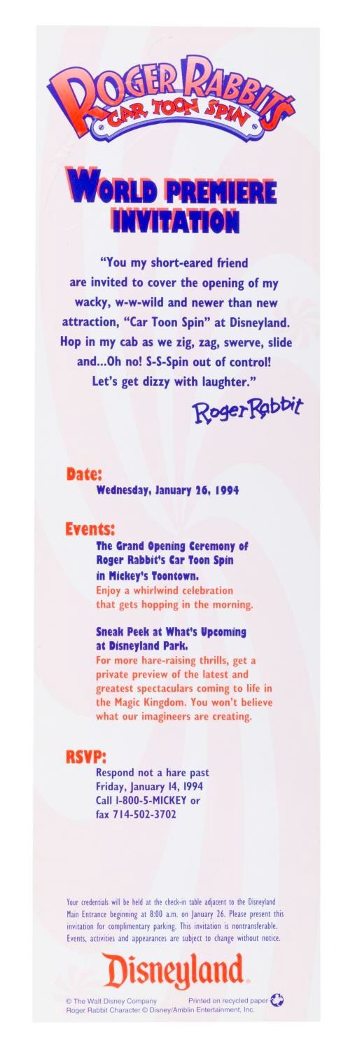 (Disneyland, 1994) A pair of commemorative passports from the grand opening of Roger Rabbit’s Car Toon Spin at Disneyland. The invitations measuring 4" x 14" and envelopes measuring 4" x 14.25" are in very good condition with price stickers on the flaps and light wear to the envelopes.