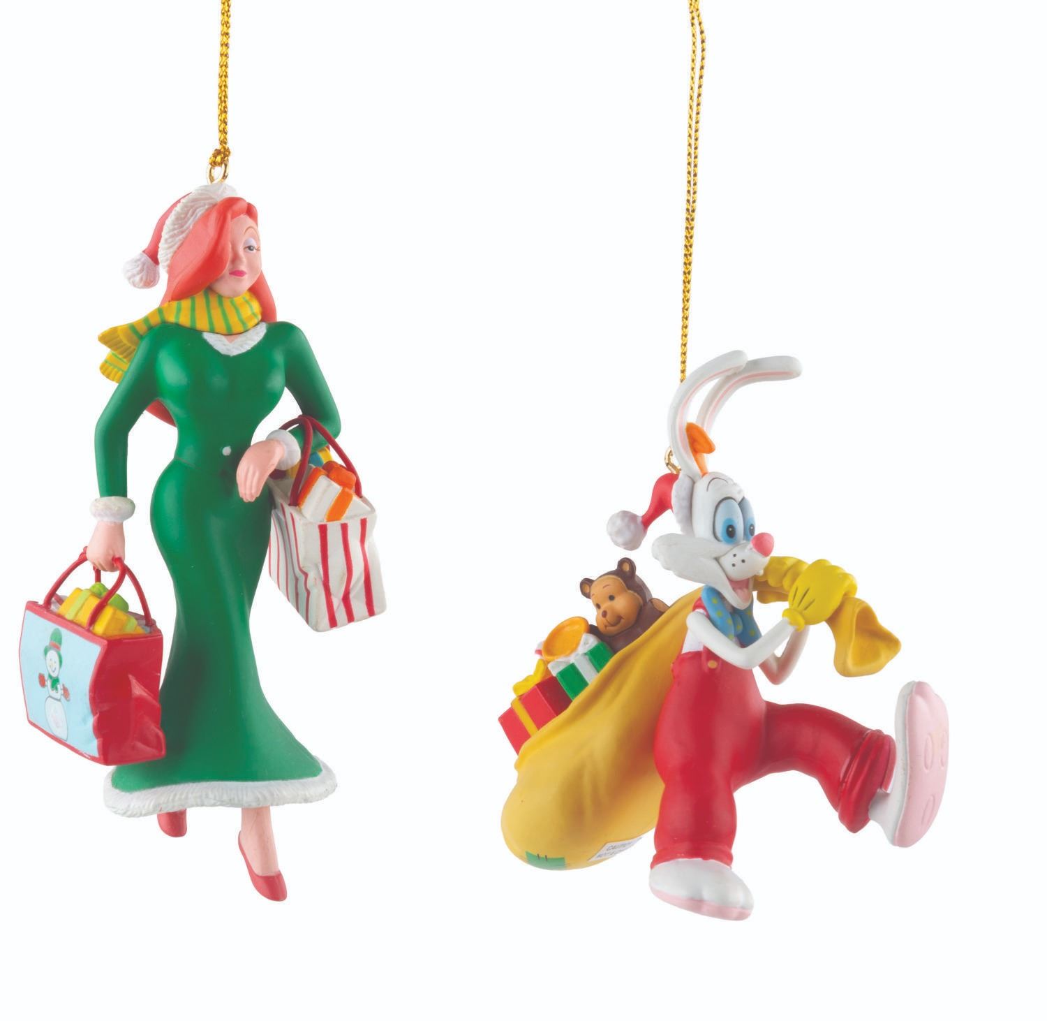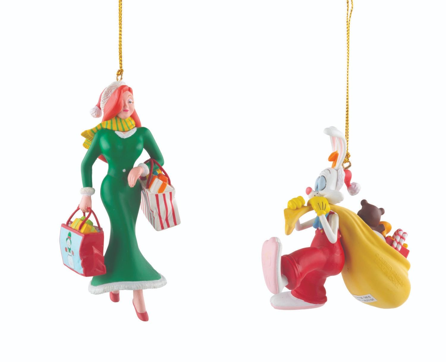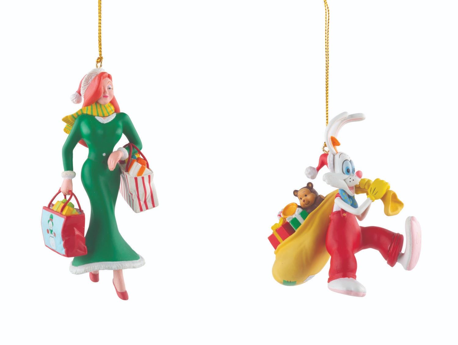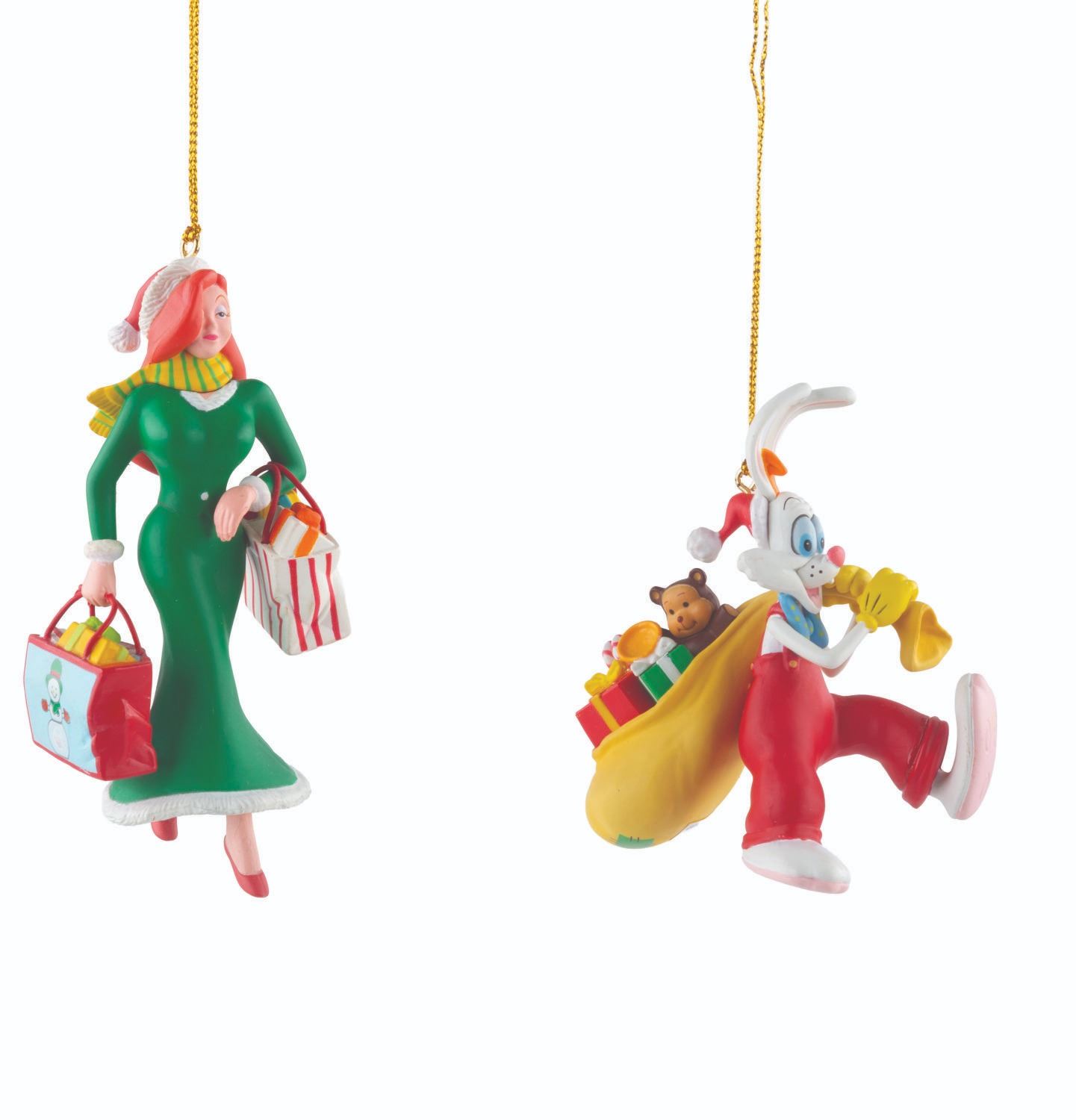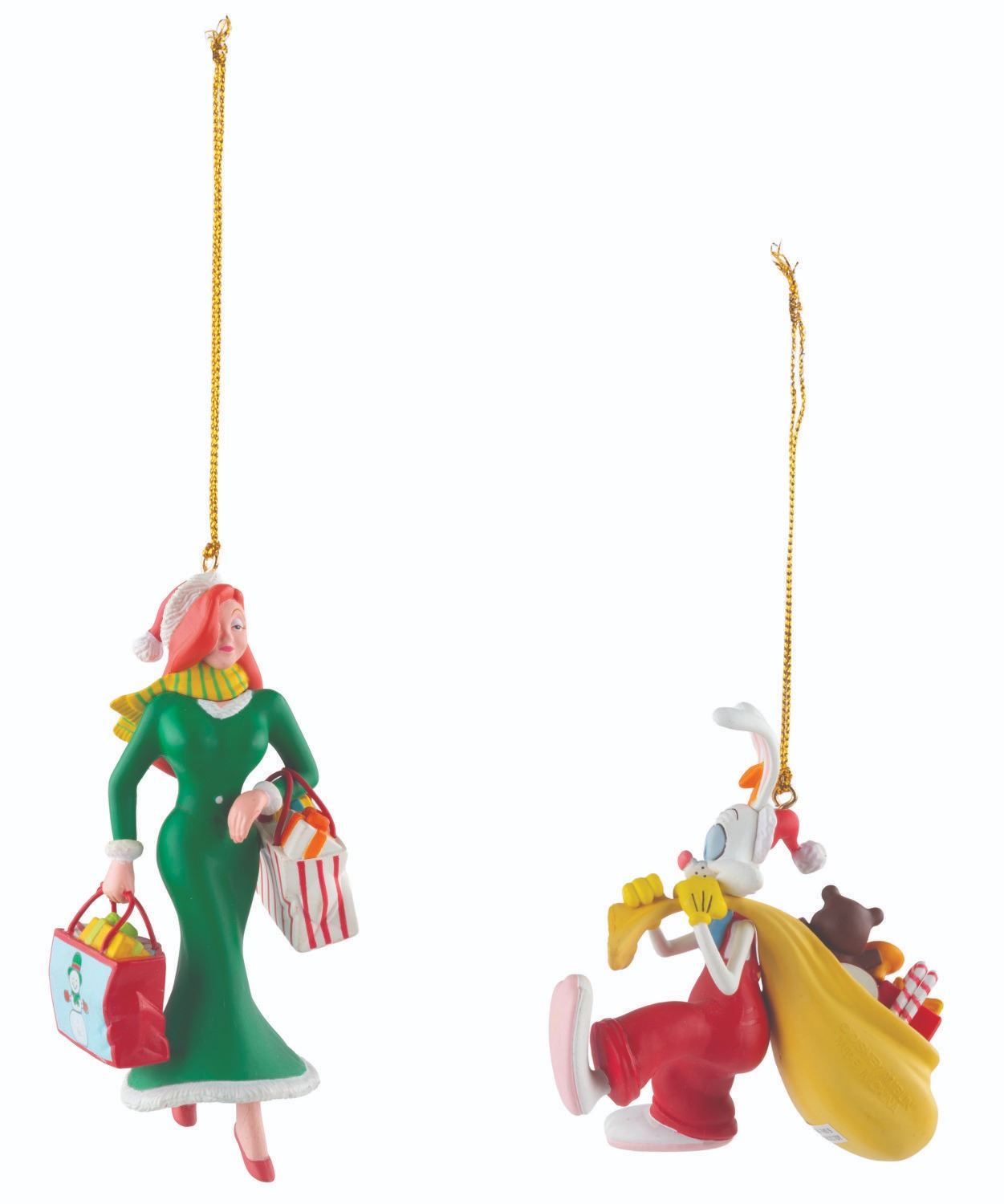 (Grolier, 1990s) A pair of Christmas ornaments featuring Roger and Jessica Rabbit holiday shopping. Measuring 3" x 3" to 2" x 4.25", the ornaments are in fine condition with their original boxes.