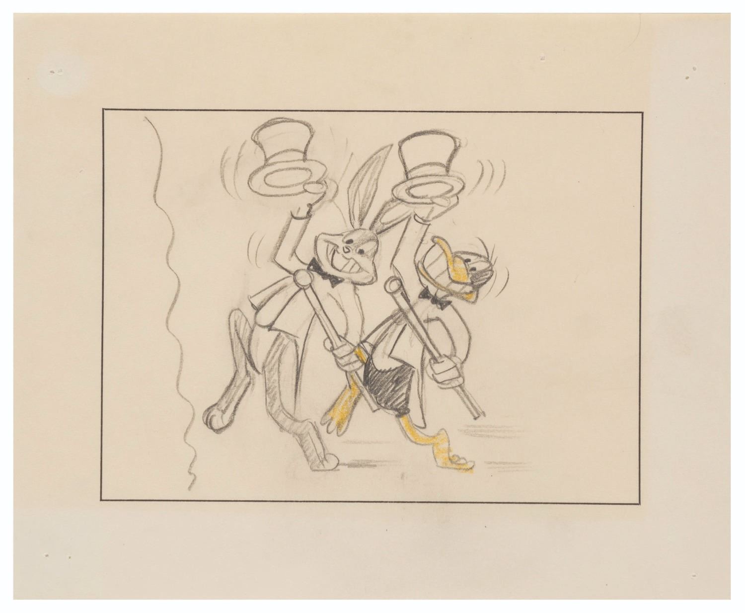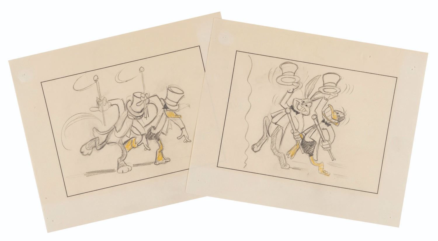 (Warner Bros. 1957) A pair of original storyboard panels featuring Bugs Bunny and Daffy Duck from the Looney Tunes short “Show Biz Bugs.” Accomplished in graphite and colored pencil and measuring 5.75” x 7”, the panels are in very good condition with pinholes from production use and light discoloration from age.