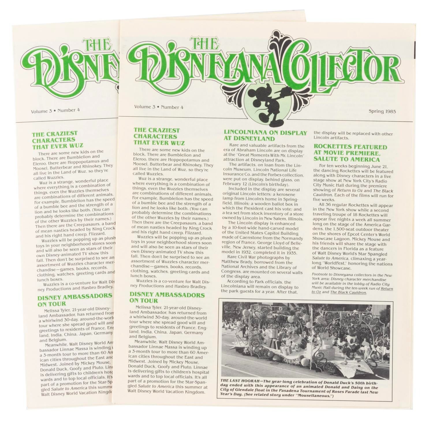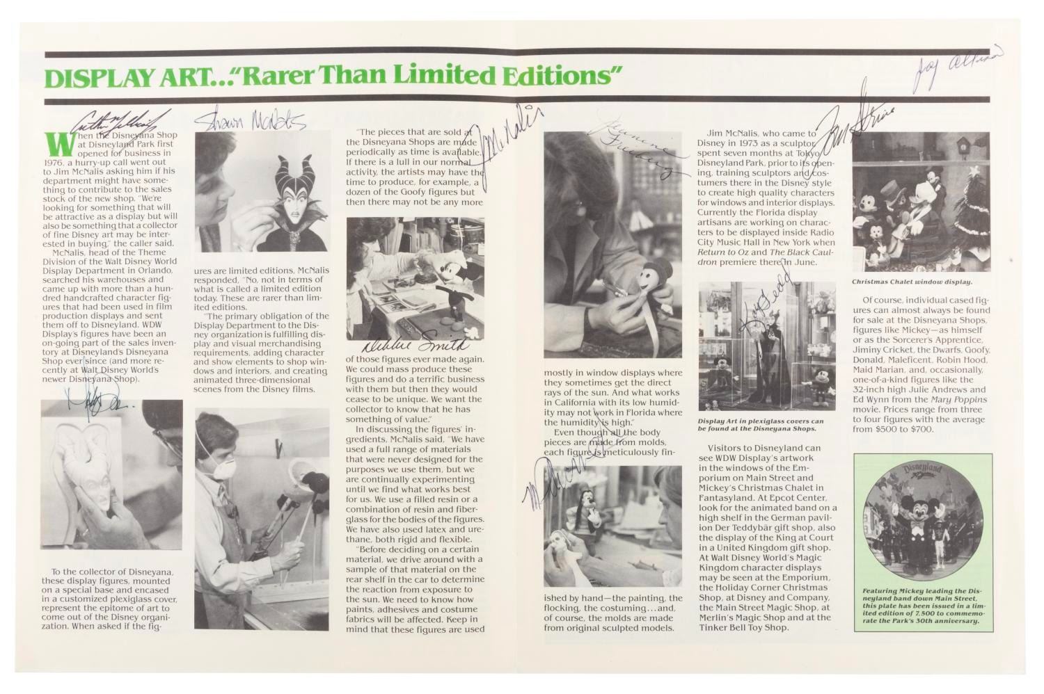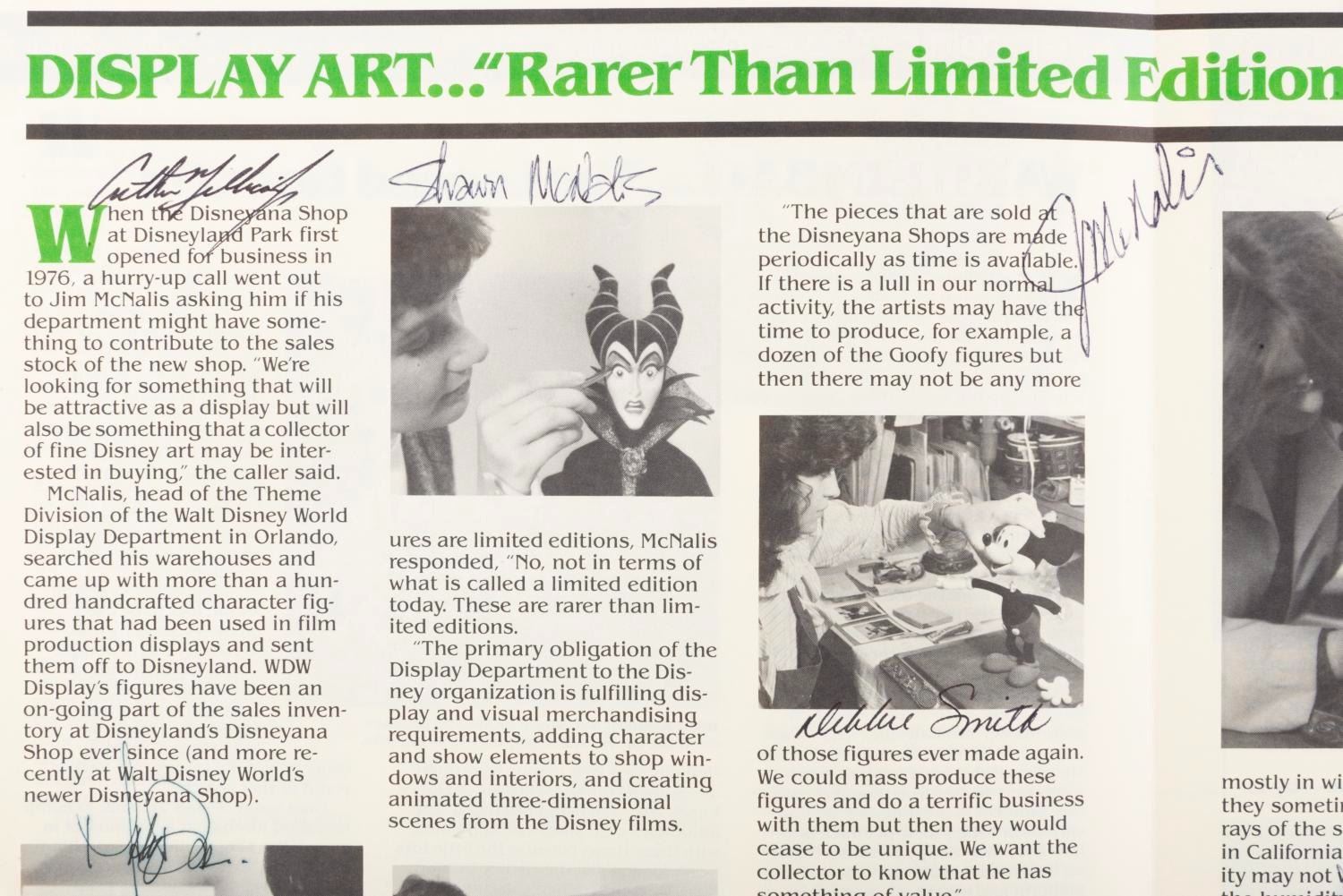 (Disneyana, 1985) A pair of Spring 1985 issues of The Disneyana Collector, one signed by Jim McNalis and the other signed by the various artists pictured in the article. Measuring 8.5” x 11”, the issues are in good to very good condition with intended folds, edge wear, discoloration from age, and a heavy crease at the top right corner of one issue.