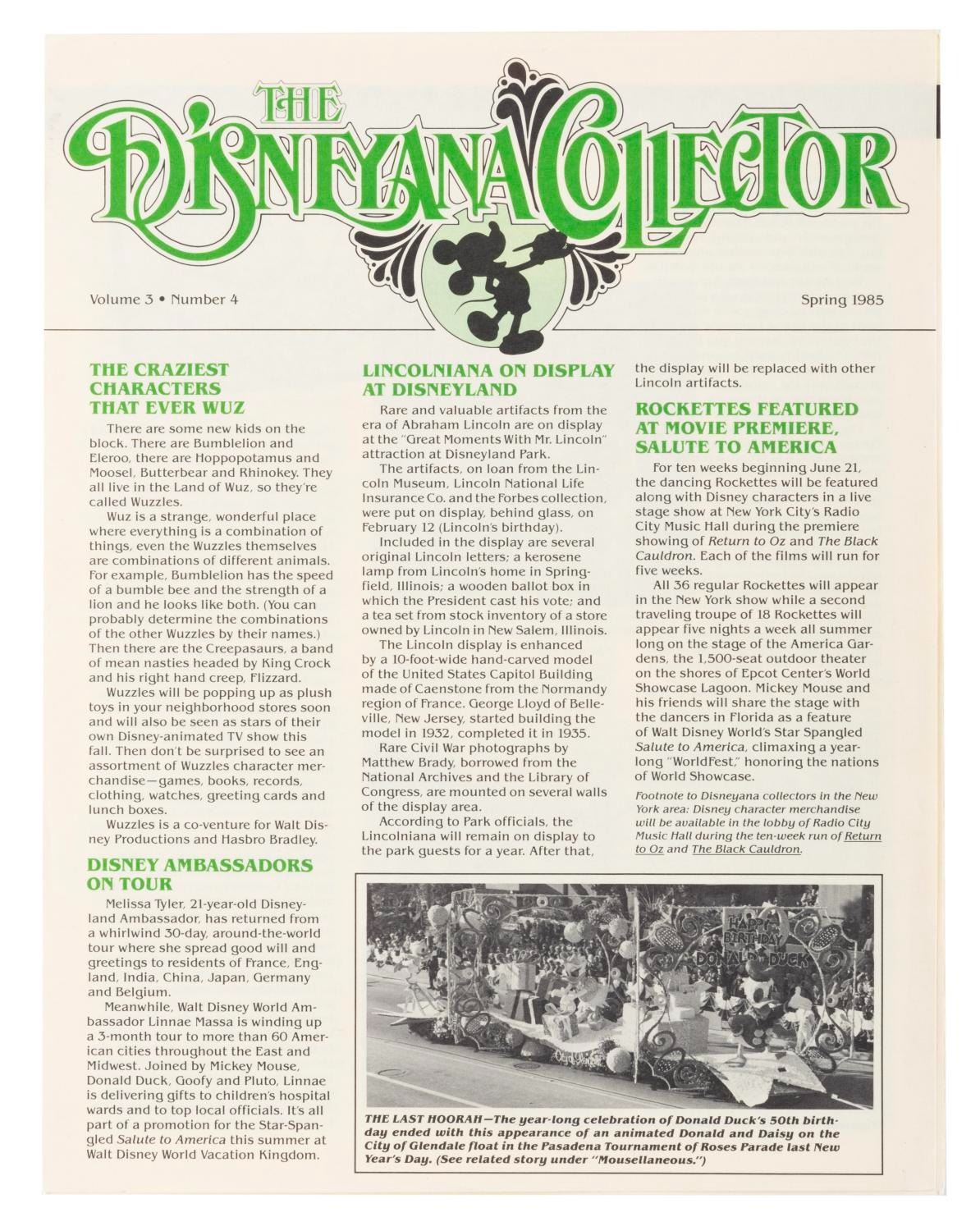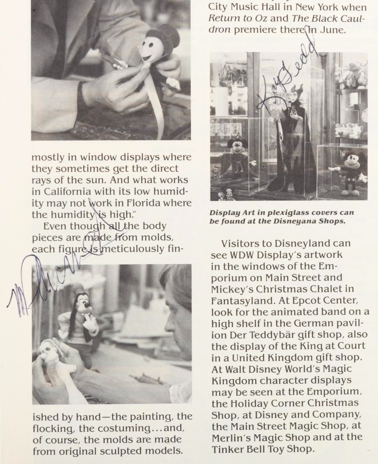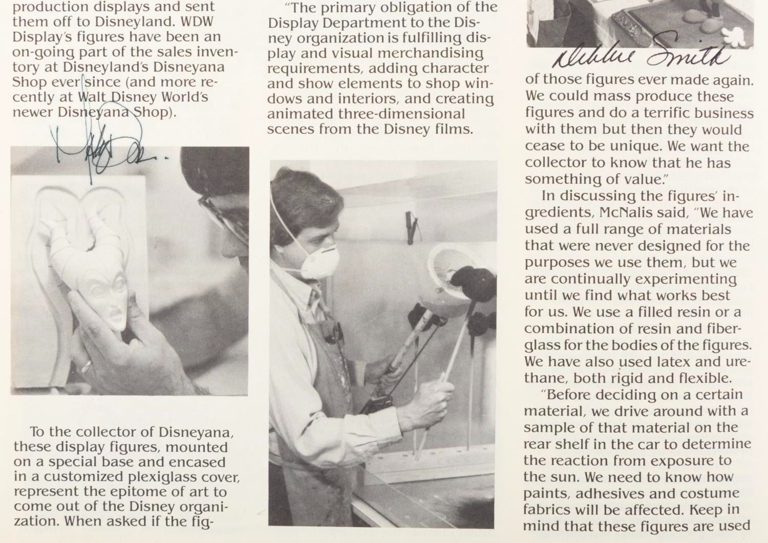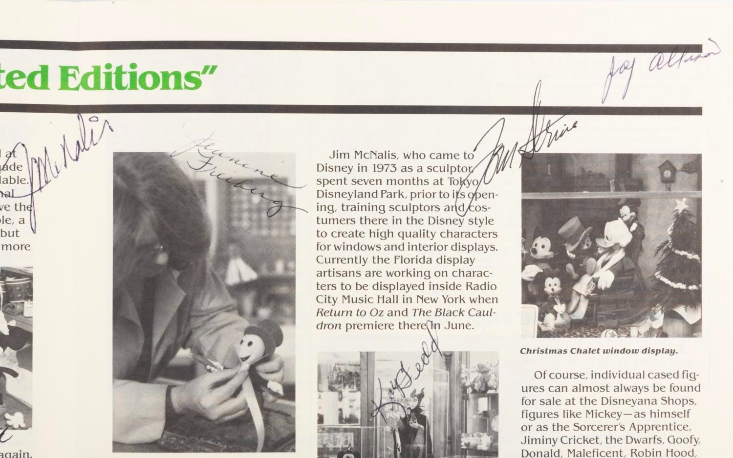 (Disneyana, 1985) A pair of Spring 1985 issues of The Disneyana Collector, one signed by Jim McNalis and the other signed by the various artists pictured in the article. Measuring 8.5” x 11”, the issues are in good to very good condition with intended folds, edge wear, discoloration from age, and a heavy crease at the top right corner of one issue.