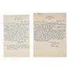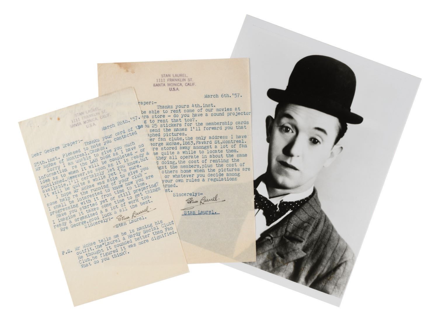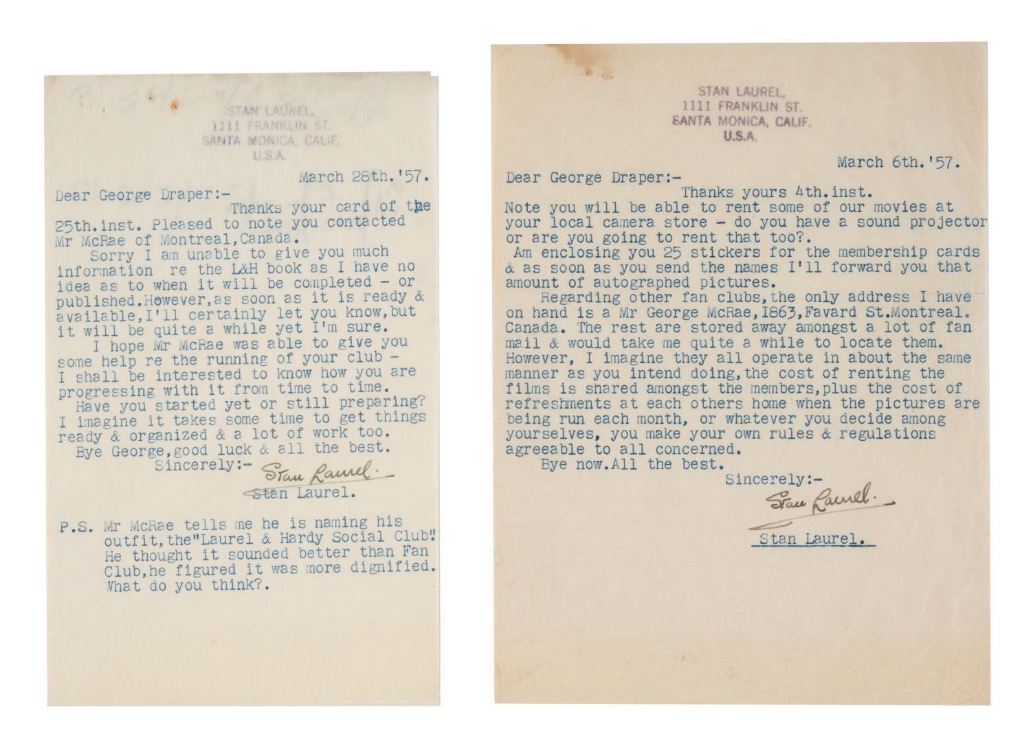 (Stan Laurel, 1957) A pair of typed letters signed by Stan Laurel, with an 8"x10" glossy portrait. The two typed letters were written to a member of a fan club dedicated to the legendary comedian, and signed by Laurel. Measuring 8.5"x6.25" and 8"x5", the papers and photo are in very good condition, exhibiting only the slightest wear from age.