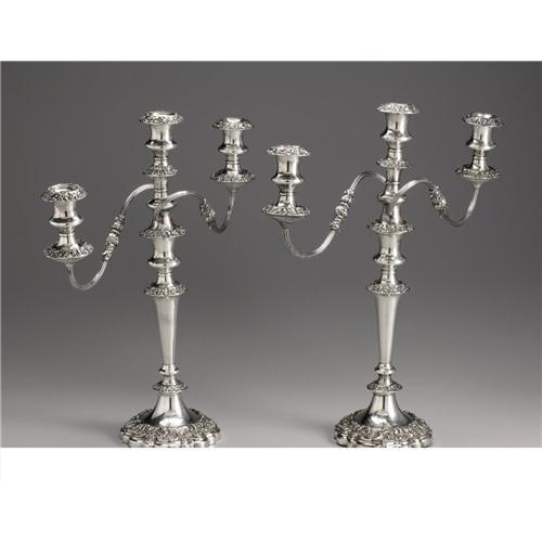 <B>A Pair of Silver Plate Candelabrum</B></I><BR><BR>Unknown maker, possibly American<BR>Twentieth Century<BR>Silver plate<BR>Unmarked<BR>17.75 in. high<BR><BR>Each with three lights, of baluster form with cast scroll and grape vine decoration, with two scrolling arms terminating in rounded pans and nozzles with cast borders, on shaped rounded base.2 <BR><BR><B>Condition Report:</B> Normal signs of wear as appropriate with age. Plating worn.