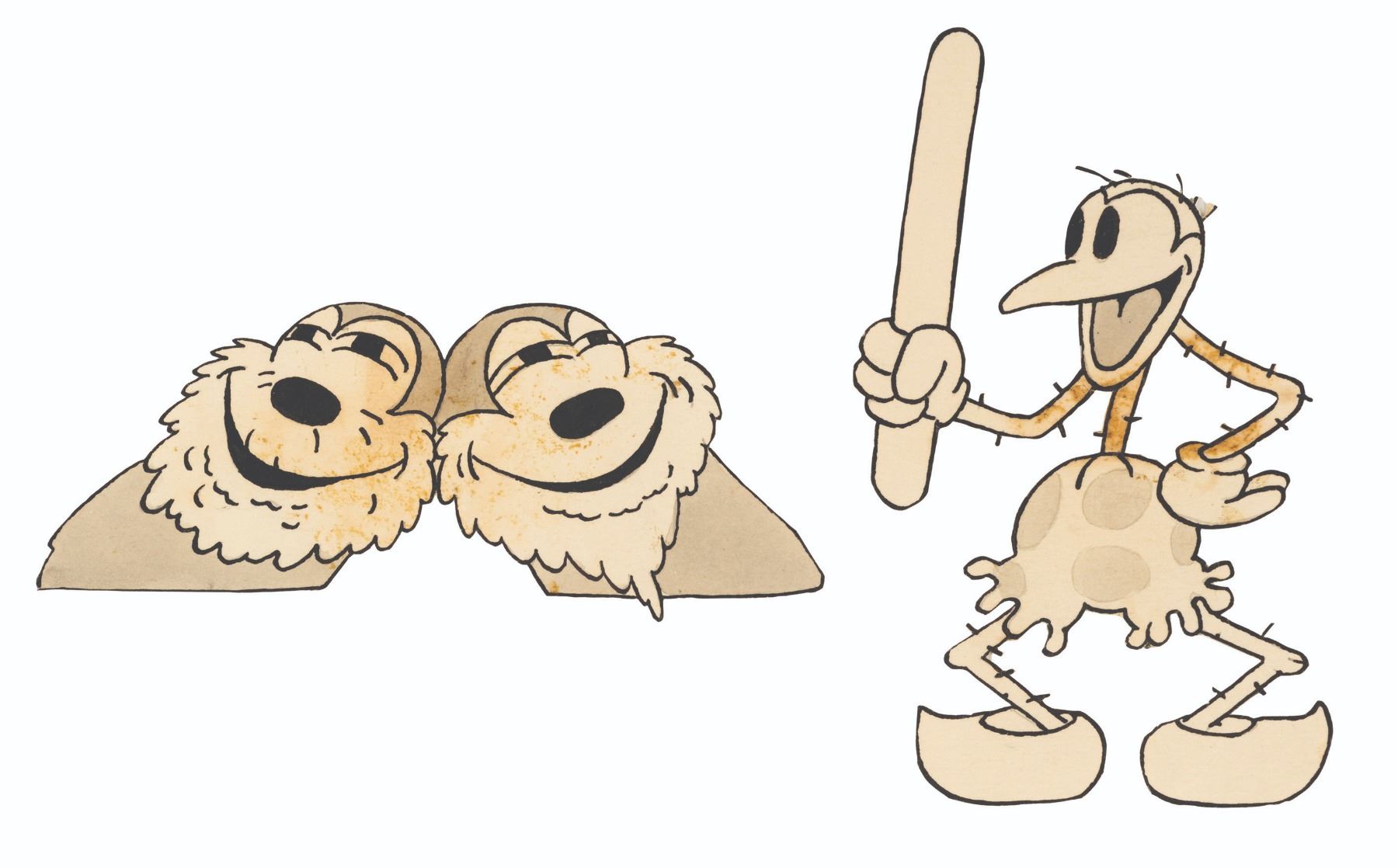 (Harman-Ising, 1931) A pair of original cut-outs that were applied to the background in the Merrie Melodies short “Smile, Darn Ya, Smile!” In the street car scene, after the advertisement parodies are cel animated, these cut-outs replace the cels as the camera pans left. Accomplished in ink and watercolor on artboard and measuring 1.” x 4.5” and 3.5” x 2.5”, the cut-outs are in good production-used condition with light edge wear, adhesive residue, and light discoloration from age.