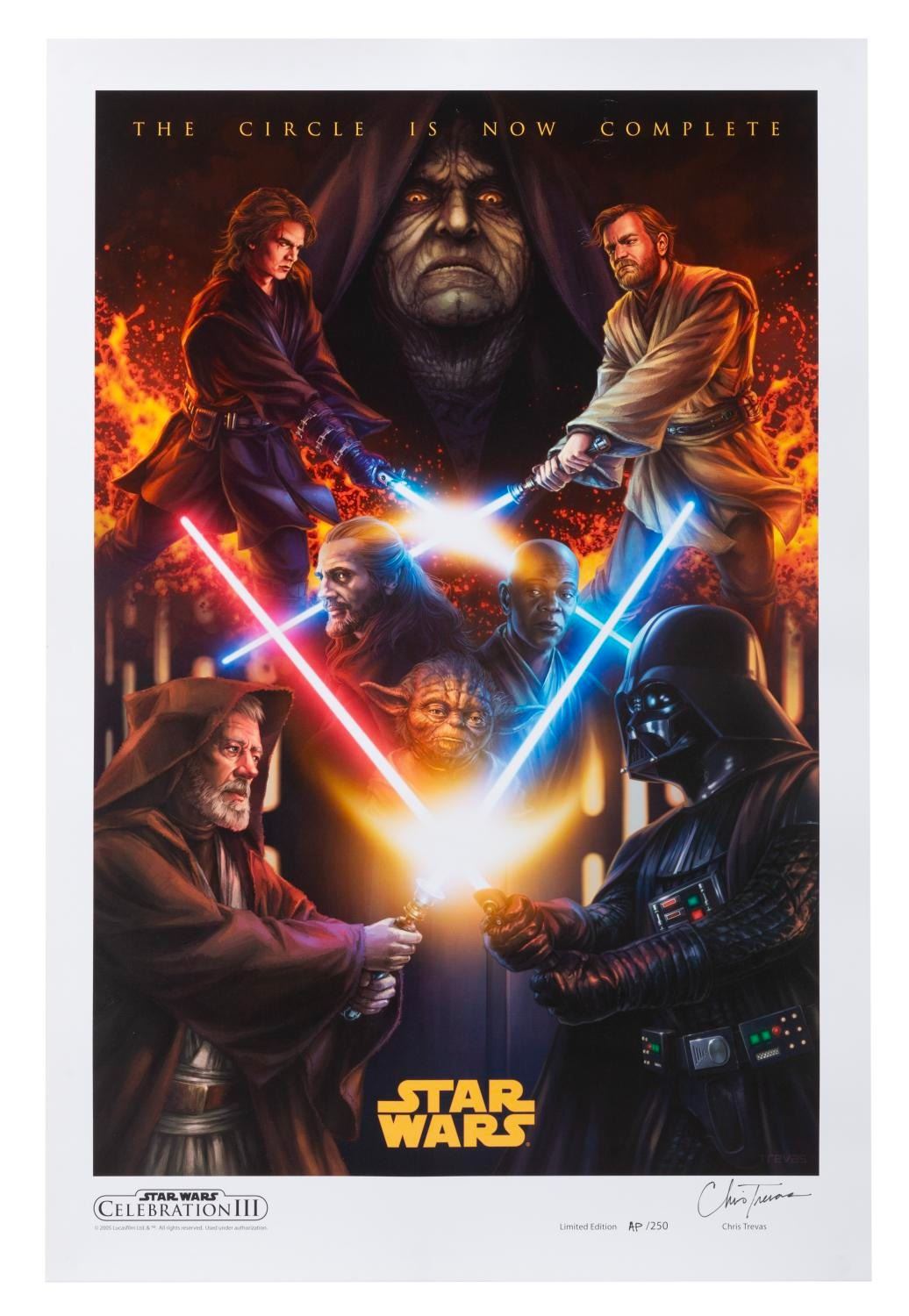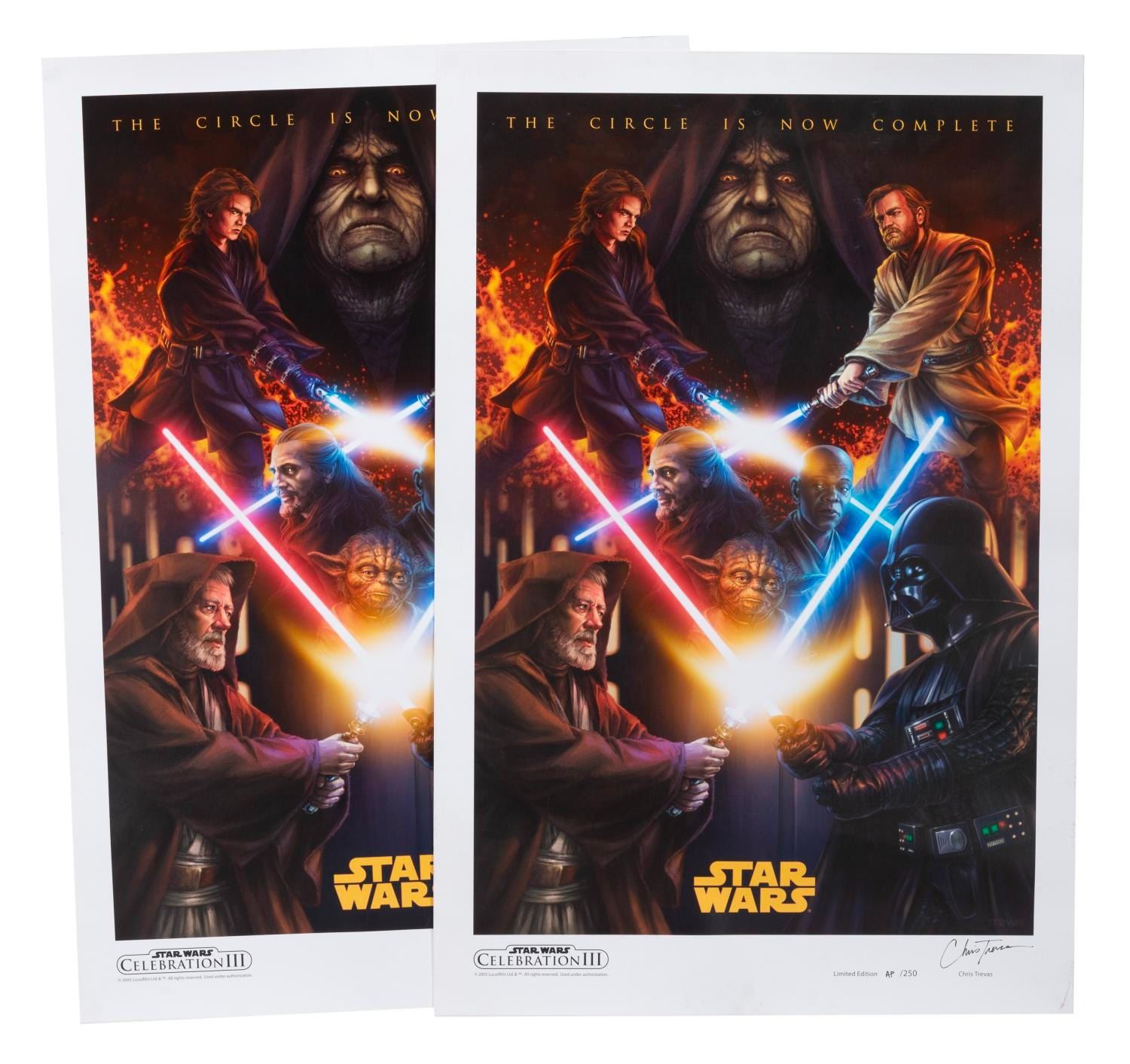 (Lucasfilm Ltd., 2005) A pair of artist’s proofs for limited edition prints by artist Chris Trevas, released at the Star Wars Celebration III. The art depicts the prequel trilogy’s heroes and villains, as well as Obi-Wan and Darth Vader’s fight from the original trilogy. Trevas signed the pieces in black ink at the bottom right corners. With an image size of 14” x 21” and measuring 16” x 24” overall, the prints are in good to very good condition with light scuffs, stains, and wear.