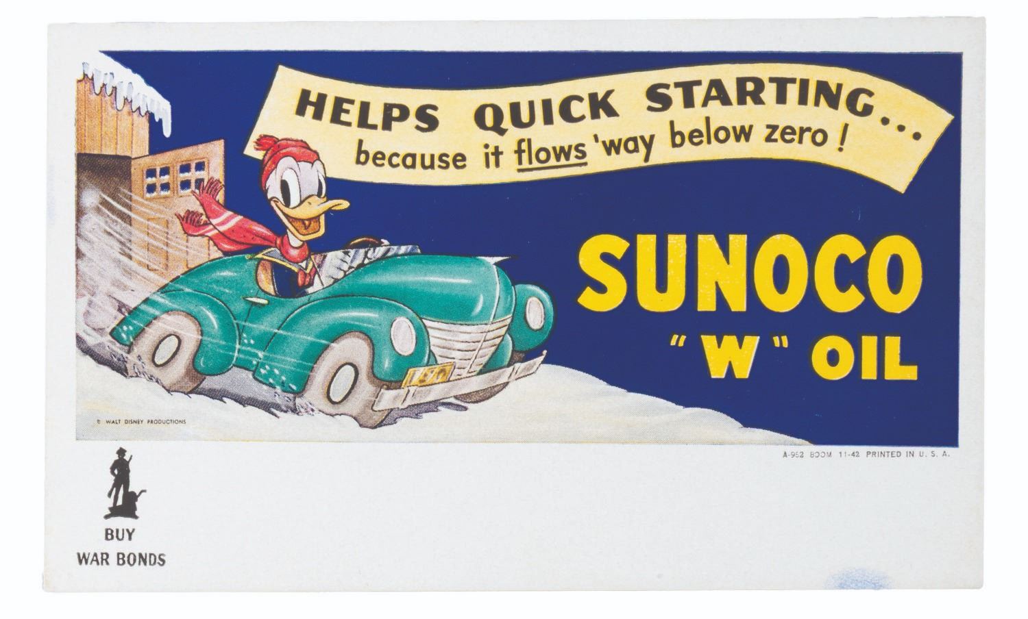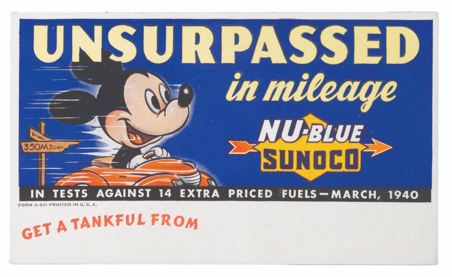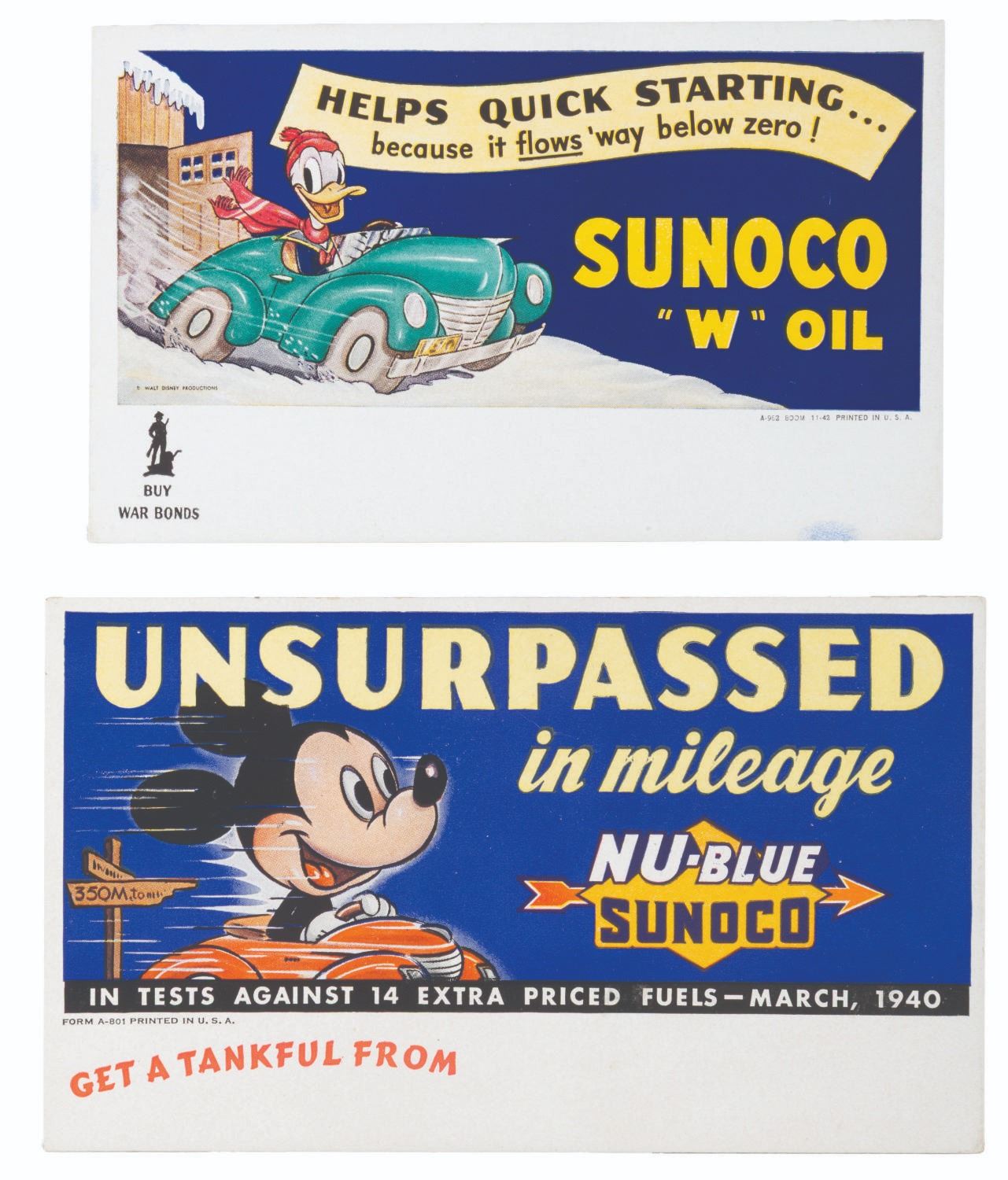 (Sunoco, 1940s) A pair of Sunoco Oil Disney-themed advertising ink blotter cards featuring Mickey Mouse and Donald Duck. Measuring 3.75" x 6" to 4" x 6.75", the cards are in fine condition.
