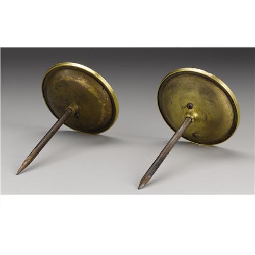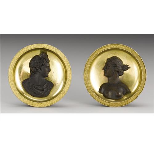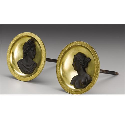<B>A Pair of French Empire Gilt and Patinated Bronze Drapery Holders</B></I><BR><BR>Attributed to Pierre-Philippe Thomire (1751-1843), Paris, France<BR>Circa 1800-10<BR>Gilt and patinated bronze, steel<BR>Unmarked<BR>4.25 in. diameter<BR><BR>Each of concave form with outer border with incised palmettes on reeded ground, framed with beading; the centers with applied 3/4 profiles of a man and woman in classical pose respectively, with screw in steel spikes.<BR> <BR>