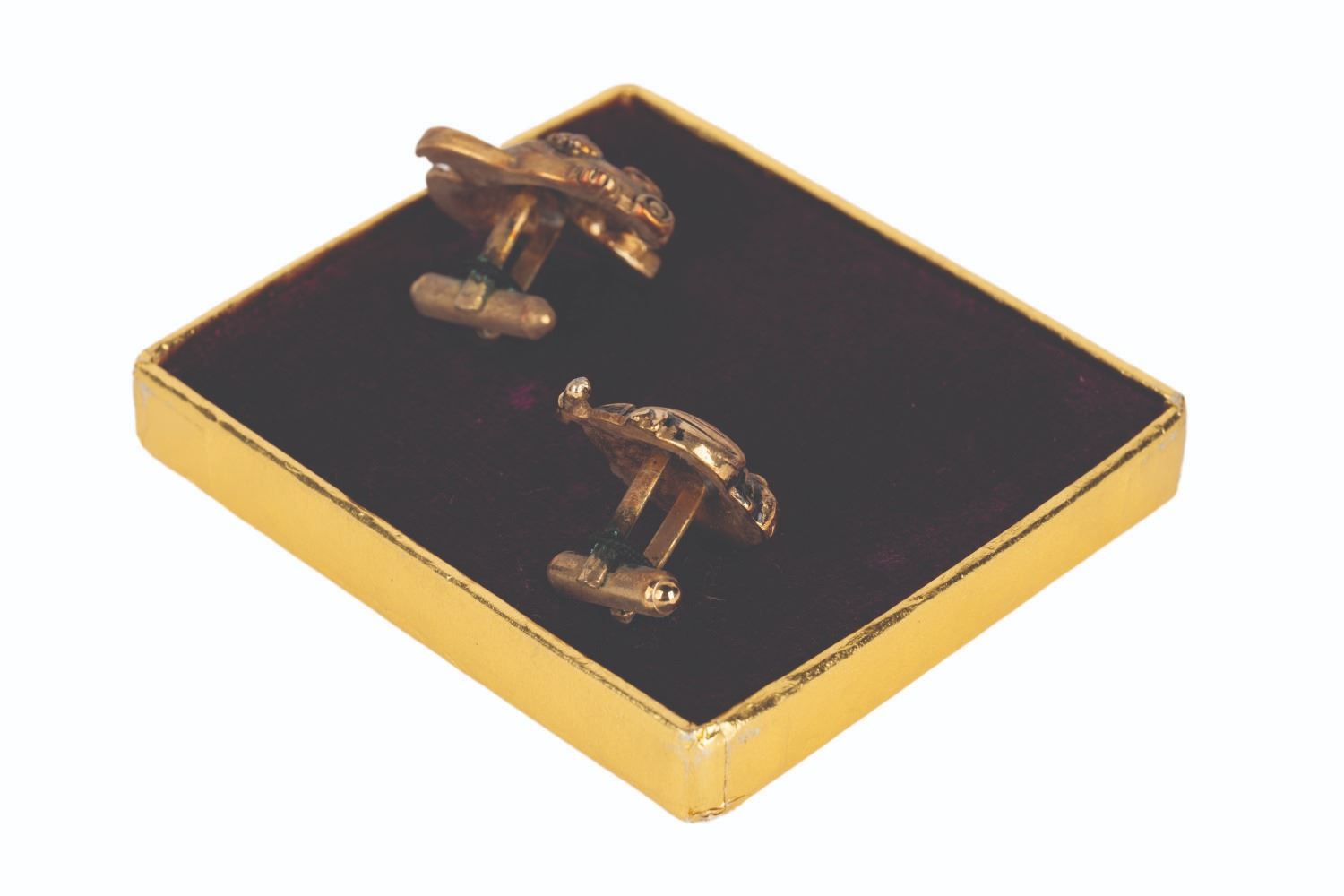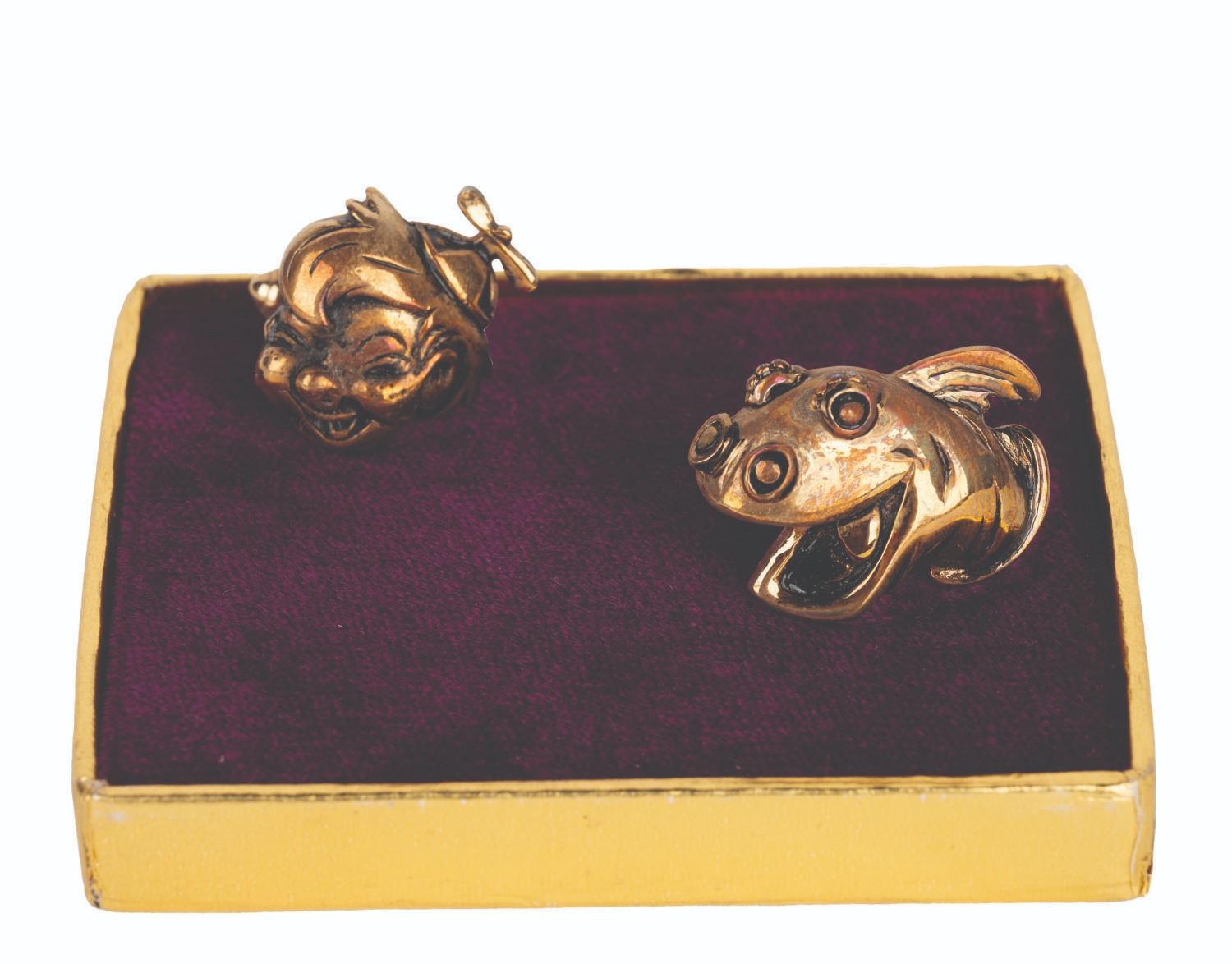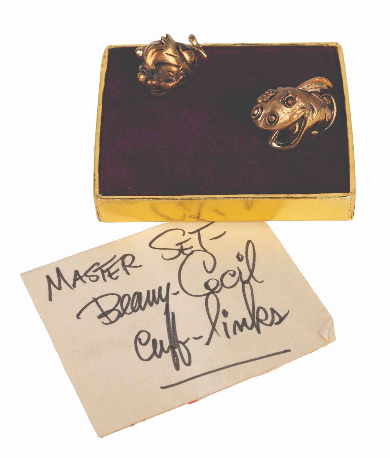 (Clampett, 1960s) The master set of “Beany and Cecil” cufflinks produced by Bob Clampett as a gift for crew and friends of the show. Included is a note which reads "MASTER SET - Beany - Cecil Cuff-links" written in black ink by Clampett. Measuring 0.75” x 1” wide, the brass-colored cufflinks are in very good condition with tarnishing.