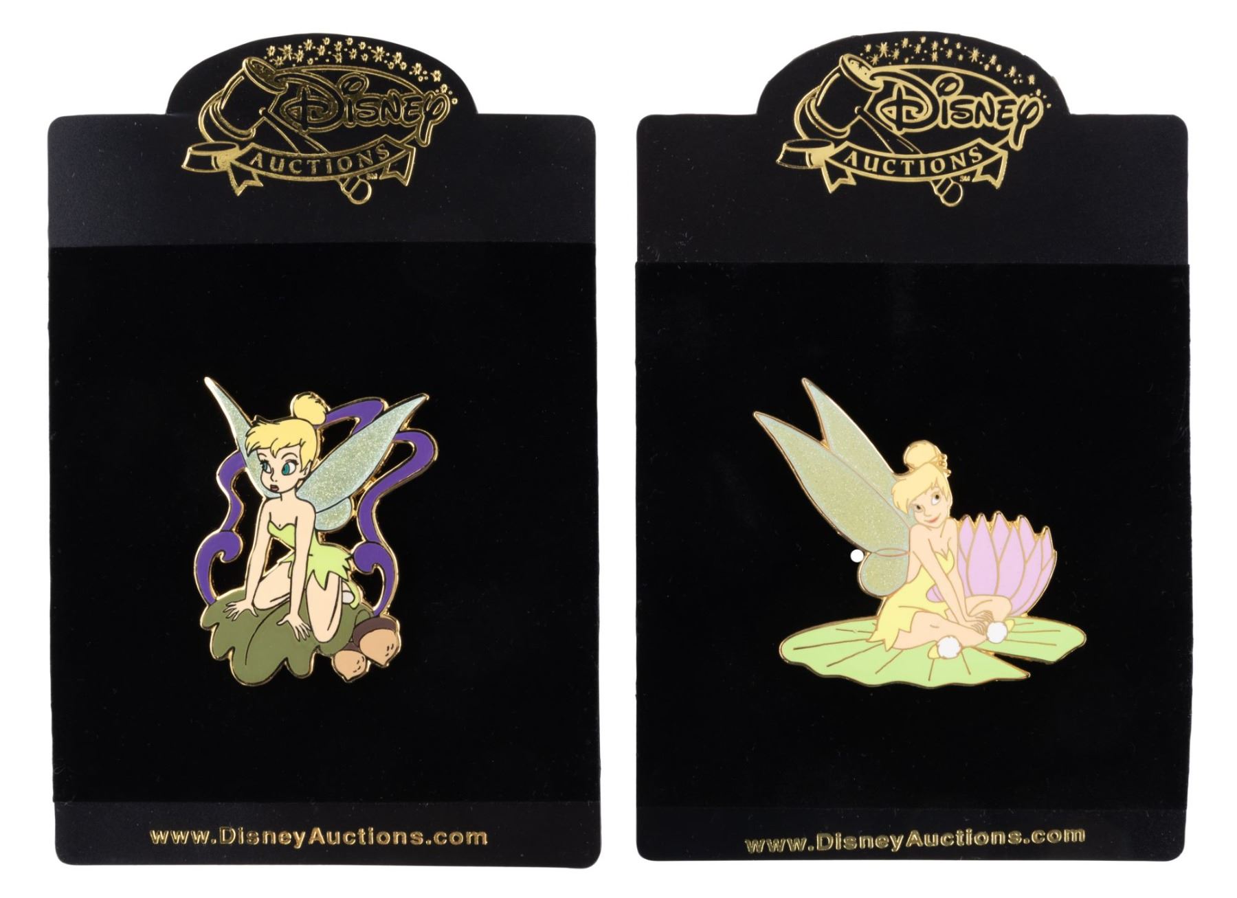 (Disney, 2004) A pair of Disney Auctions Tinker Bell pins including Tinker Bell on a lily pad, released in a limited edition of 1000, and Tinker Bell kneeling on a leaf, released in a limited edition of 250. The pins are in very good unused condition and come on their original cards.