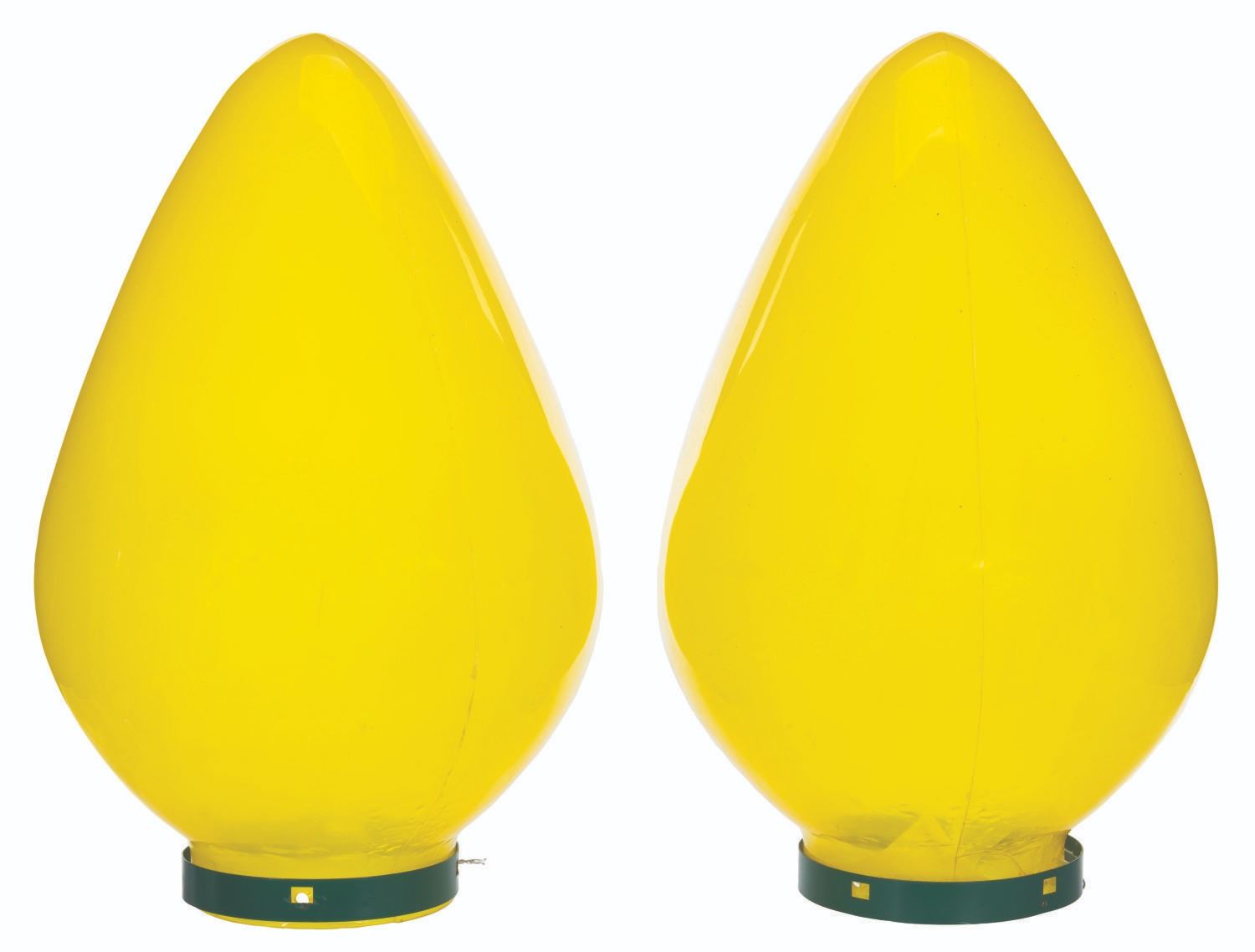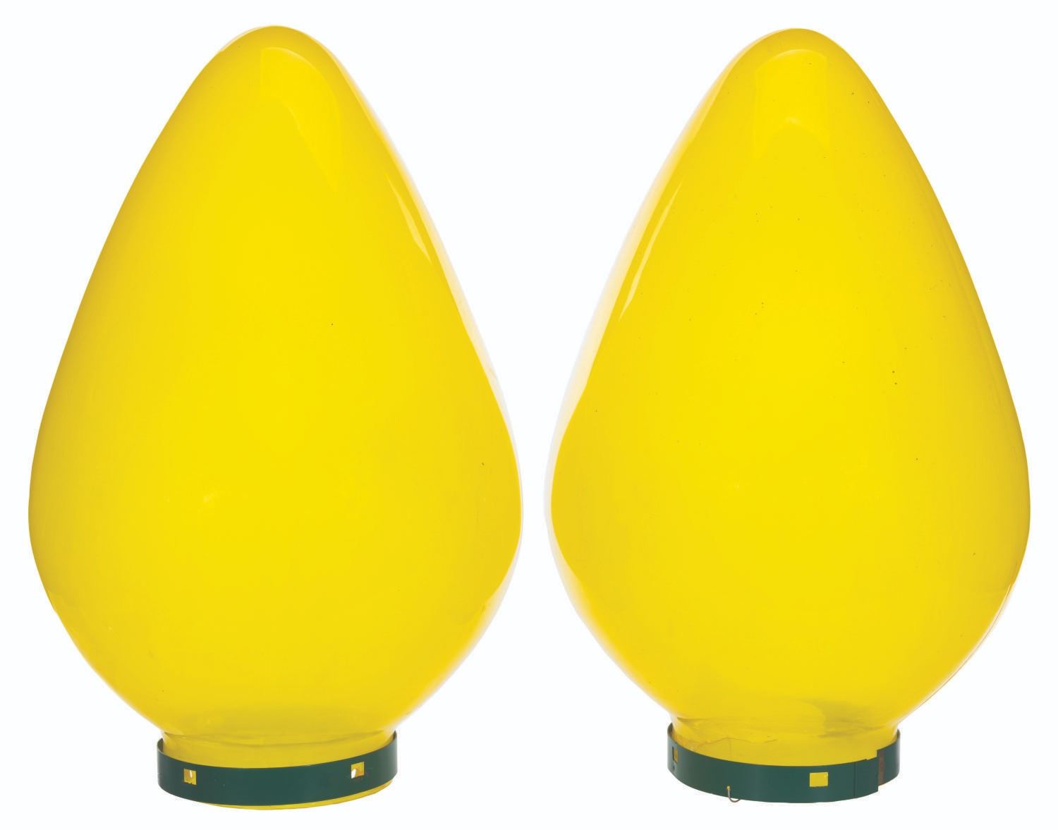 (Walt Disney World, 2018) A pair of large yellow light props from Toy Story Land in Disney’s Hollywood Studios. This style of light is held by Jessie and Rex above the Slinky Dog Dash attraction and are seen hanging overhead throughout the land. Measuring 21" tall and 12" in diameter, the large plastic lights are in very good condition with typical wear from Park use.