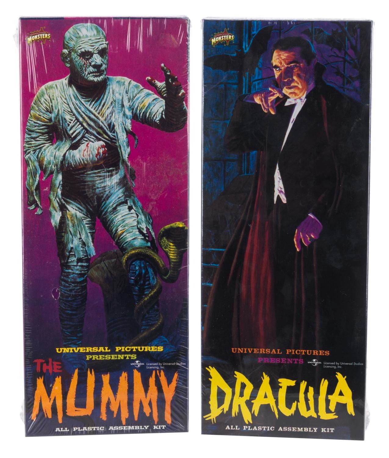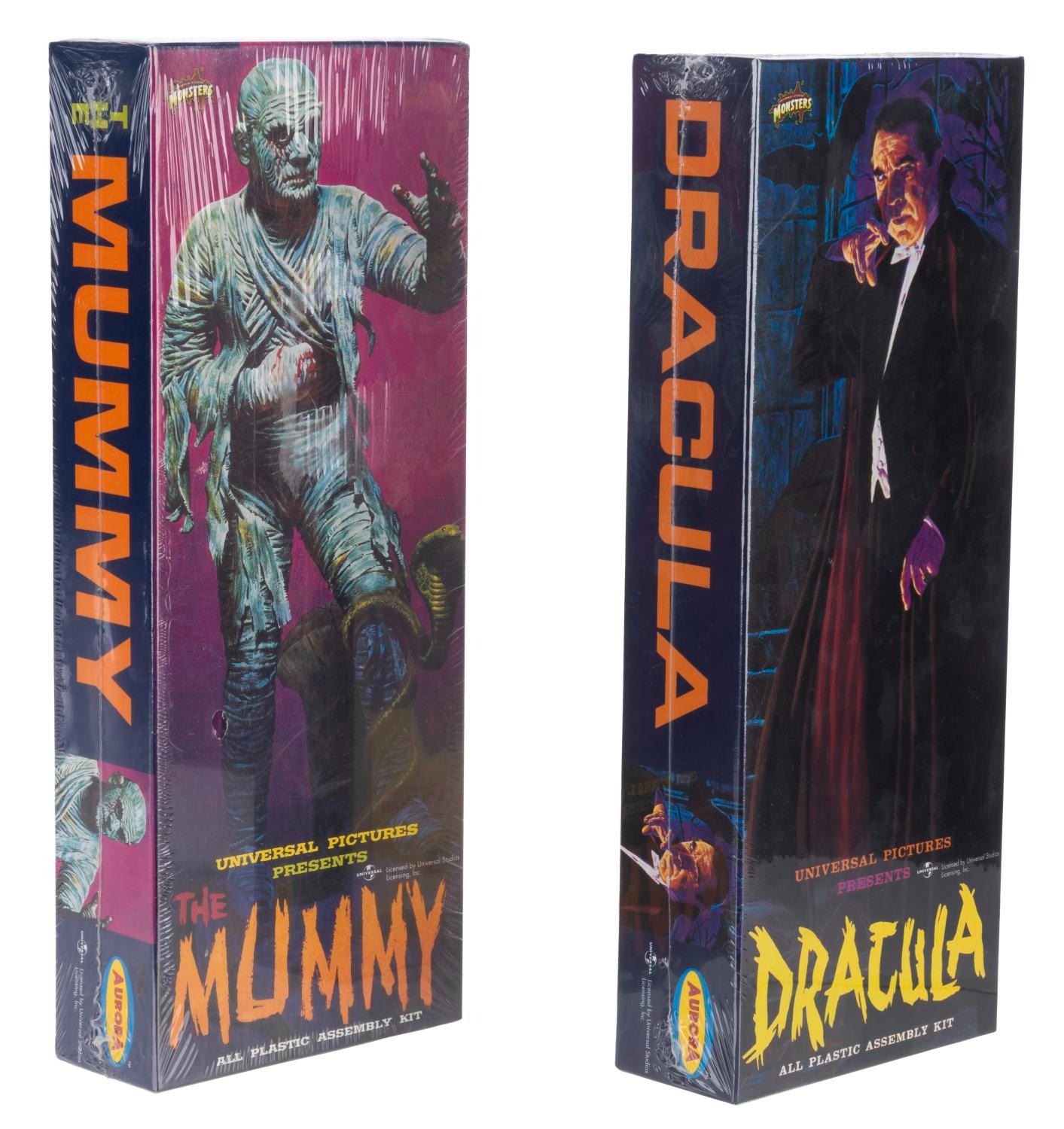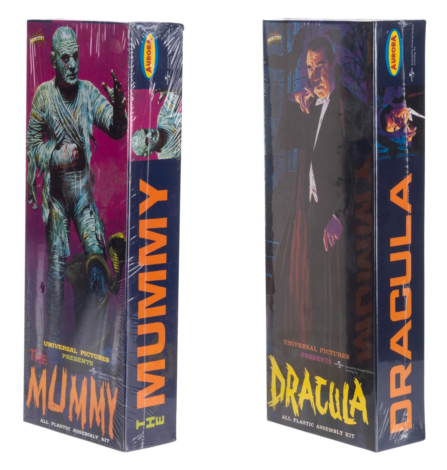 (Aurora, 1999) A pair of reissues of Aurora’s classic Universal model kits, exclusively available at Toys R Us in 1999. Included are Dracula and The Mummy. The models are in fine unopened condition.