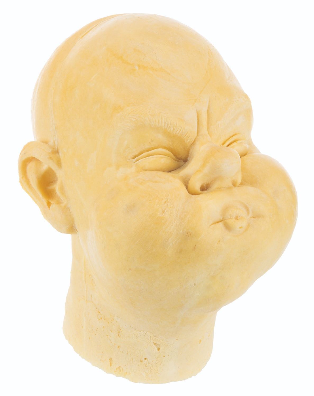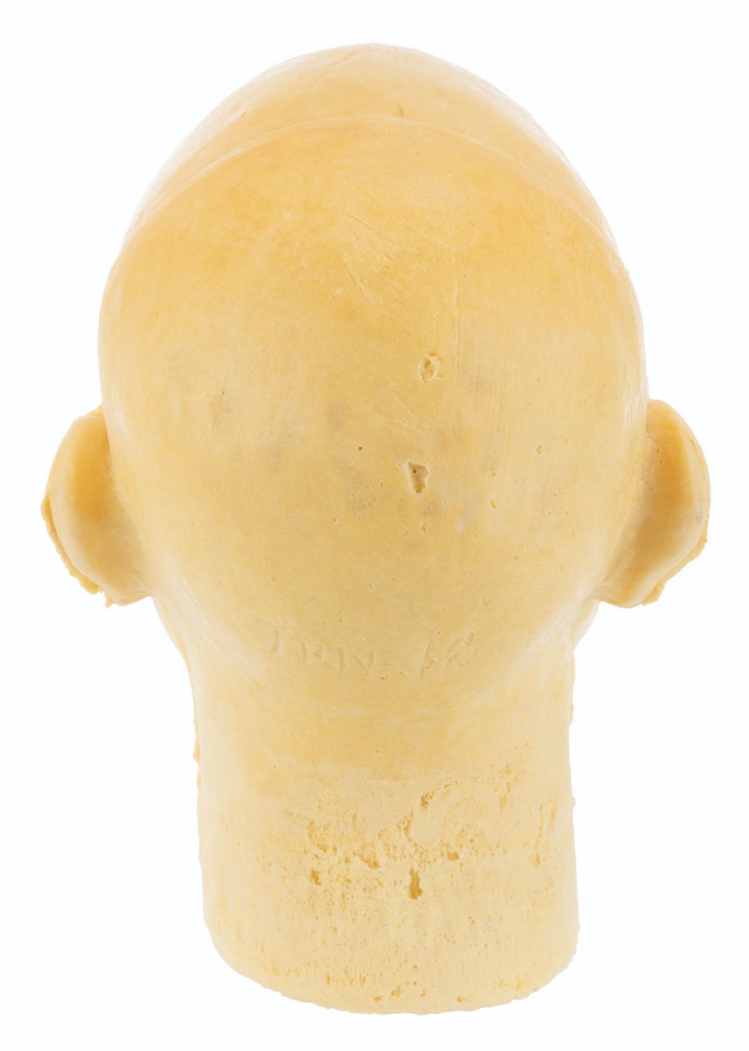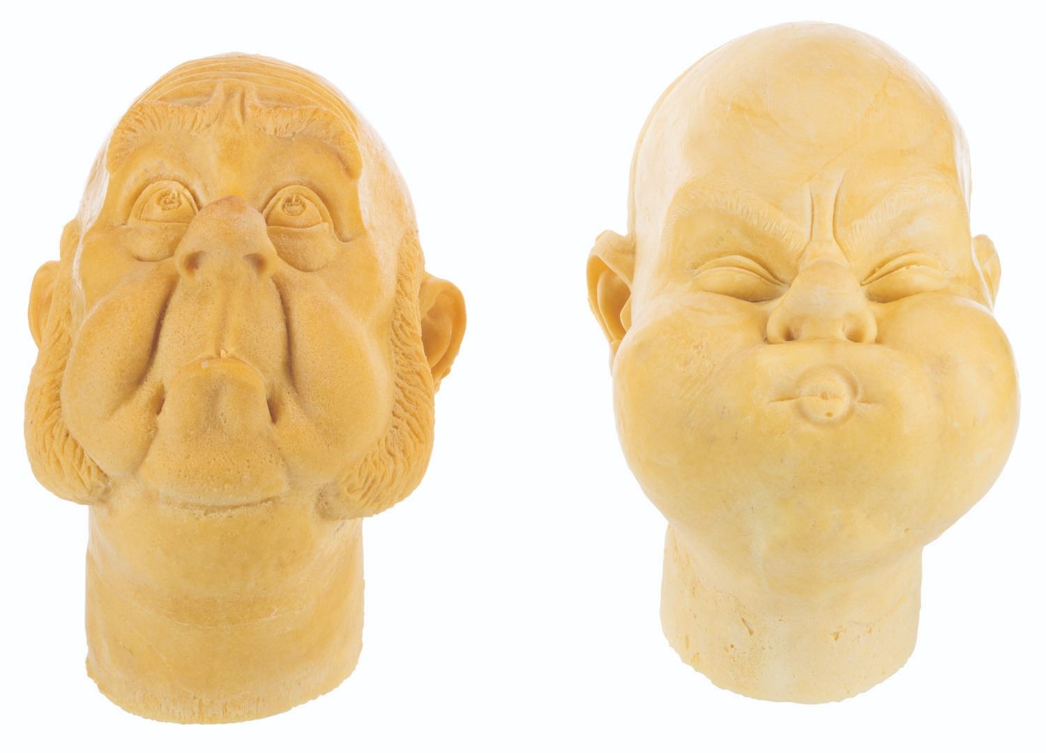 (EPCOT, 1982-1996) A pair of foam test heads used in creating Audio-Animatronics at Epcot. One head is marked "TRN16" (for the Transportation Pavilion), indicating that it is from the World of Motion attraction. The World of Motion brought Guests on an Audio-Animatronic-assisted journey through the past, present, and future of transportation. Measuring 6.5" x 9.25" x 11" and 7" x 8.5" x 11.25", the heads display in very good, production-used condition with light handling wear, scratches, and nicks.