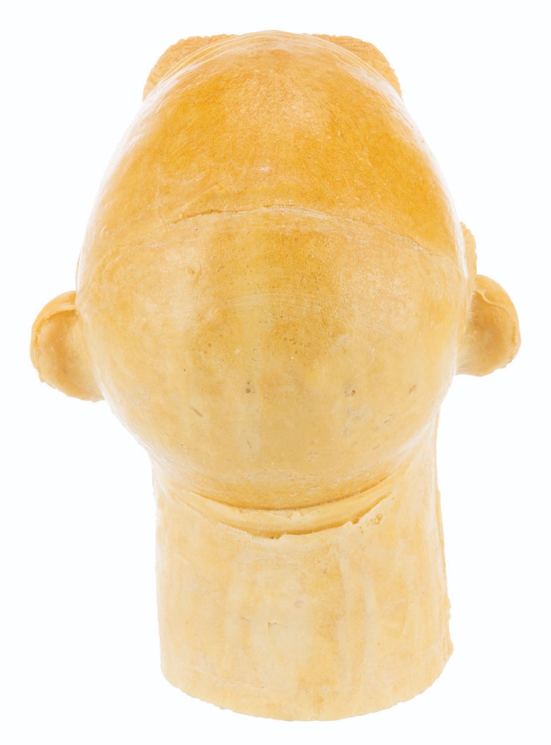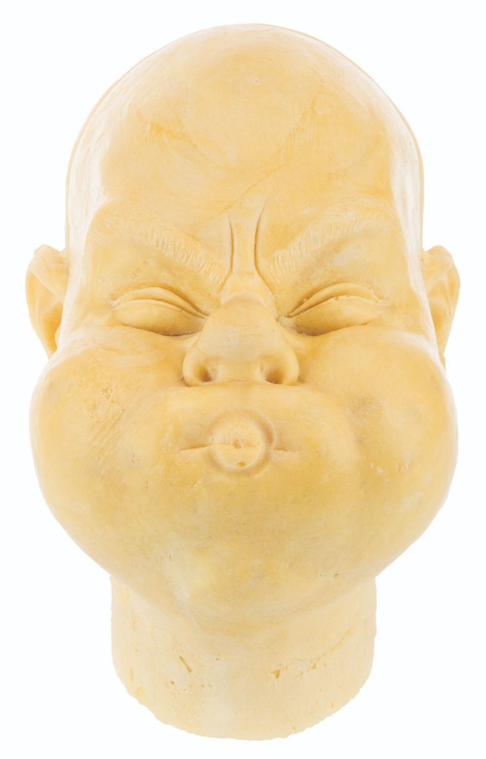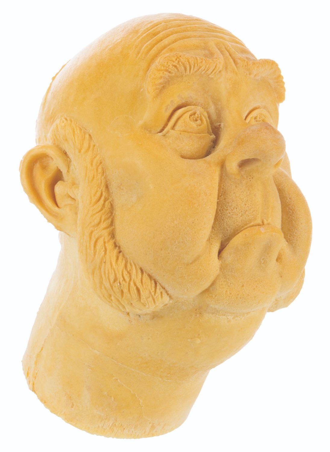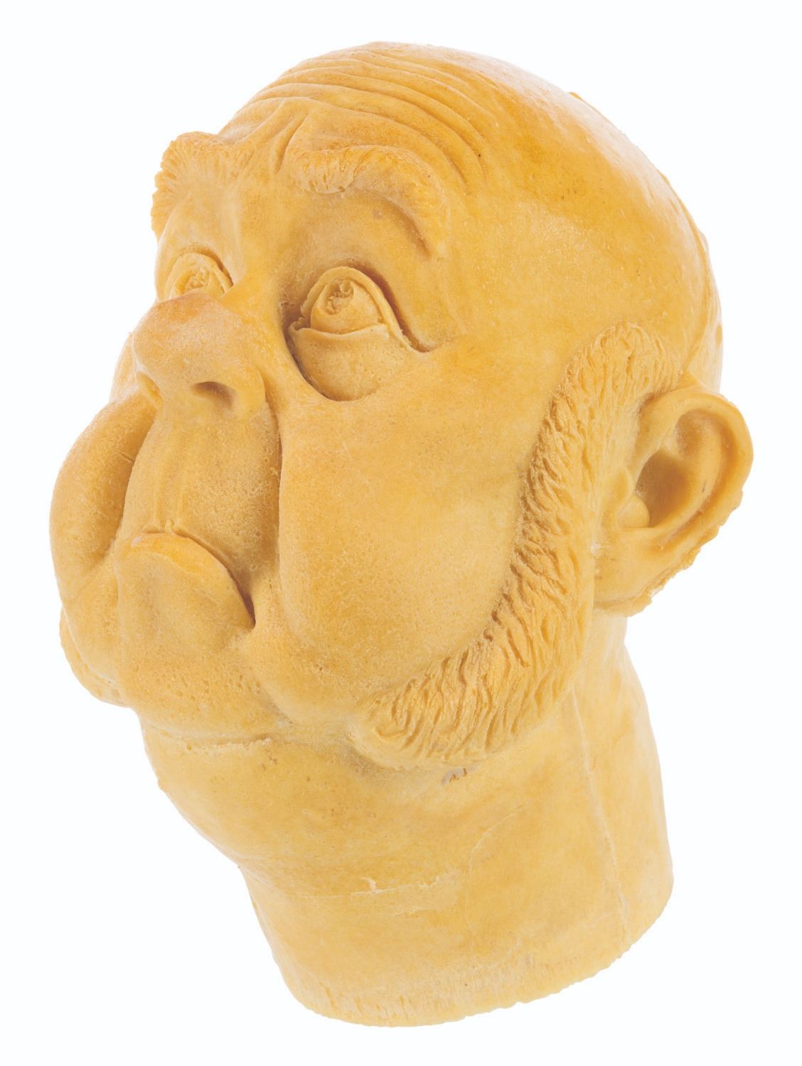(EPCOT, 1982-1996) A pair of foam test heads used in creating Audio-Animatronics at Epcot. One head is marked "TRN16" (for the Transportation Pavilion), indicating that it is from the World of Motion attraction. The World of Motion brought Guests on an Audio-Animatronic-assisted journey through the past, present, and future of transportation. Measuring 6.5" x 9.25" x 11" and 7" x 8.5" x 11.25", the heads display in very good, production-used condition with light handling wear, scratches, and nicks.